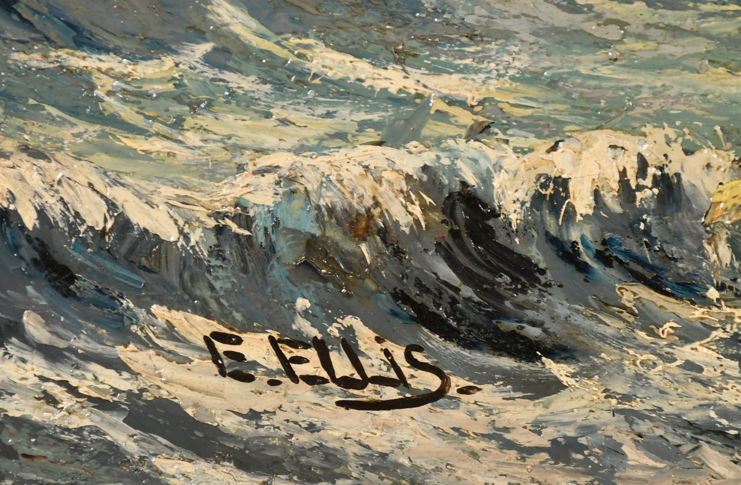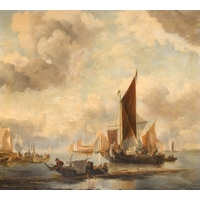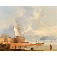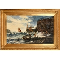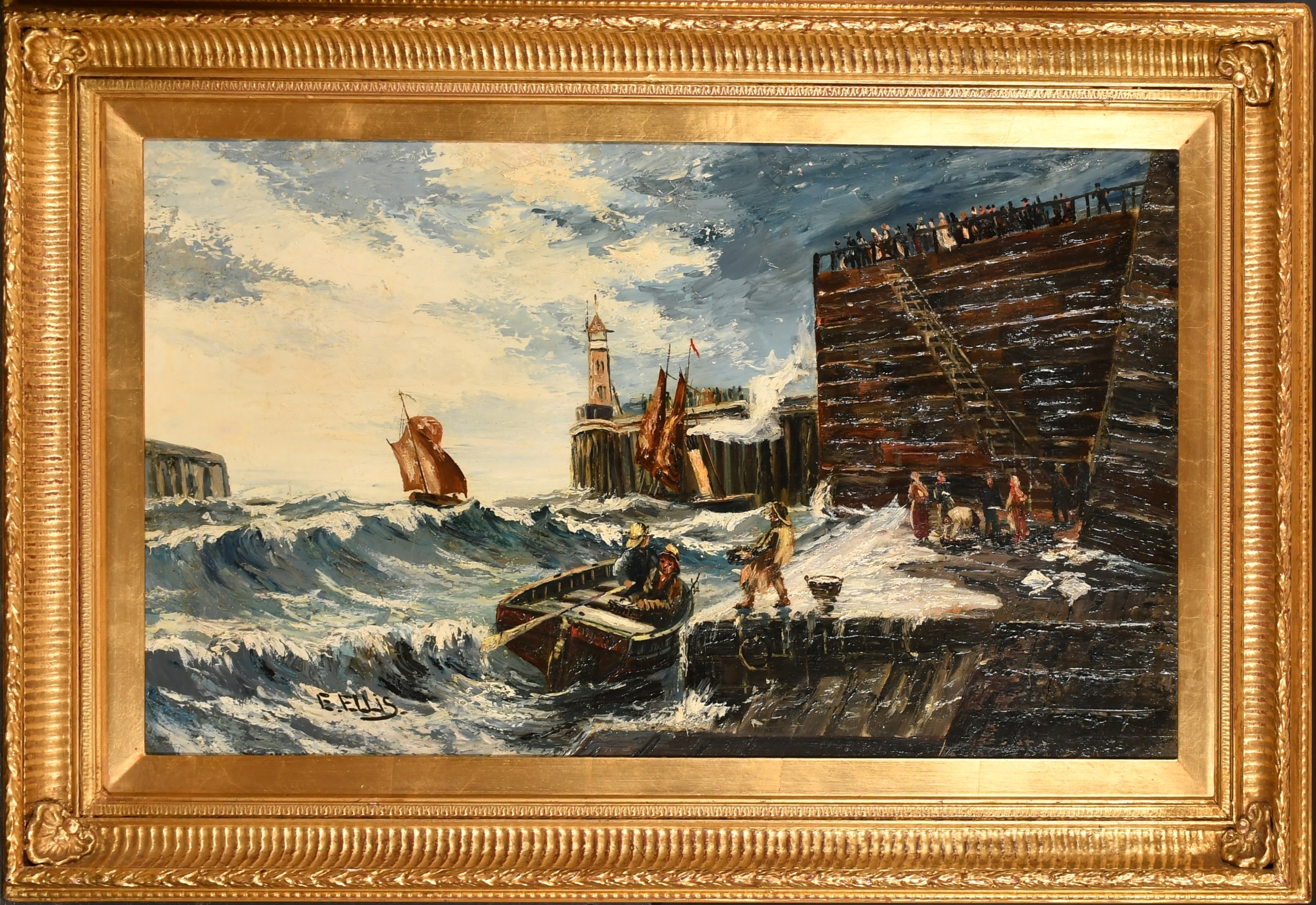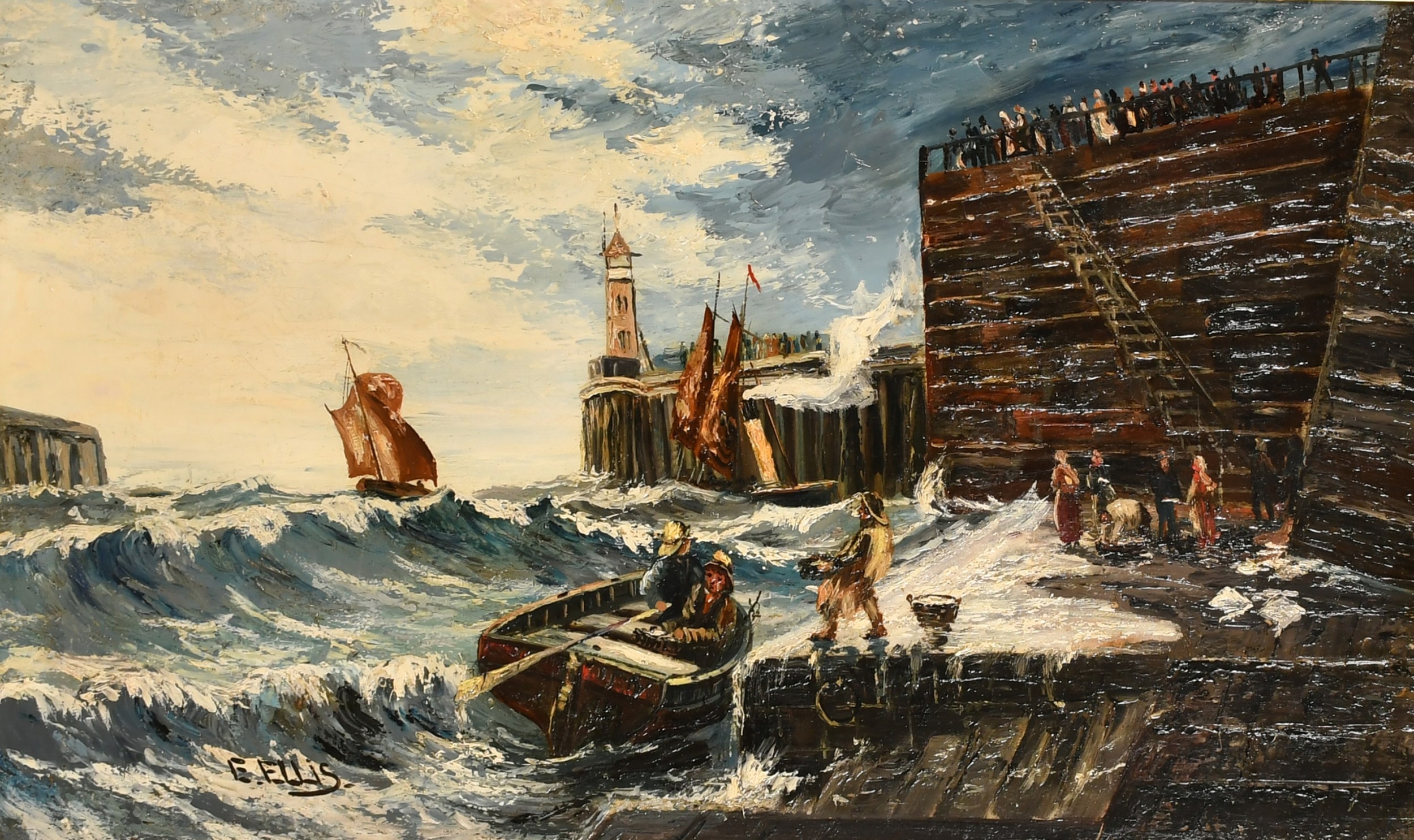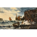 Edwin John Ellis (1842-1895) British. Unloading the Catch by a Harbour Wall, Oil on canvas, Signed, 18" x 32" (45.7 x 81.3cm)