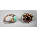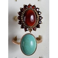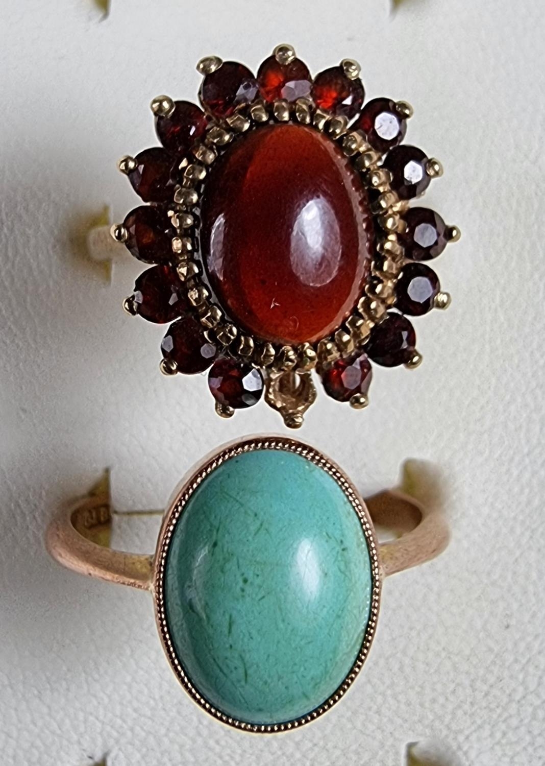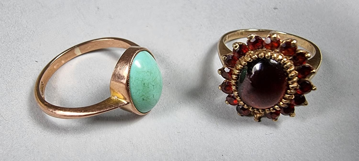 A 9ct rose gold turquoise ring, size R and a 9ct gold garnet cluster ring, size N 1/2, 7.2 gm.