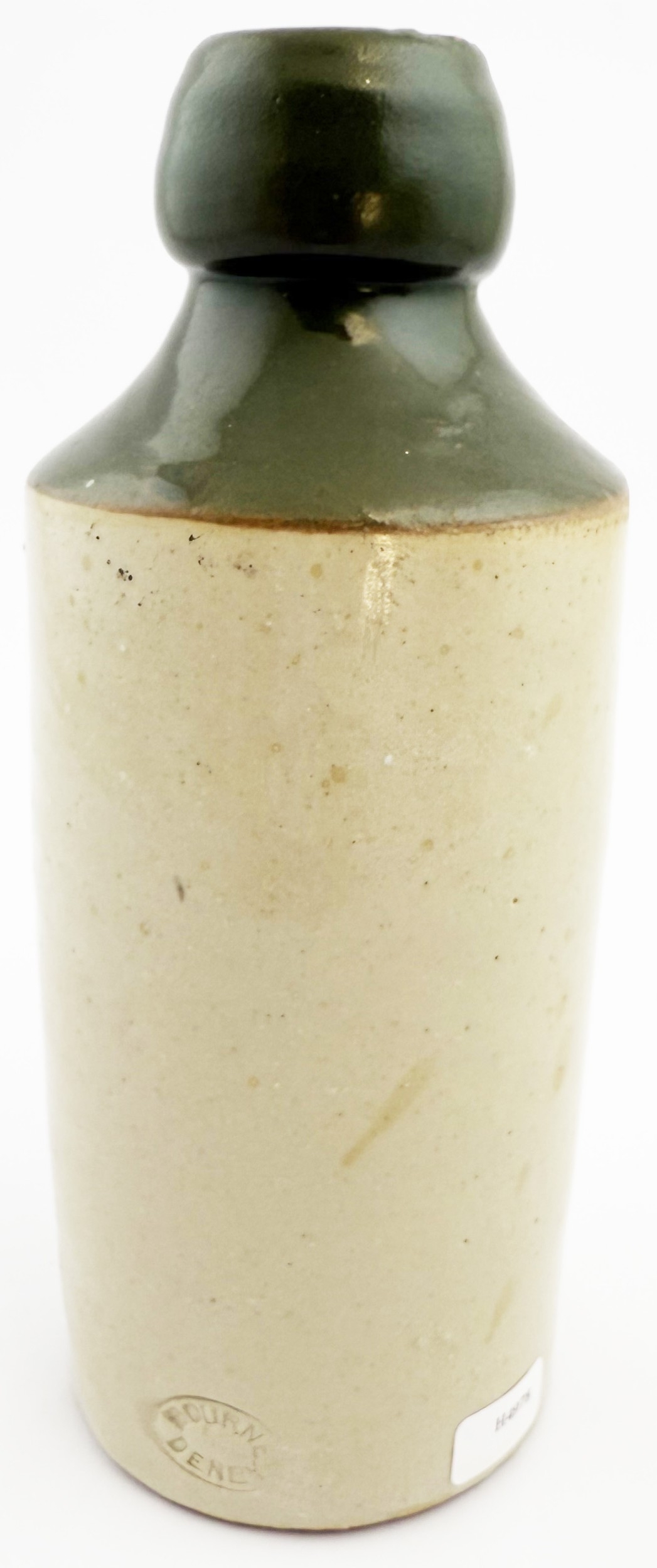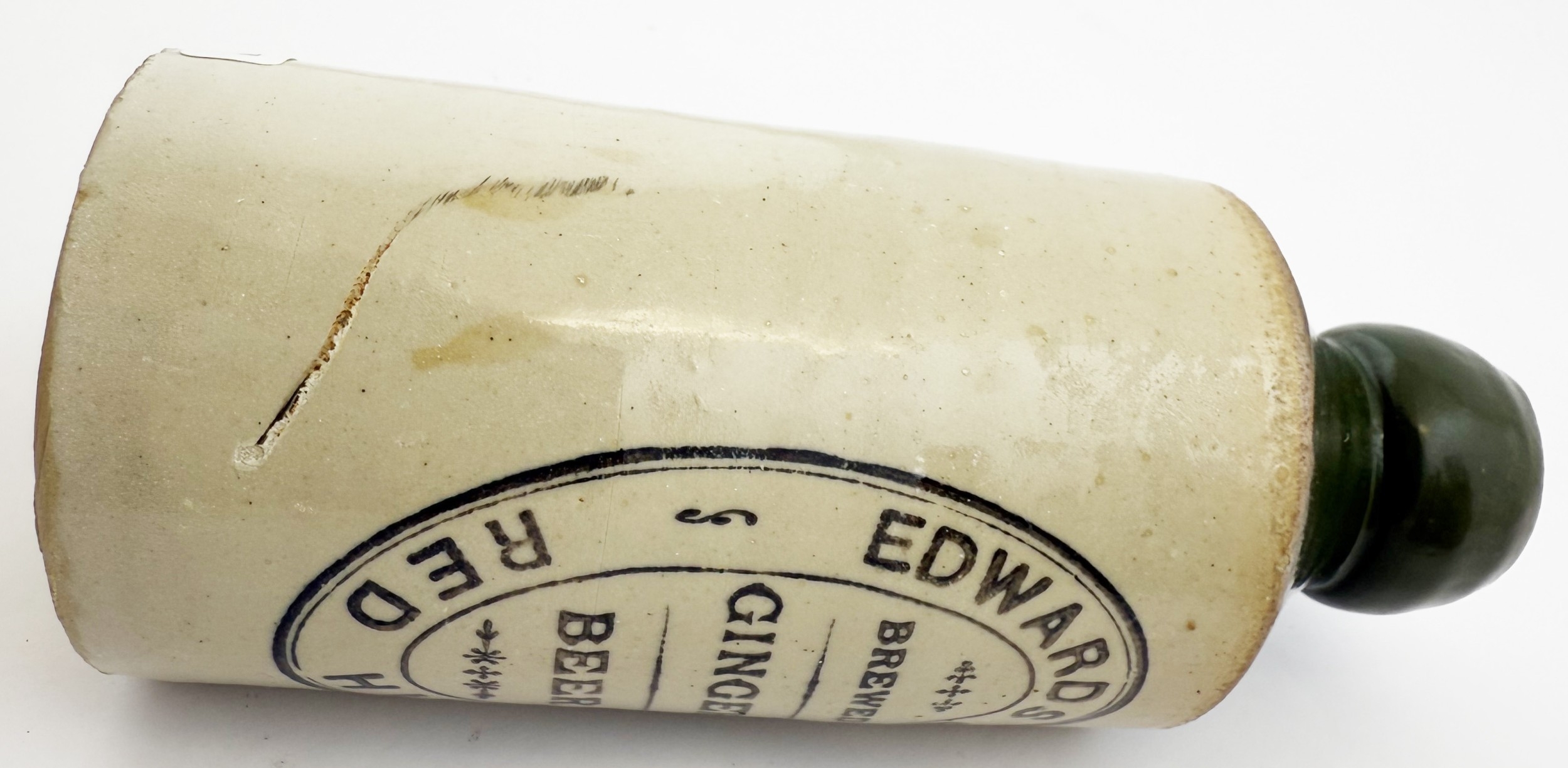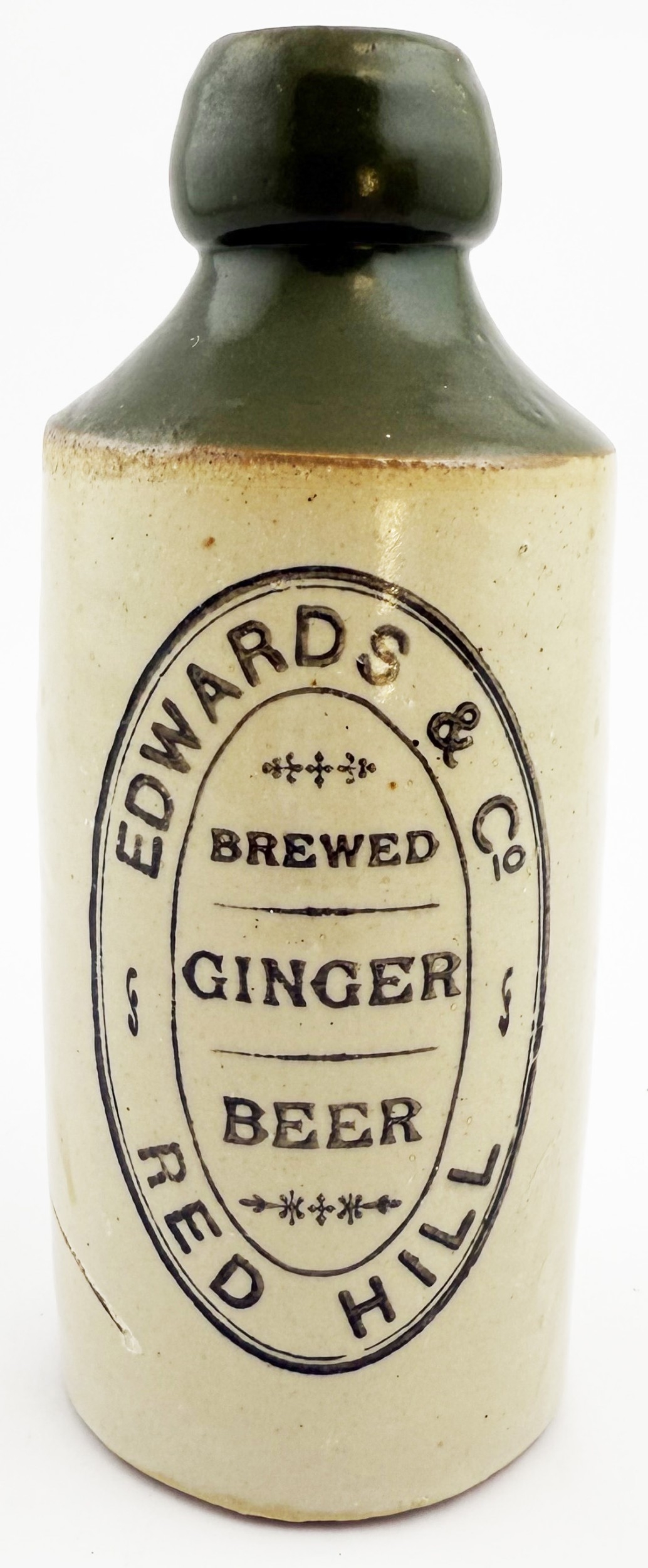 RED HILL GINGER BEER BOTTLE. 6.75ins tall. Std, t.t, green top, black transfer. EDWARDS & CO/ BREWED/ GINGER/ BEER. Bourne Denby p.m. Surface scratch to side.