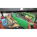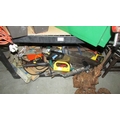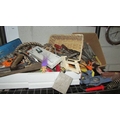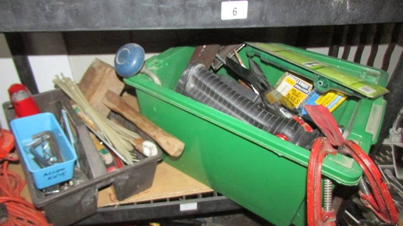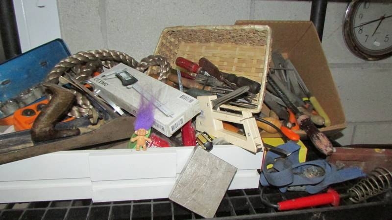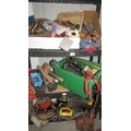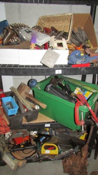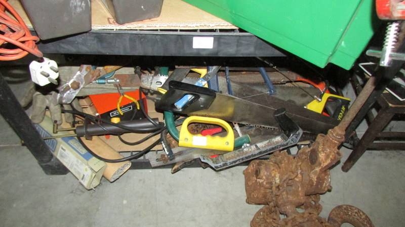 Three shelves of workshop tools including block and tackle etc., (Collect only)
