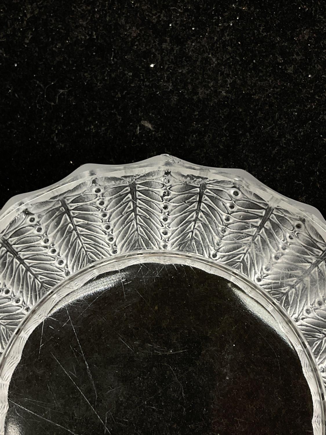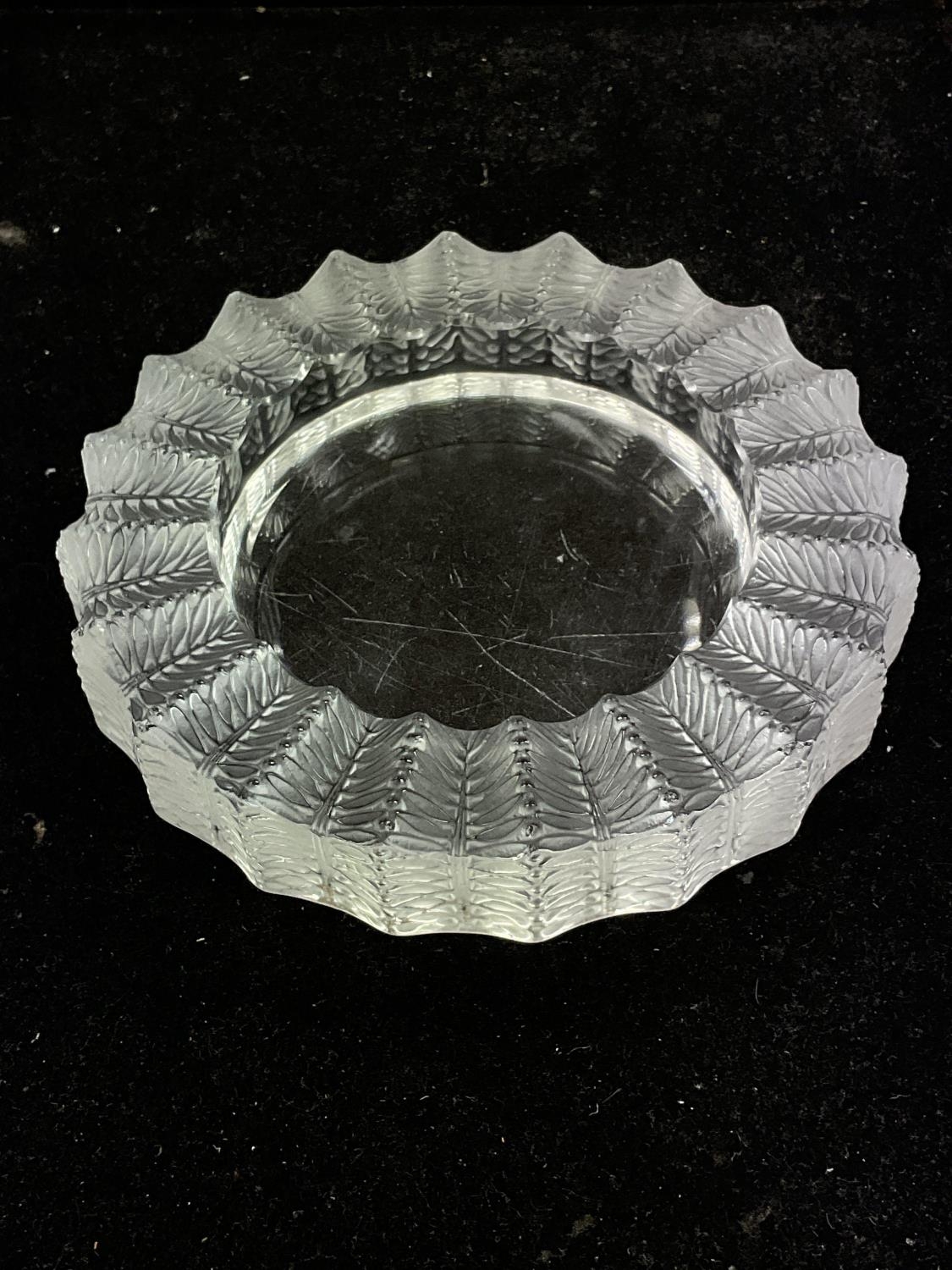A Lalique Jamaique pattern shallow glass dish, with frosted foliage to the rim. Signed on the base.