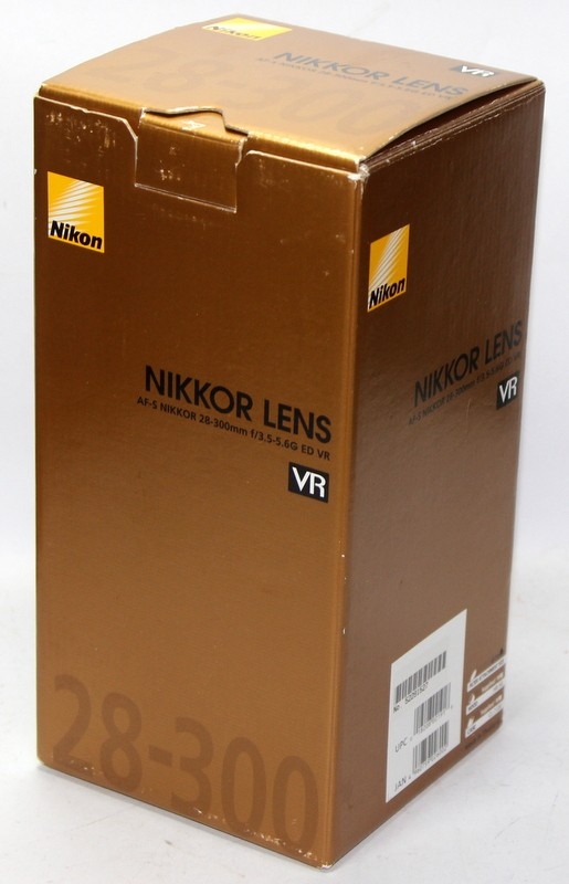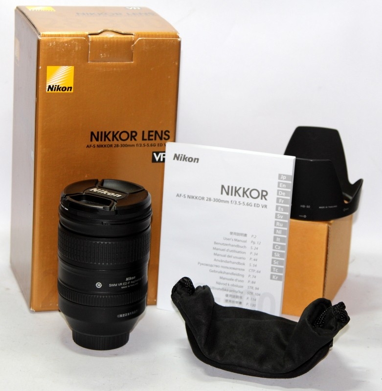 Nikon Nikkor AF-S 28-300mm F3.5-5.6G ED VR zoom lens. Presents as unused and boxed with accessories.