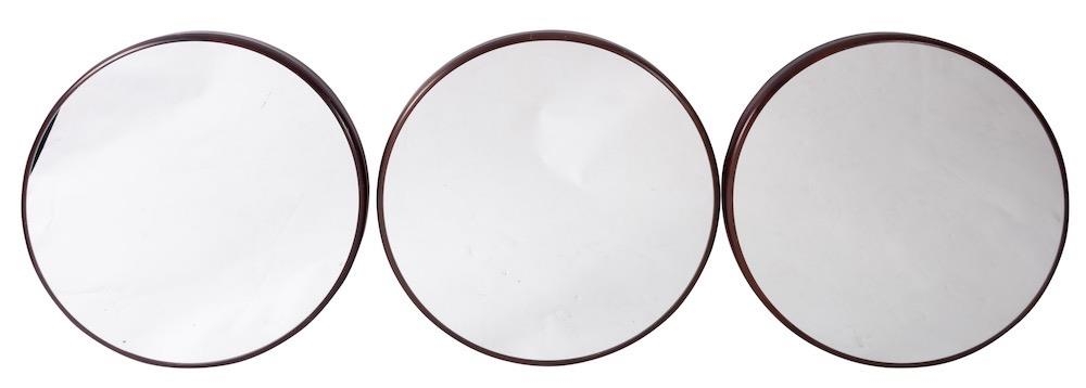 A set of three stained wood framed circular wall mirrors, later 20th century; 64cm overall diameter