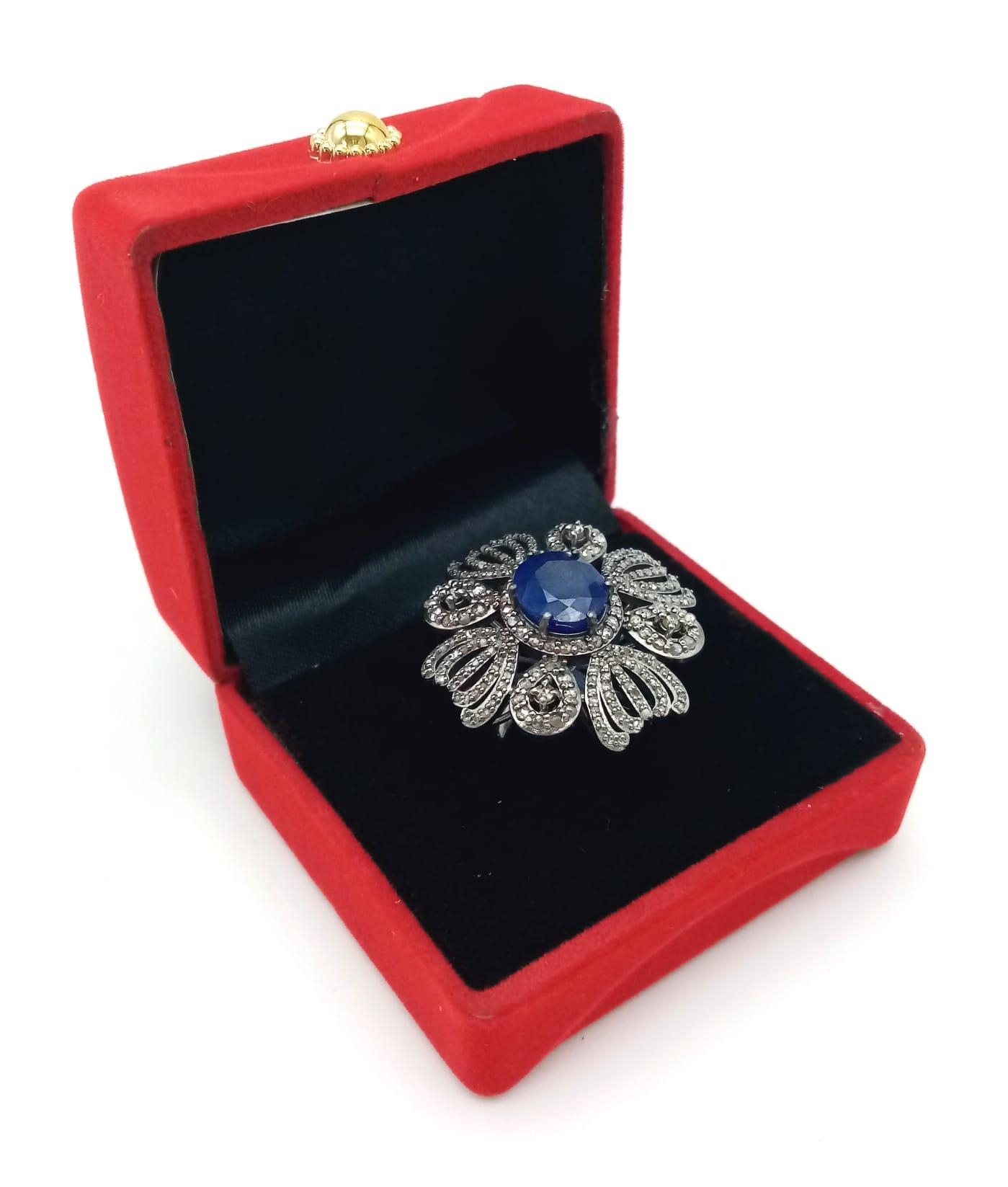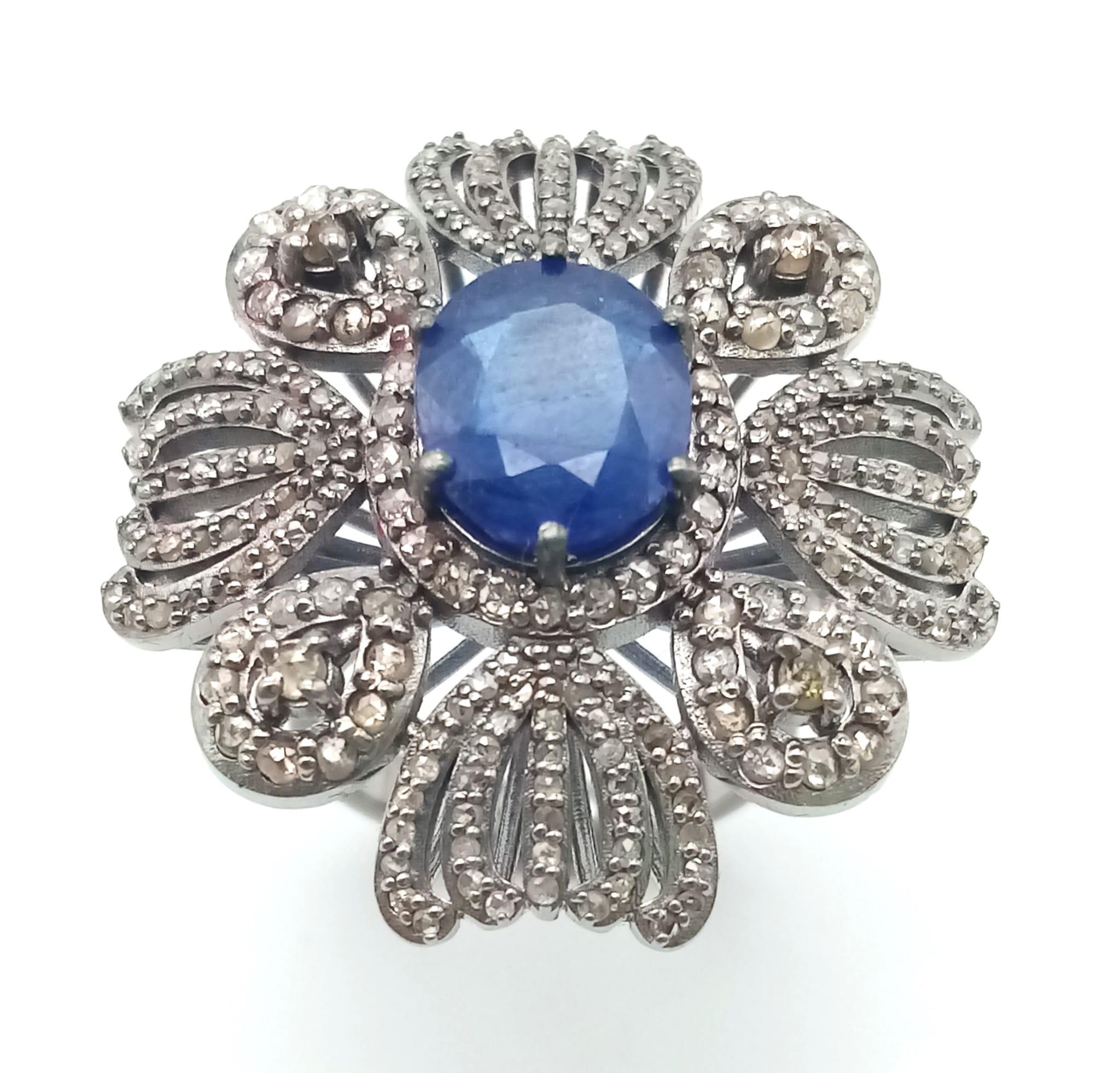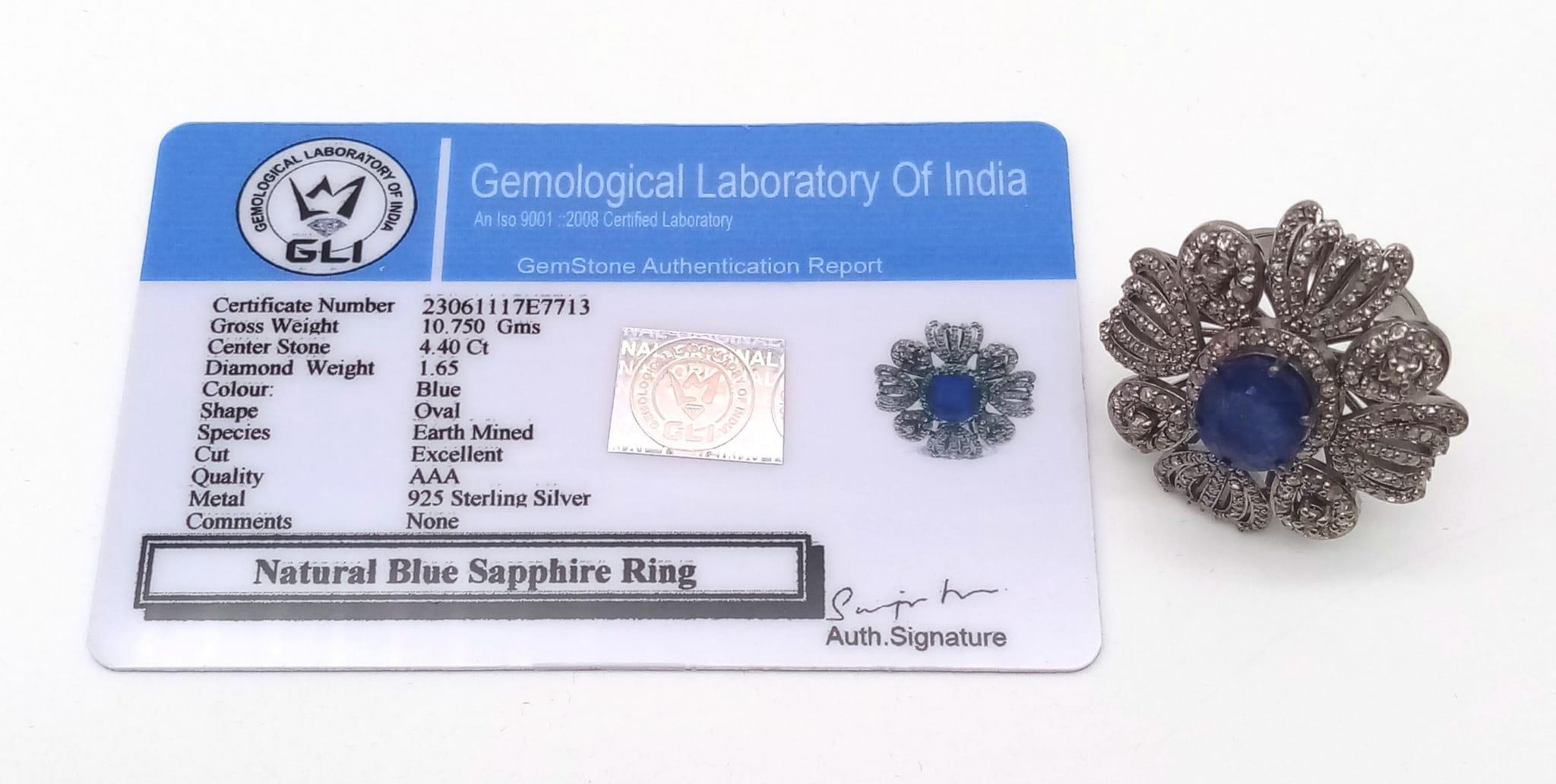 A 10.75ct Blue Sapphire Gemstone Ring with 1.65ct Diamond Accents. Set in 925 Silver. Size N. 10.78g total weight. Comes with a presentation case and certificate.
