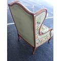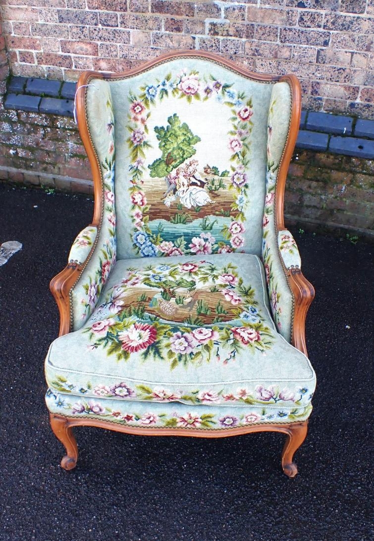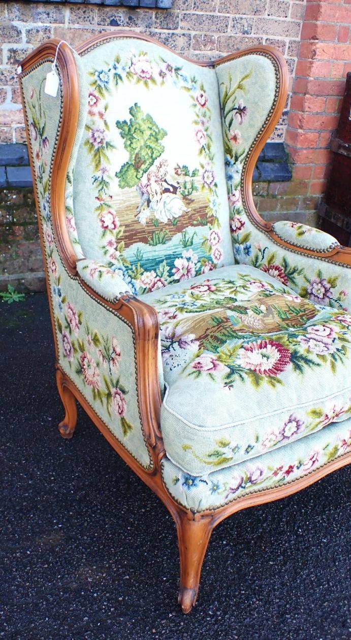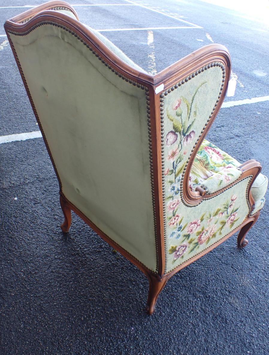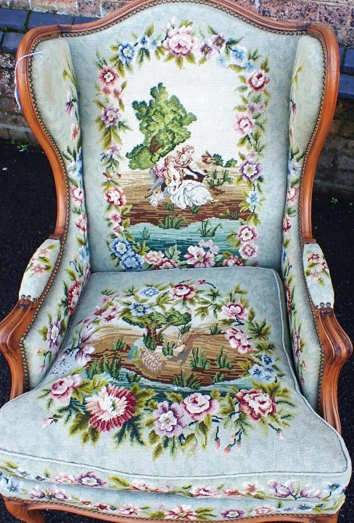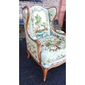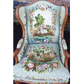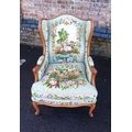 A LOUIS XV STYLE WING ARMCHAIR with pale beech frame and green wool work upholstery wit Aesop's fable scene; 'The hare and the tortoise' 73cm wide