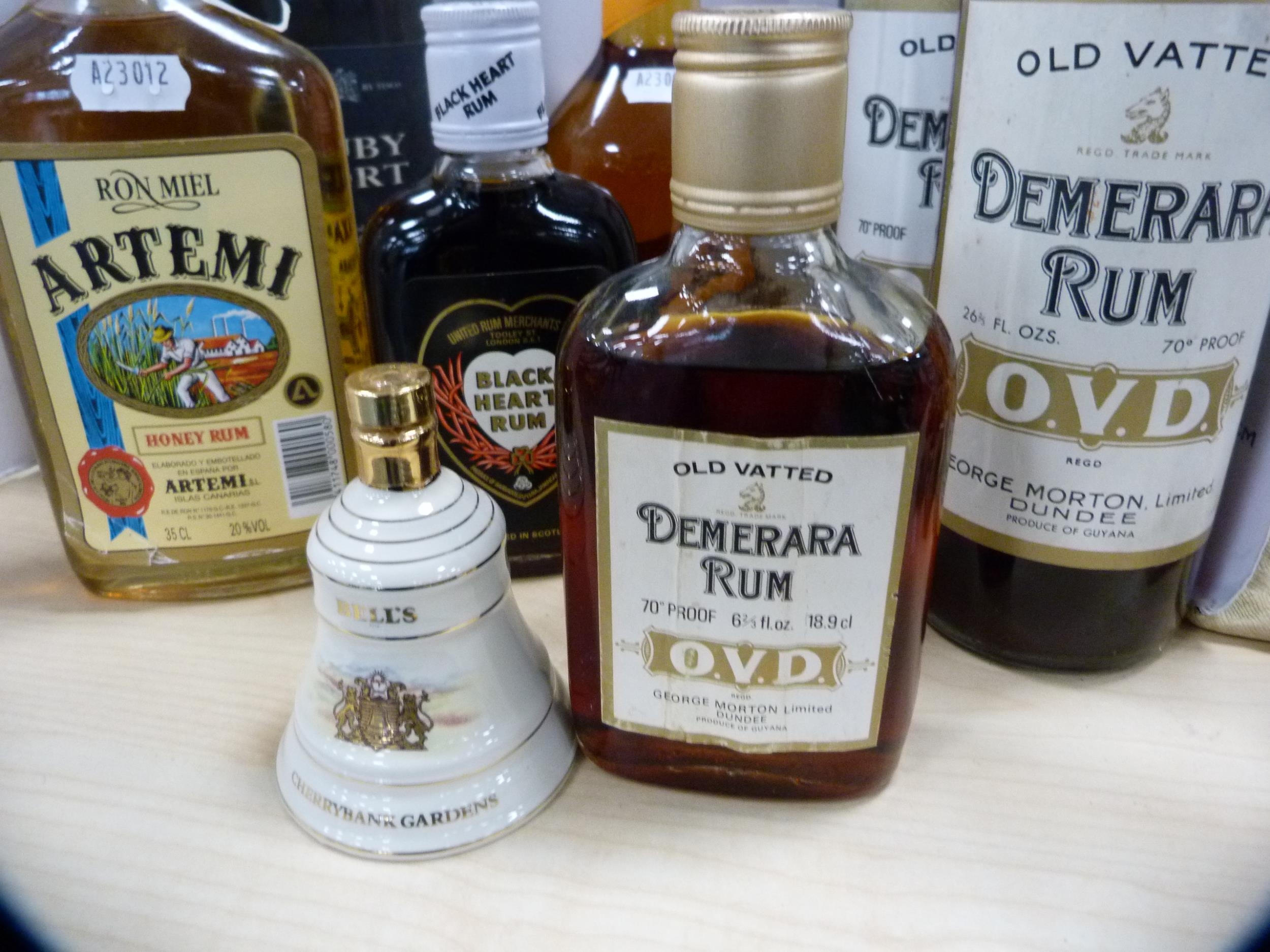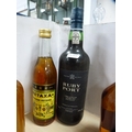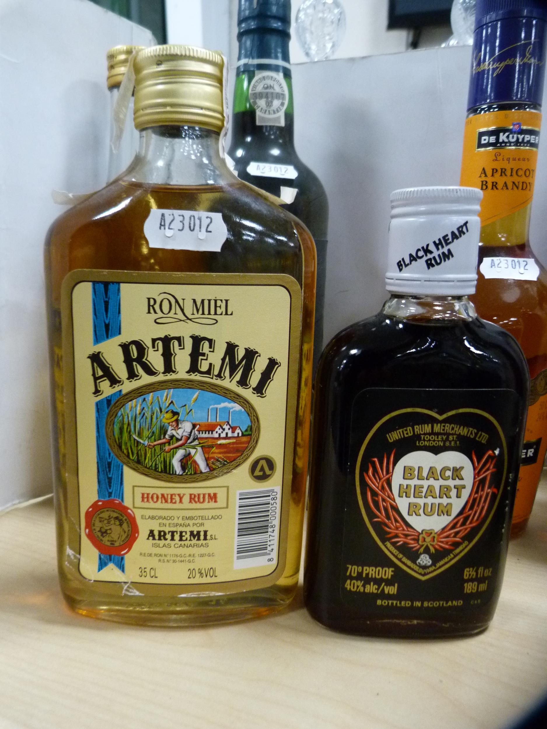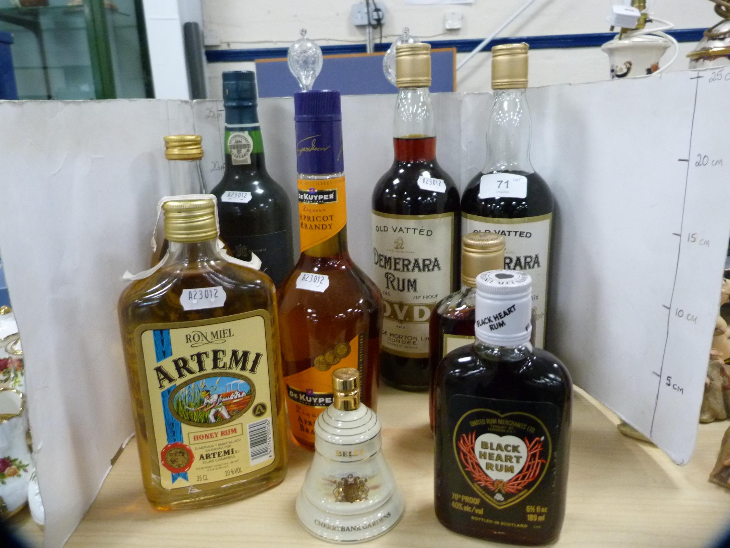 Group of liqueurs to include two bottles of OVD Demerara Rum 70 proof, bottle of ruby port, apricot brandy, Artemi honey rum, Metaxa brandy, Black Heart rum, and a half bottle of Demerara rum. (8)
