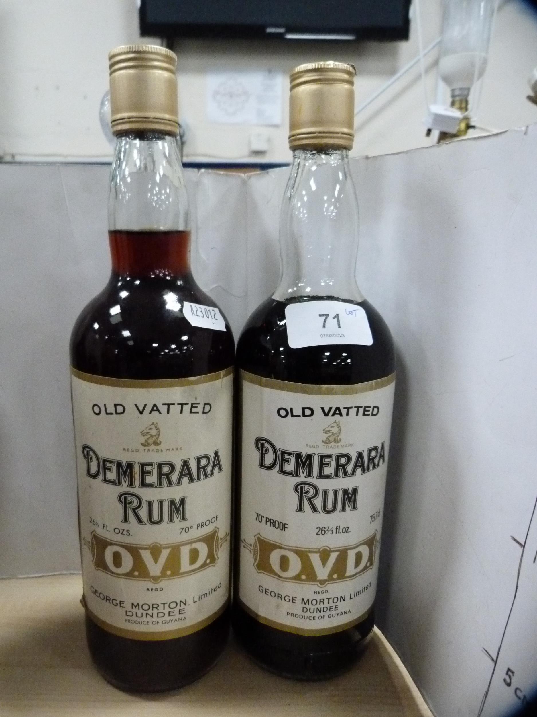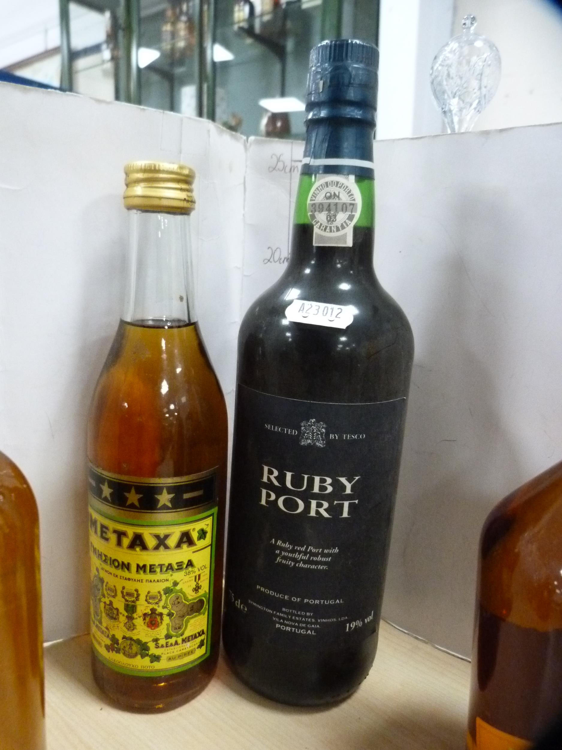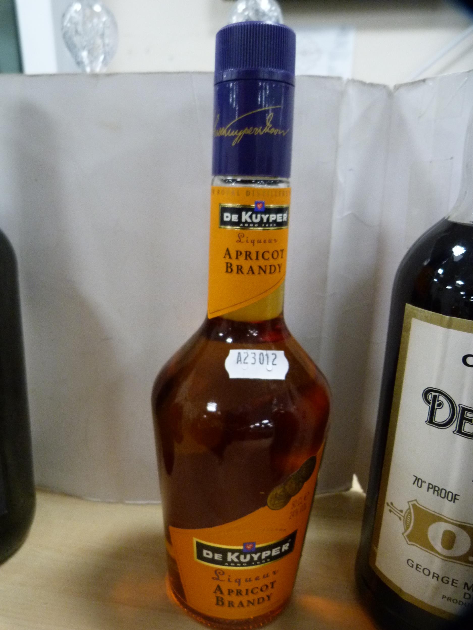 Group of liqueurs to include two bottles of OVD Demerara Rum 70 proof, bottle of ruby port, apricot brandy, Artemi honey rum, Metaxa brandy, Black Heart rum, and a half bottle of Demerara rum. (8)