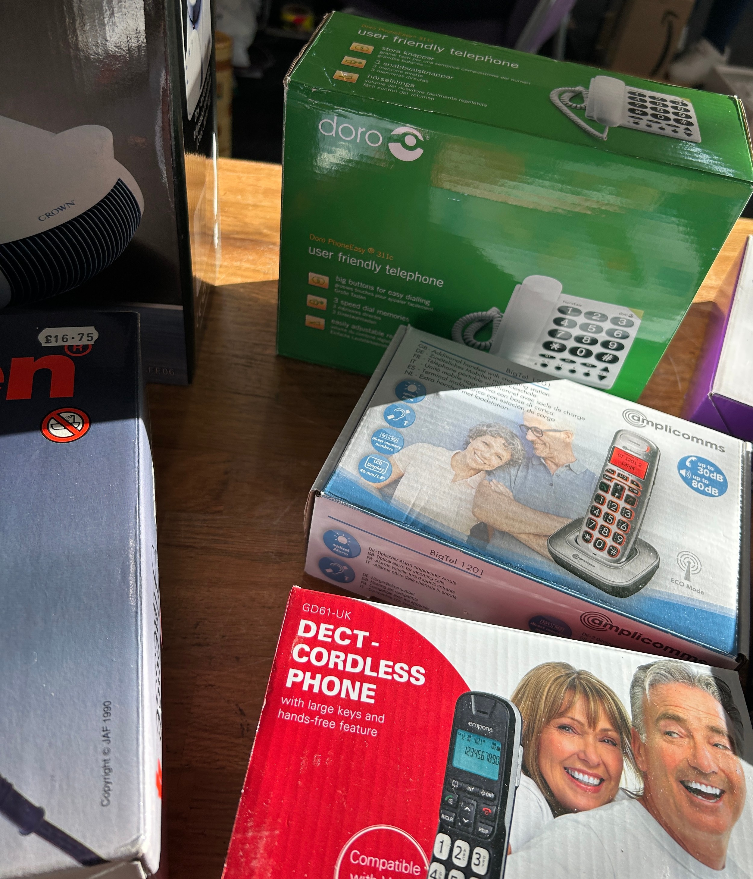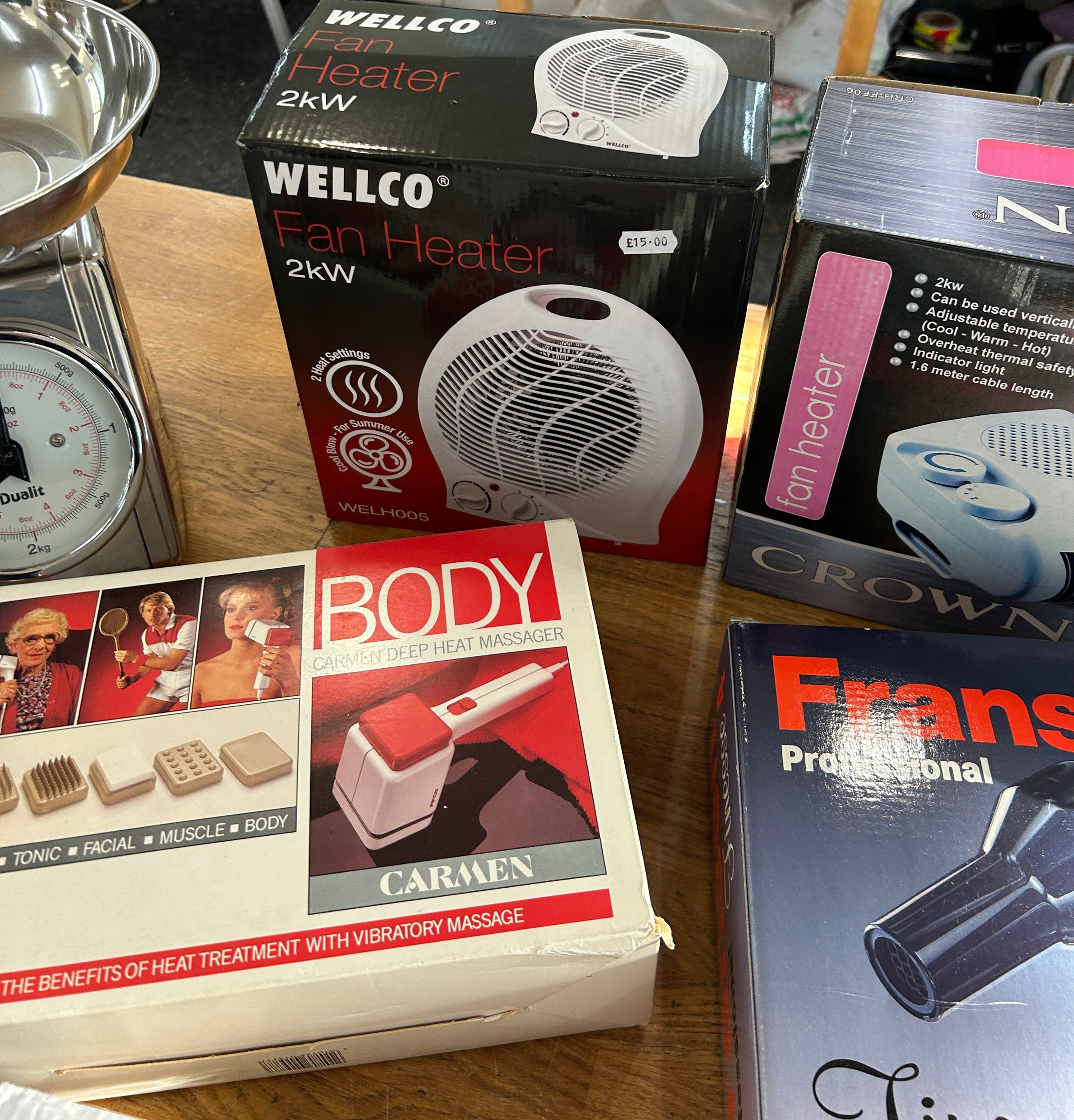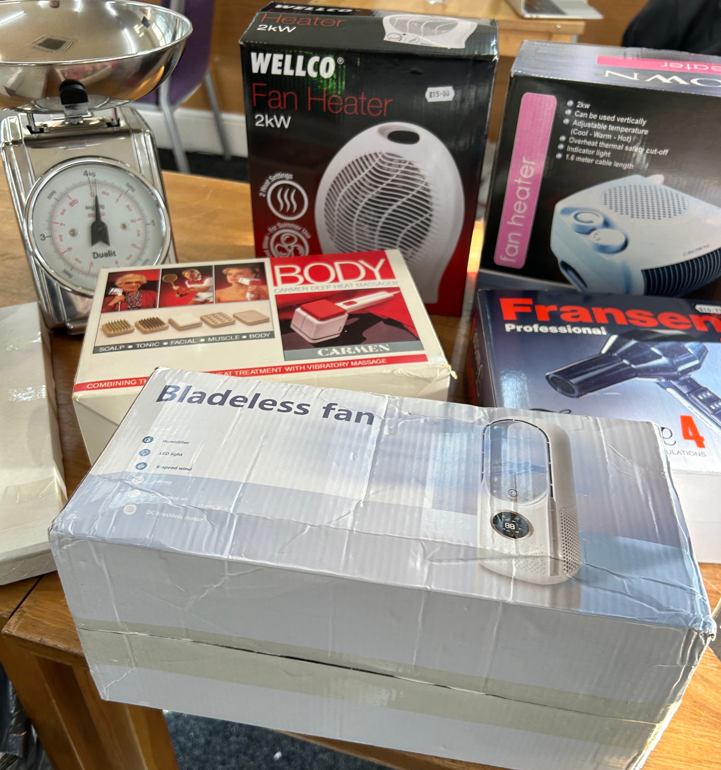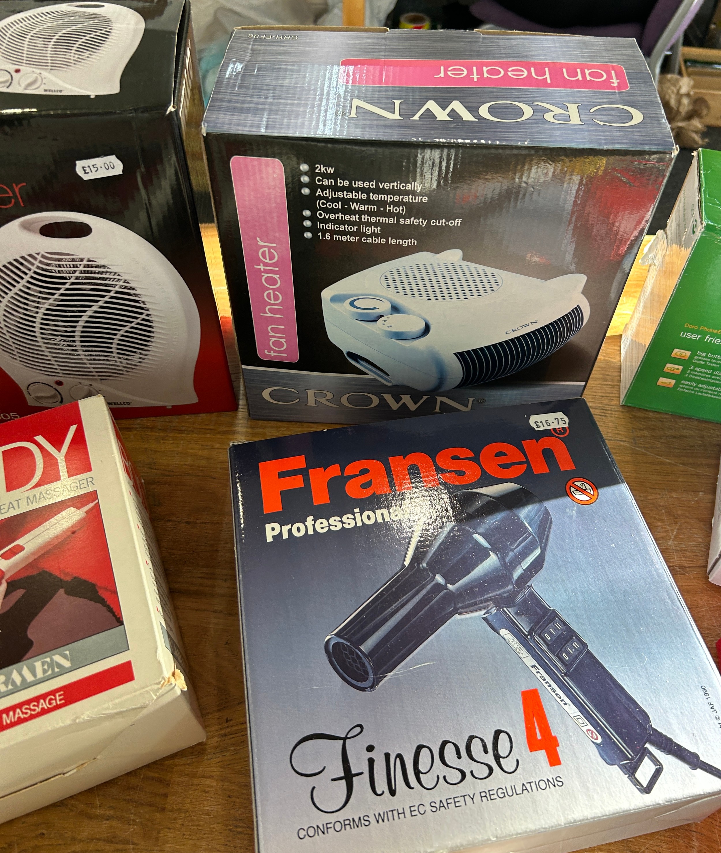 Selection of boxed electrical items to include a bladeless fan, fan heaters, landline phones, body massager, etc