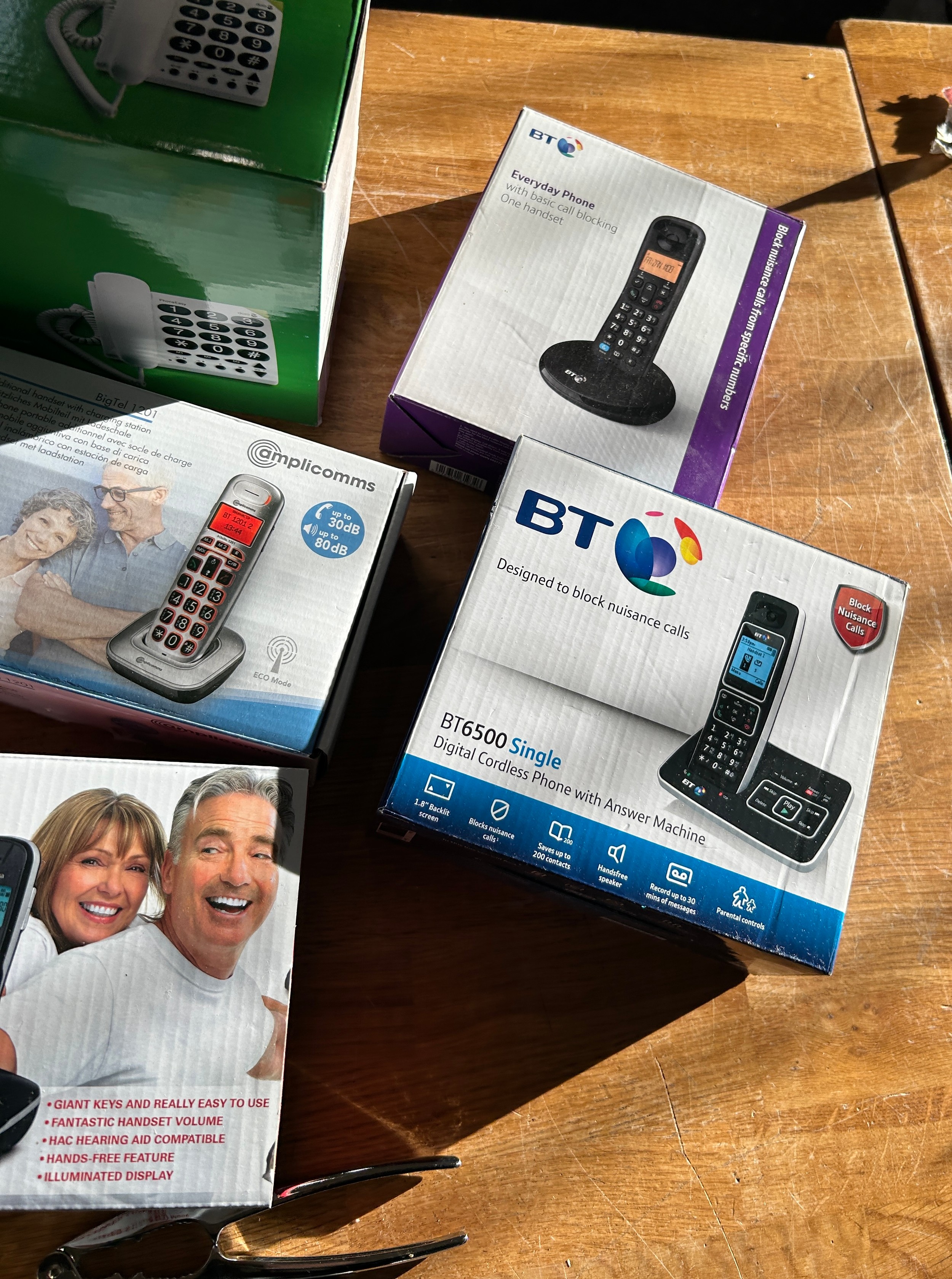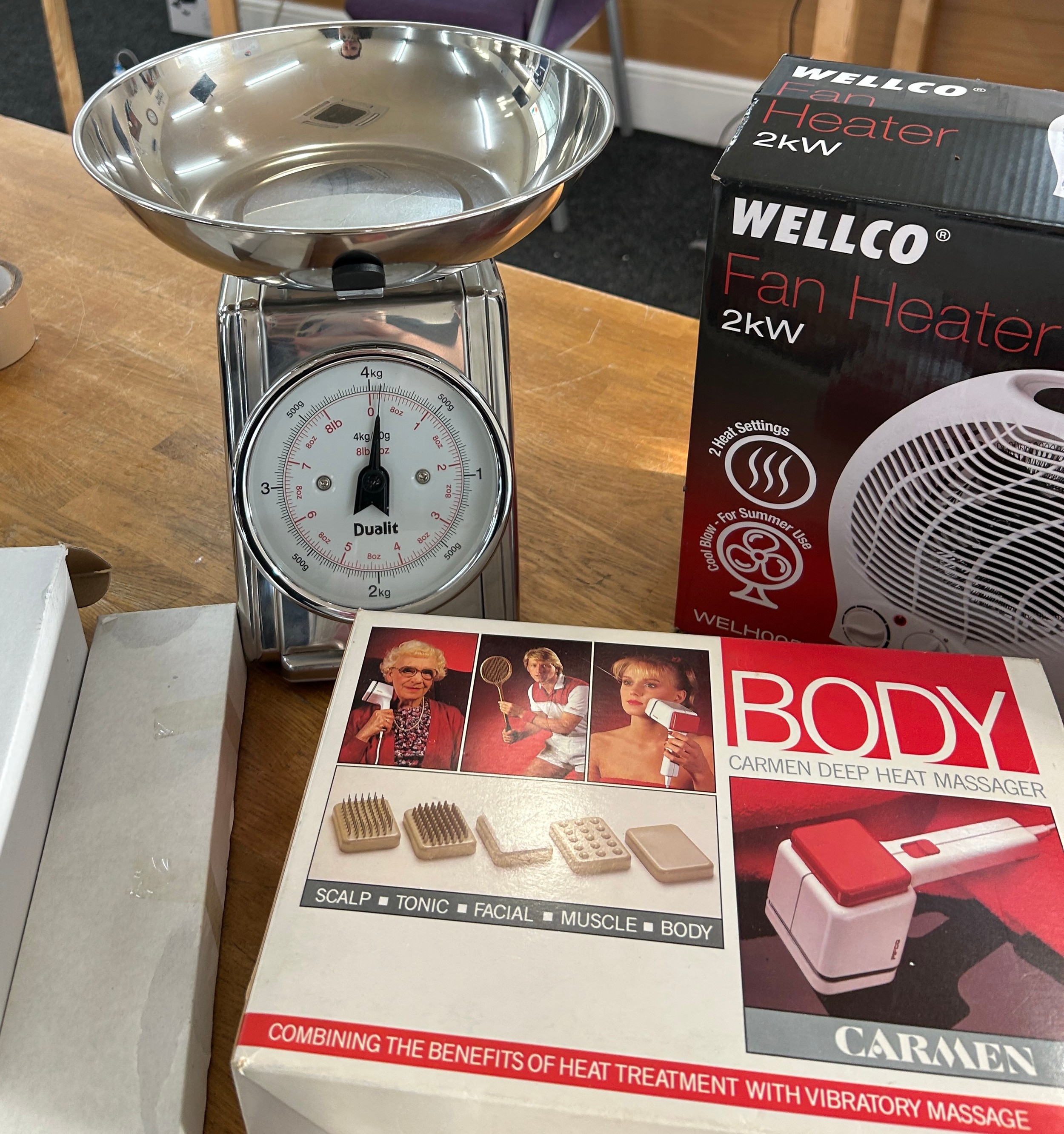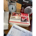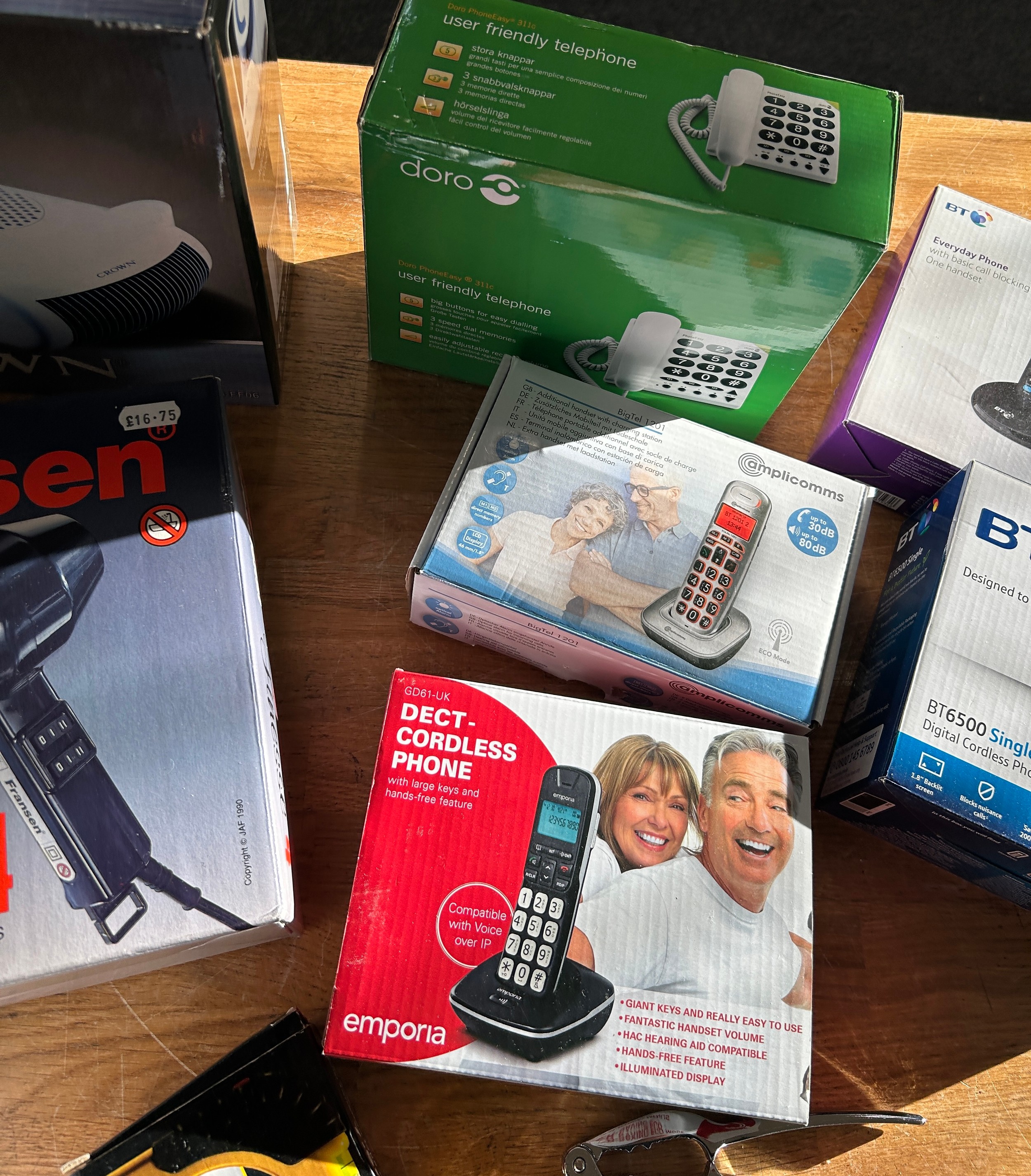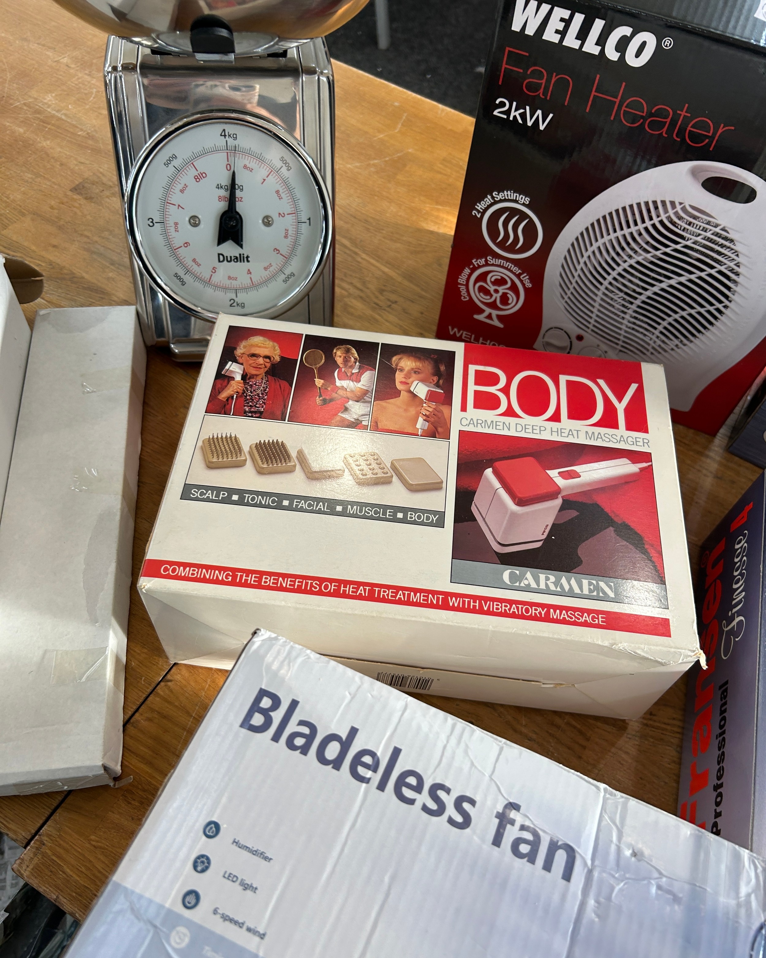 Selection of boxed electrical items to include a bladeless fan, fan heaters, landline phones, body massager, etc