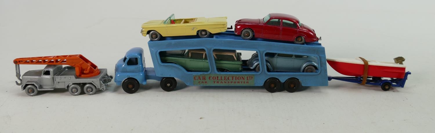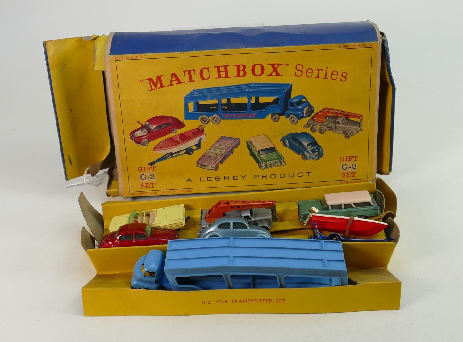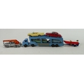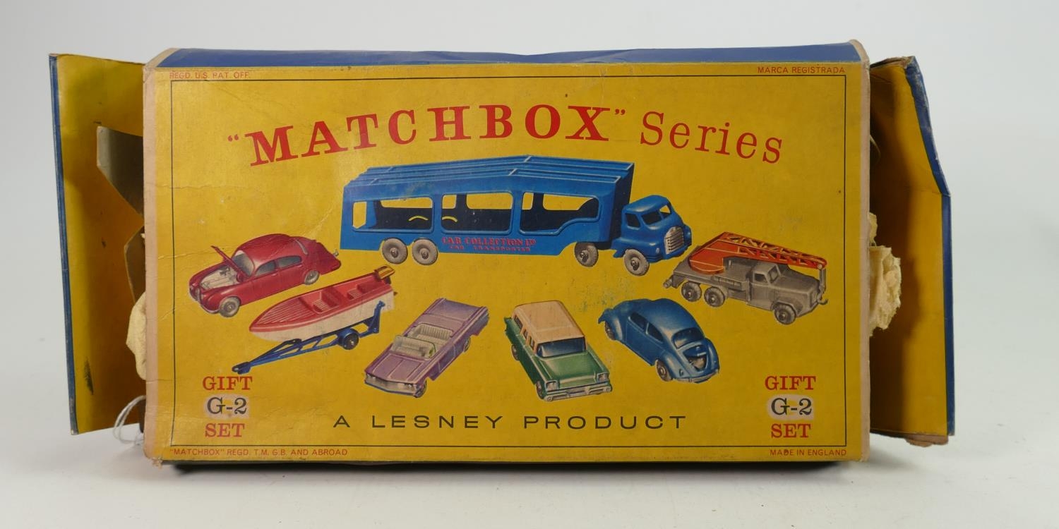 Matchbox Boxed Series G-2 Gift Set: Car Transporter Set. Contents 6 Matchbox series Nos 25,30,31,39,48,65 and accessory pack A-2, outer box squashed with some ripping.