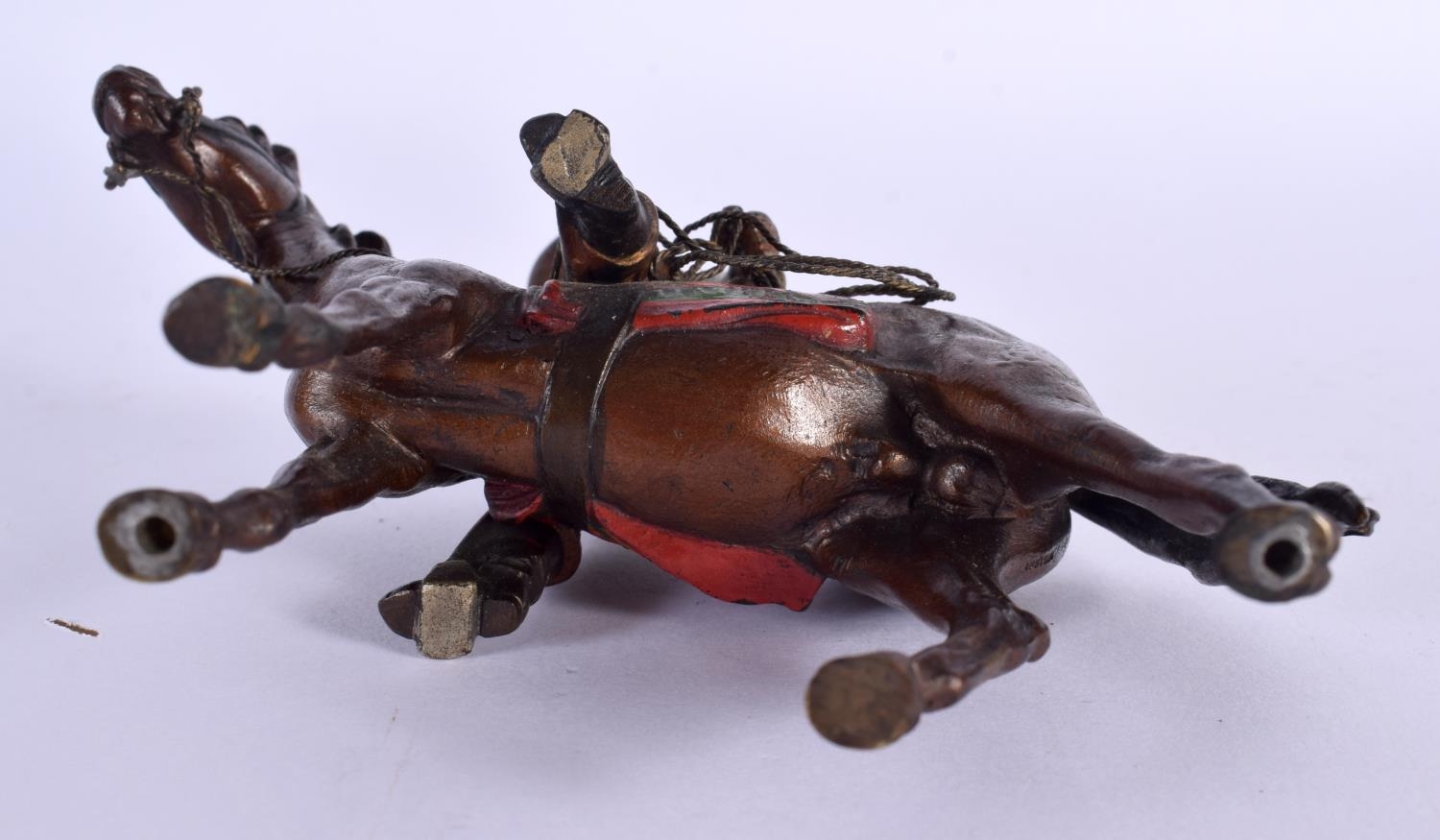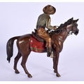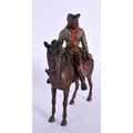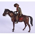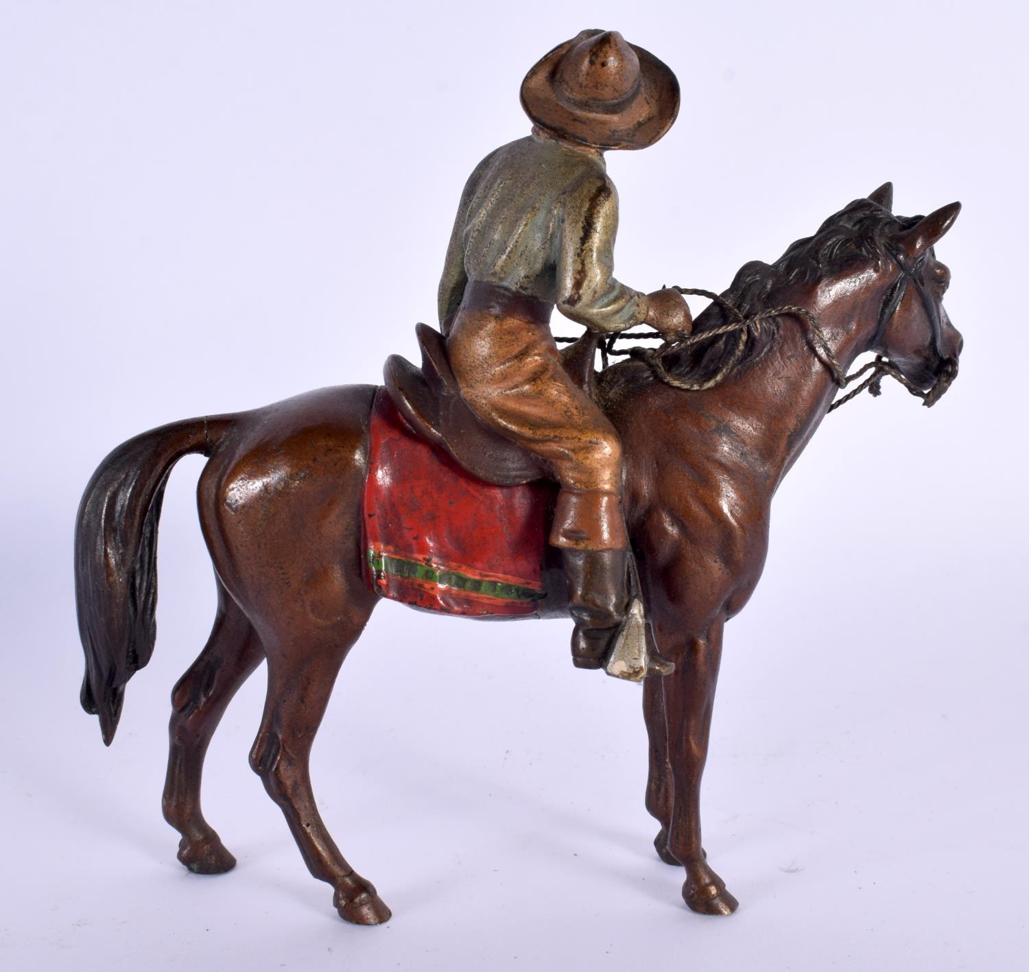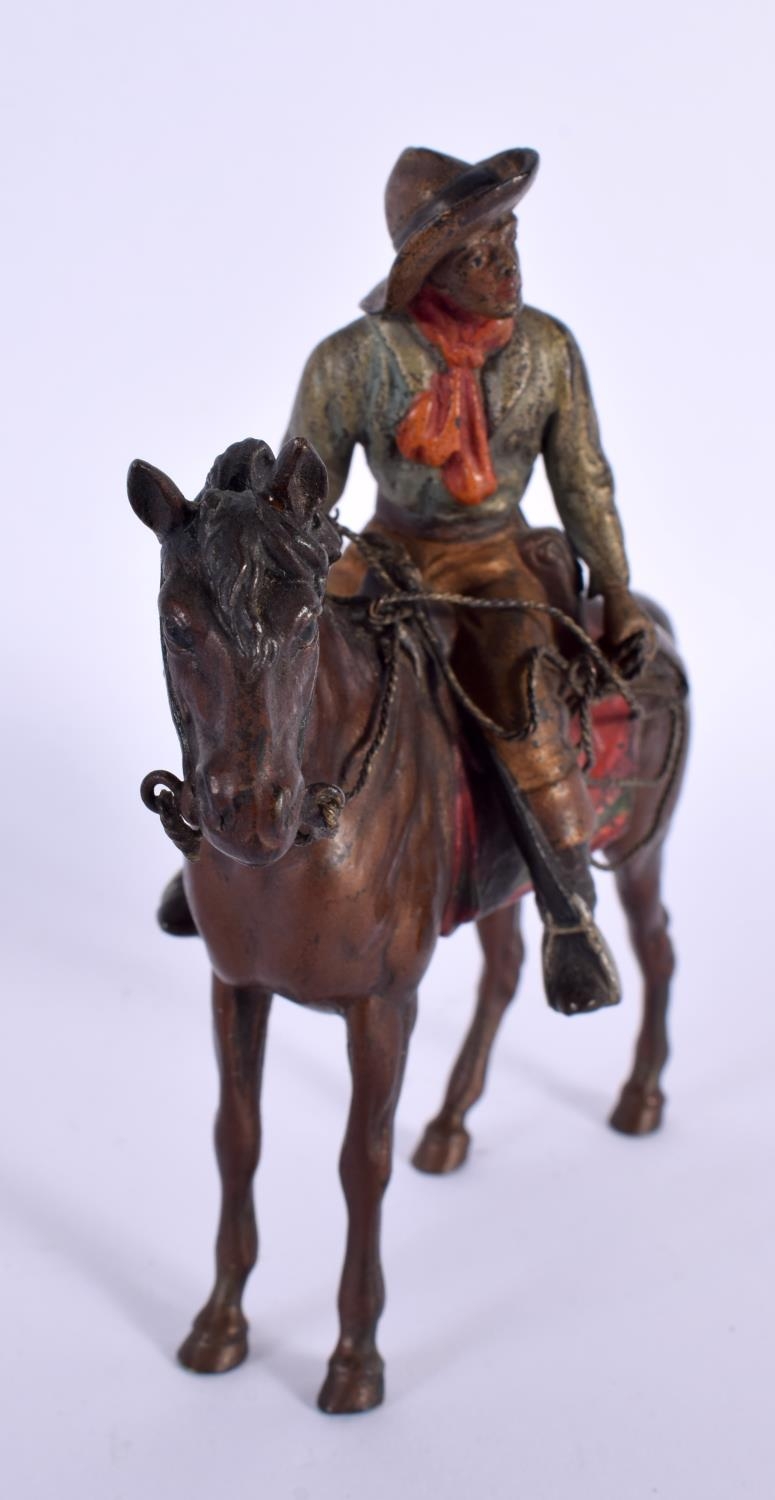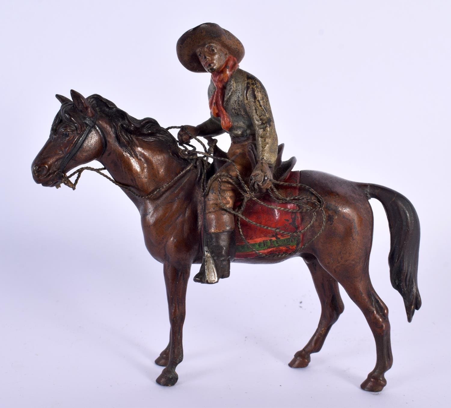 A RARE 19TH CENTURY AUSTRIAN COLD PAINTED BRONZE FIGURE OF A COWBOY modelled upon a horse. 12 cm x 10 cm.
