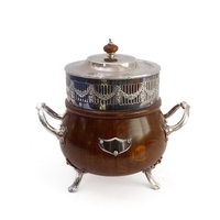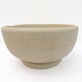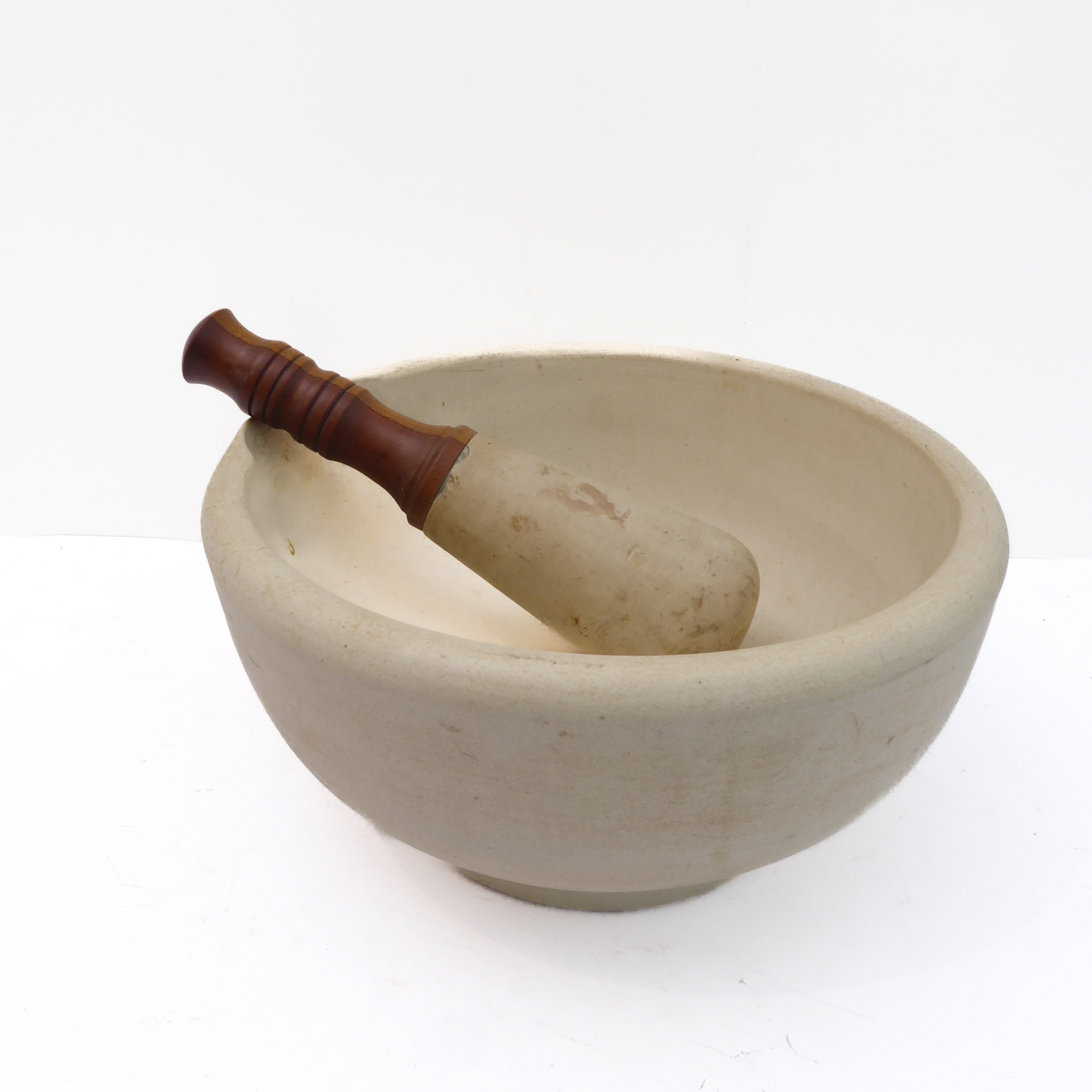A large early 20th century ceramic pestle and mortar: the pestle with two-toned turned wooden handle, the mortar with impressed marks to underside (28cm diameter)
