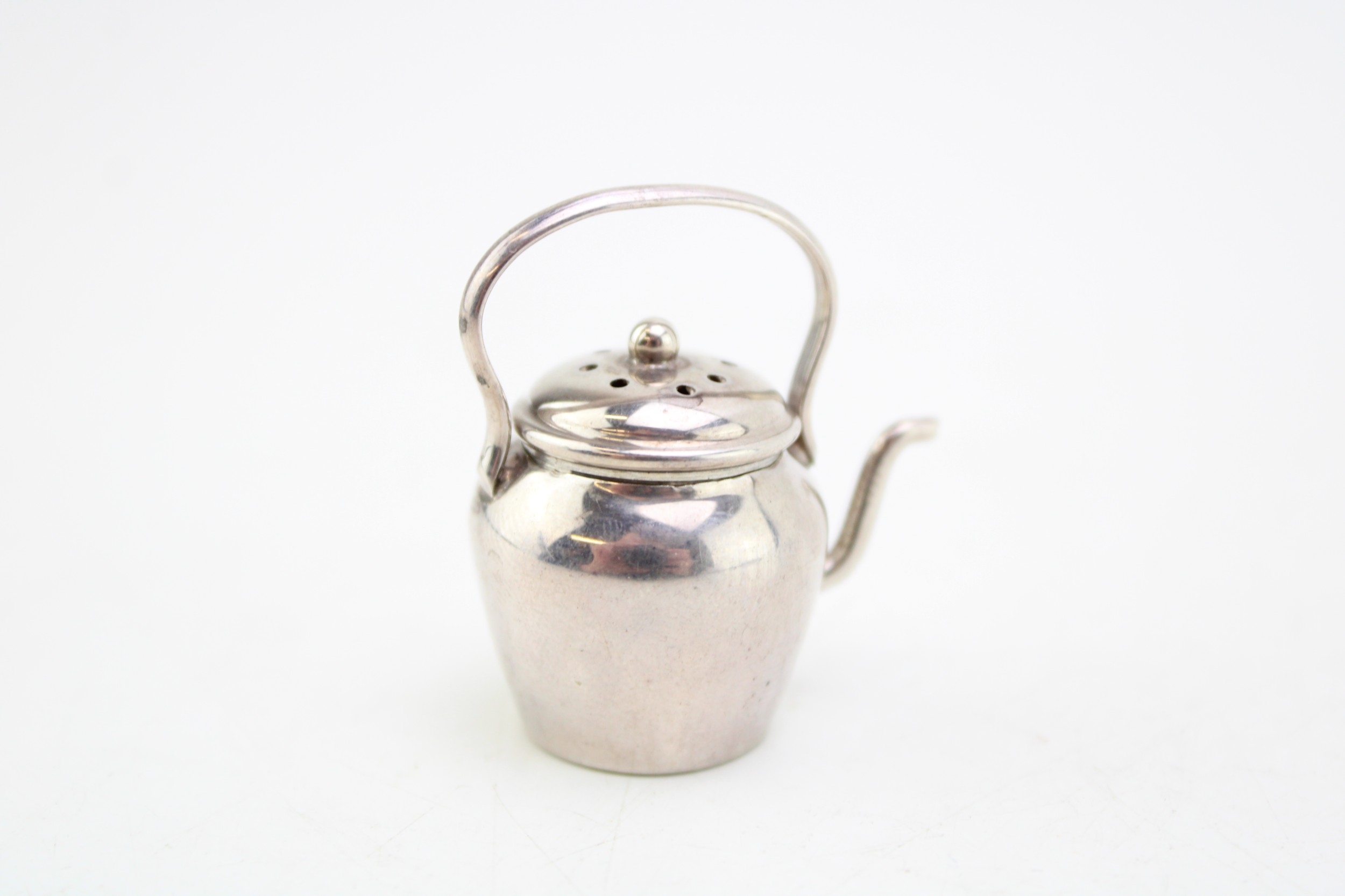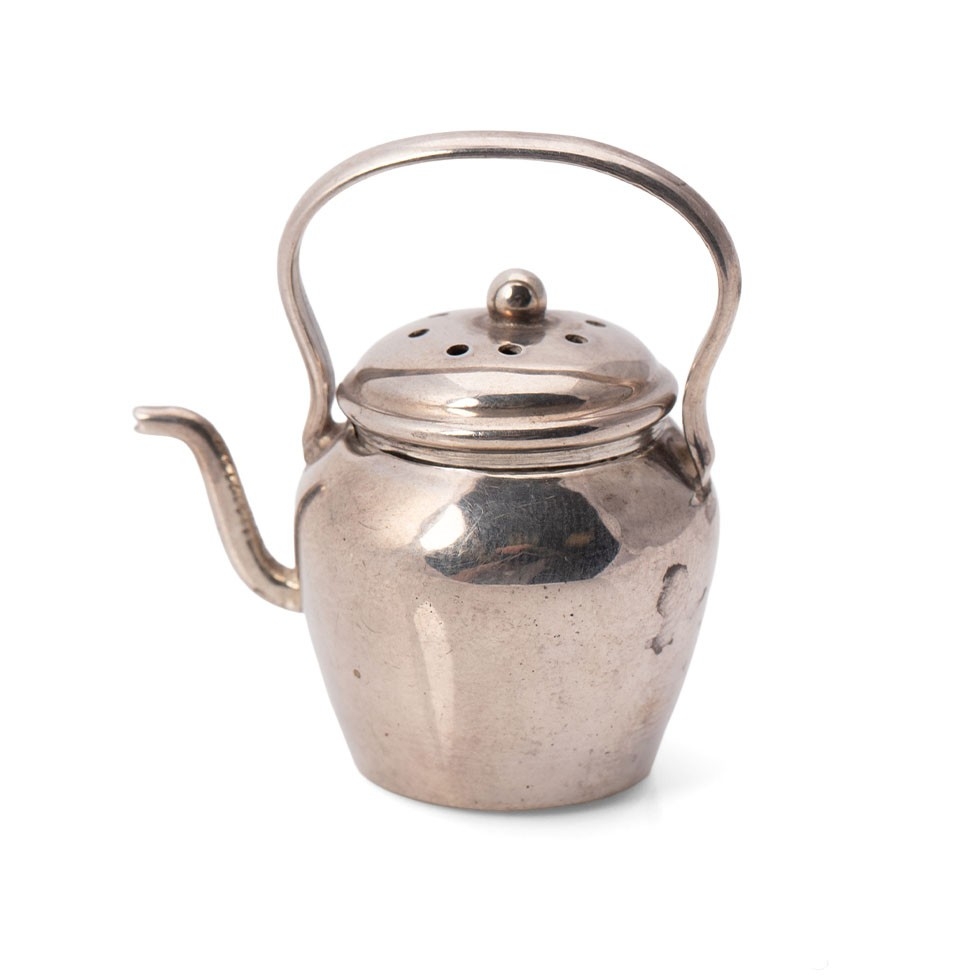 A novelty pepperette in the form of a kettle, John Thompson & Sons, Birmingham, likely 1935, mark rubbed, 8.8g, 0.28toz.