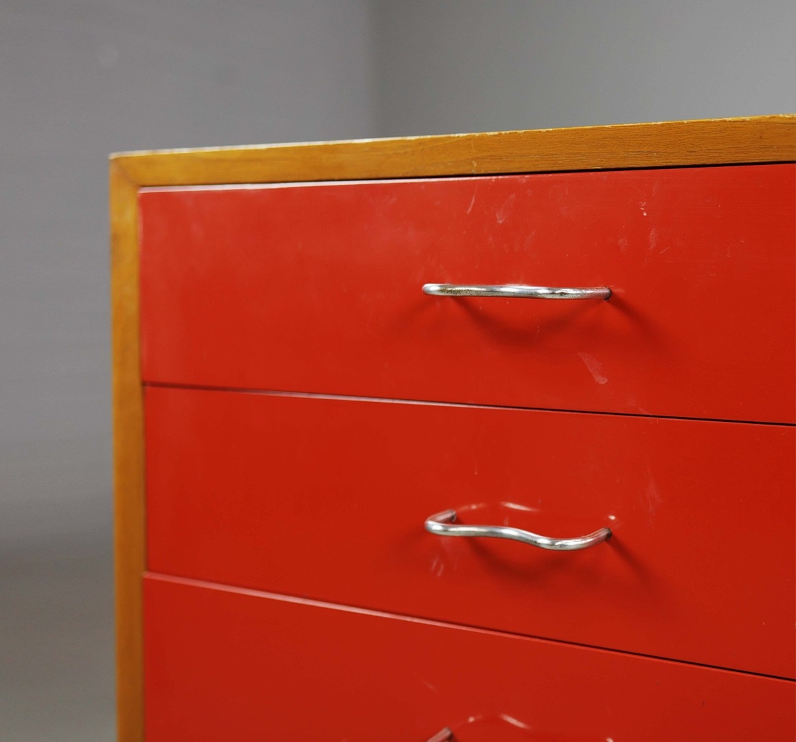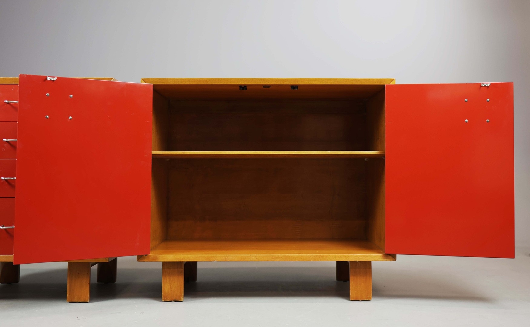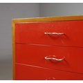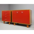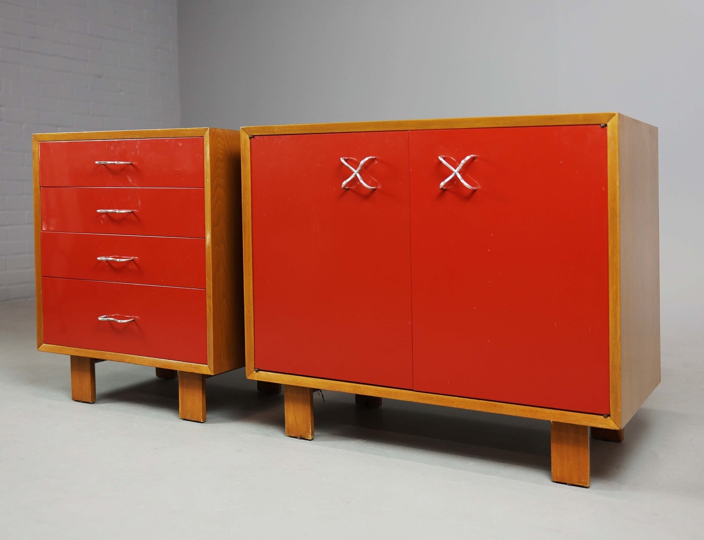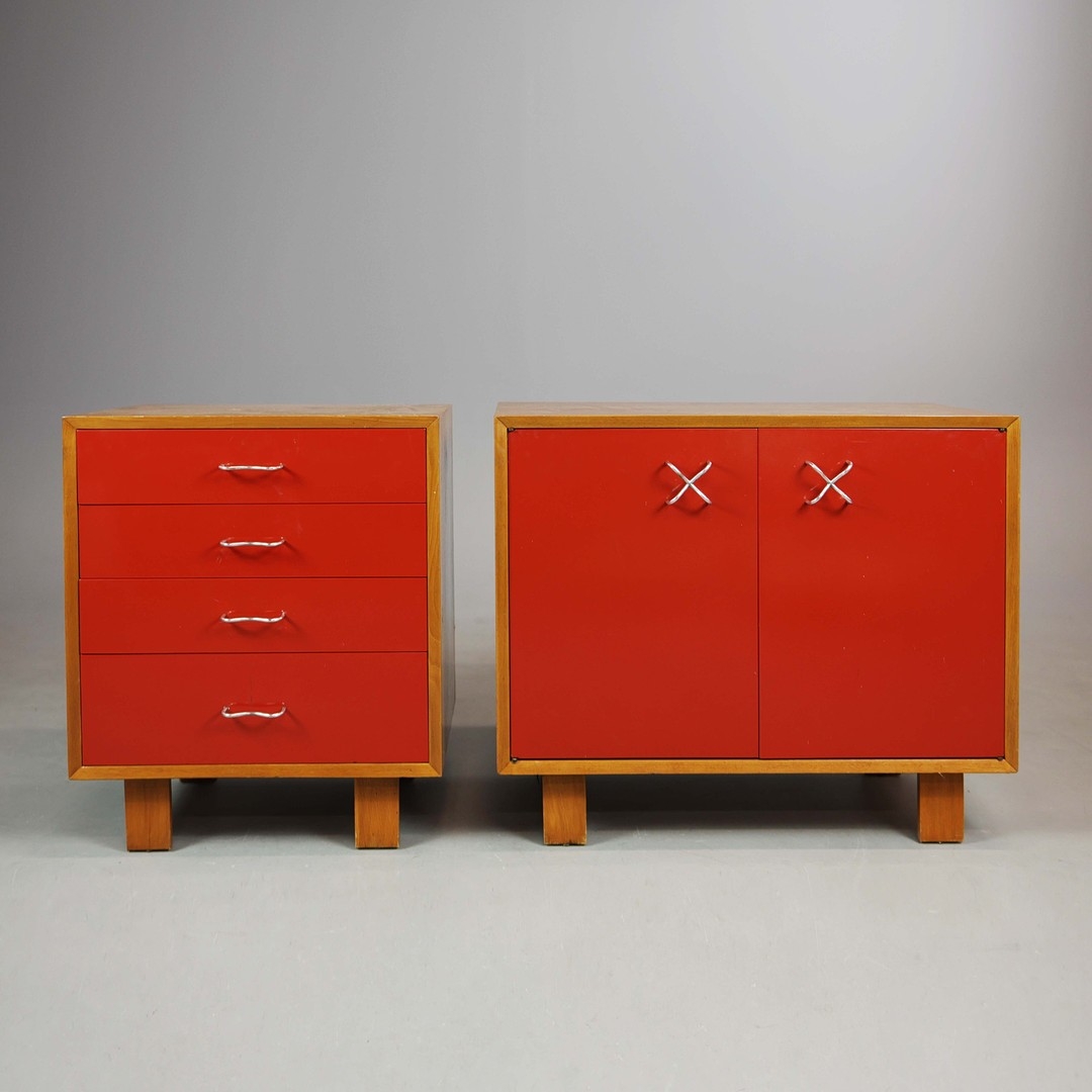 1950s GEORGE NELSON FOR HERMAN MILLER CABINET AND MATCHING CHEST. Wood and red lacquered with chrome handles Cabinet: 75cm H x 87cm W x 47cm D Chest: 75cm H x 61.5cm W x 47cm D.