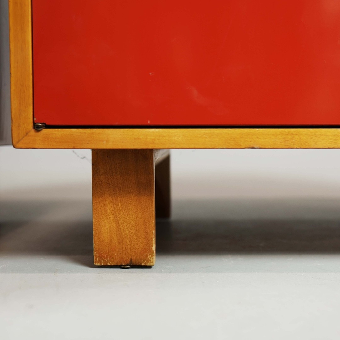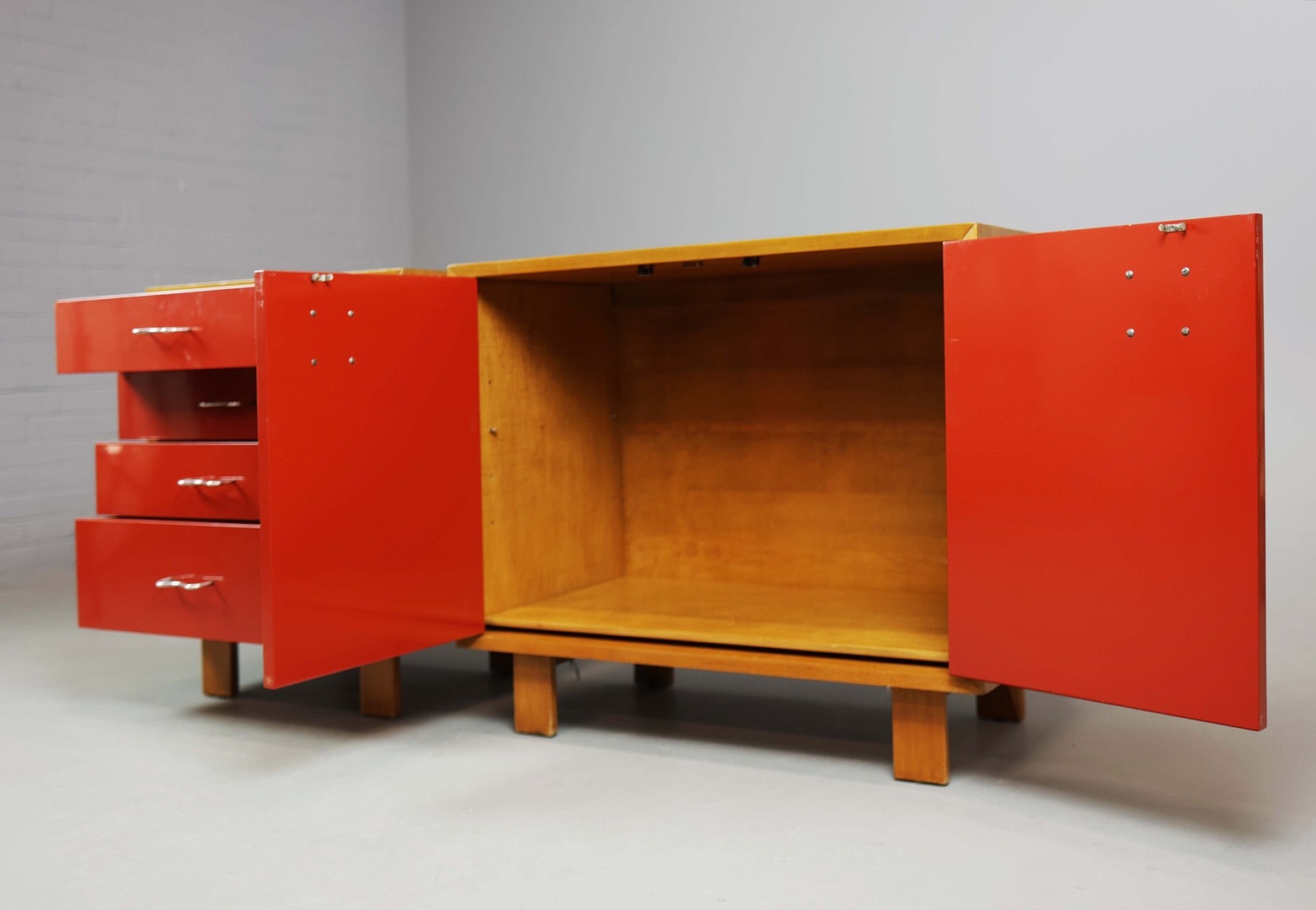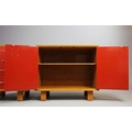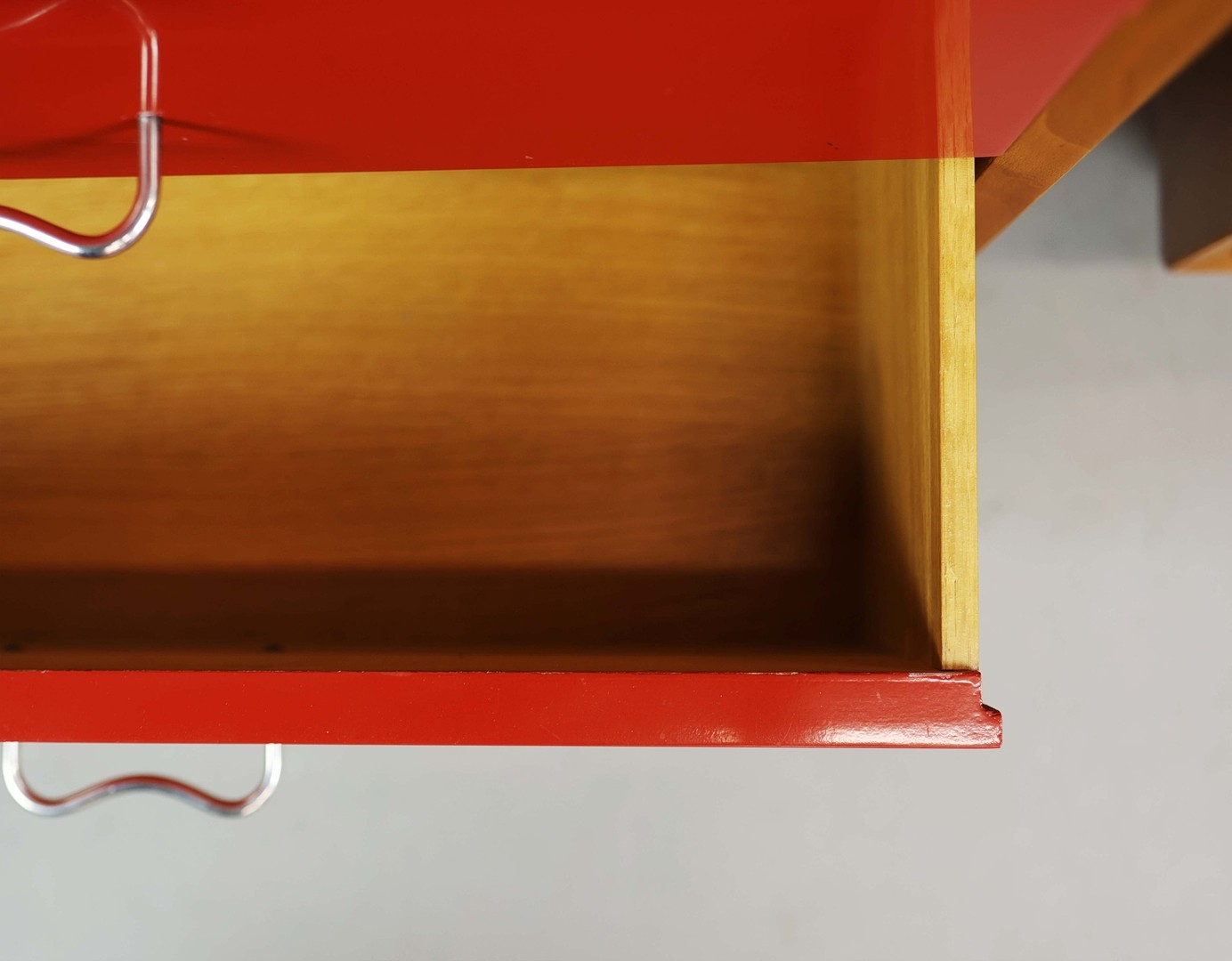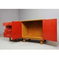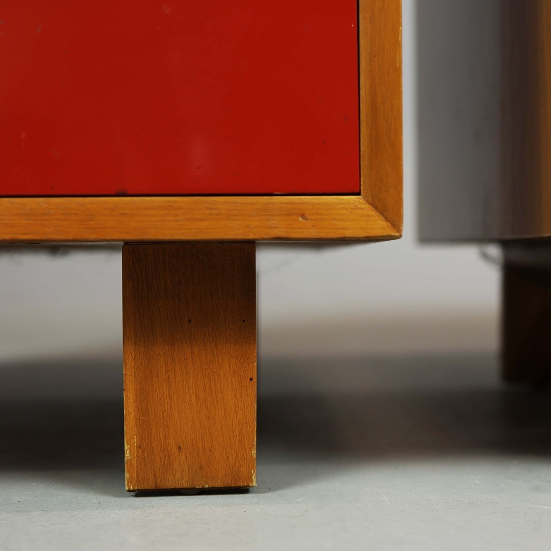 1950s GEORGE NELSON FOR HERMAN MILLER CABINET AND MATCHING CHEST. Wood and red lacquered with chrome handles Cabinet: 75cm H x 87cm W x 47cm D Chest: 75cm H x 61.5cm W x 47cm D.