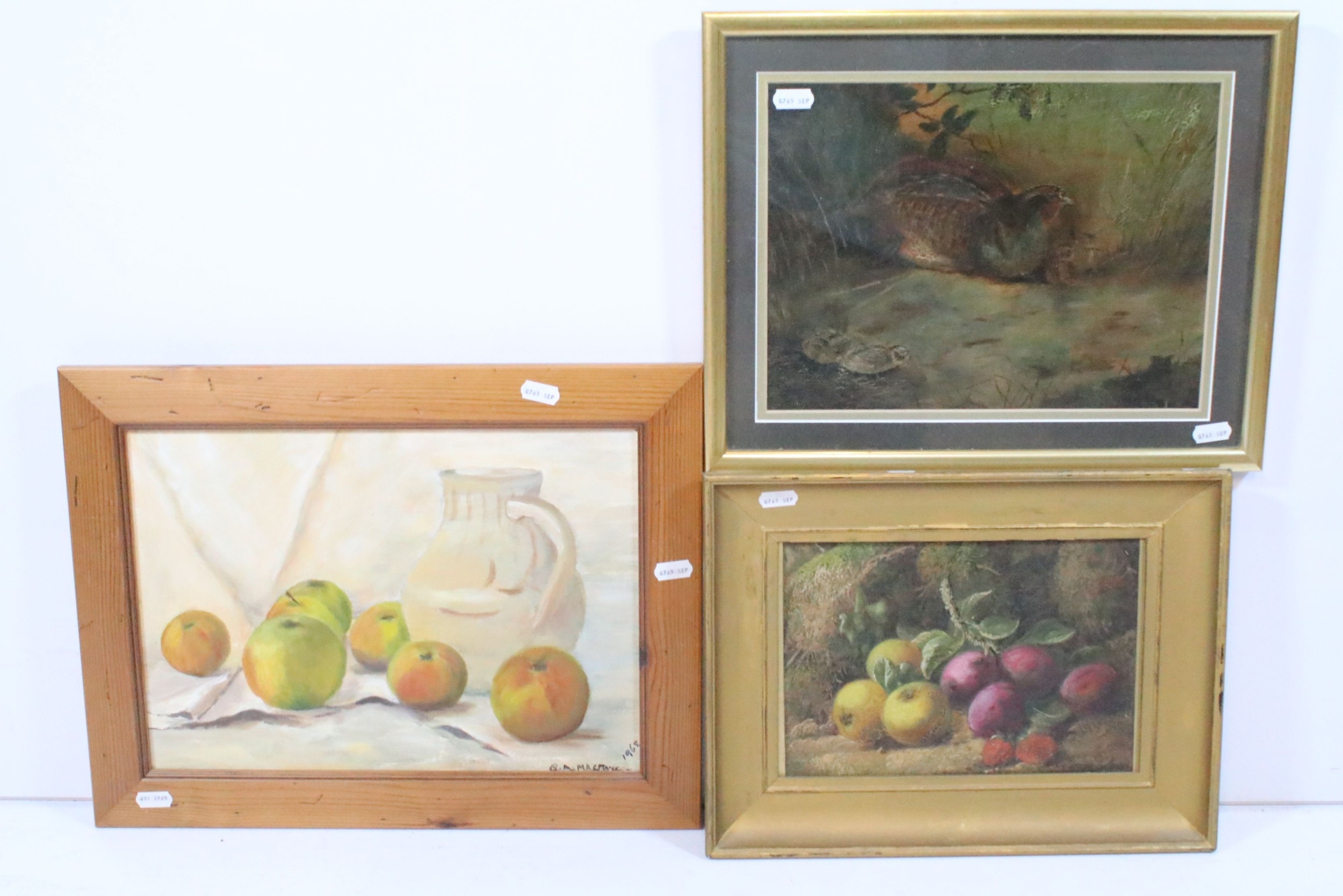 George Clare (English, 1835 - 1890) still life, oil on canvas, signed to lower right, 17.5cm x 25cm, framed together with an early 20th century school painting of a seated duck, and a 20th century school still life, framed (3)