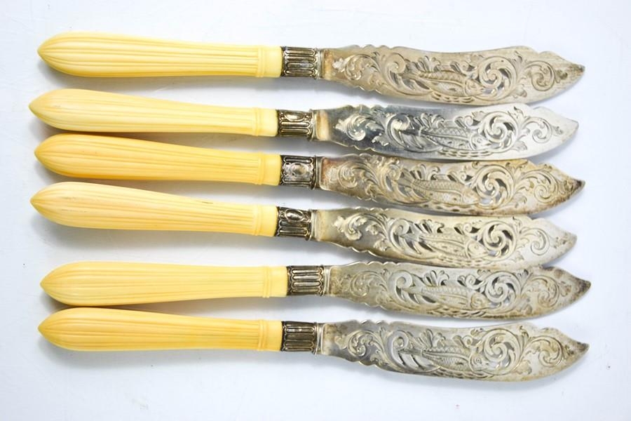 A set of six silver fish knives with bone handles, the knives engraved with fish.