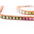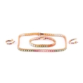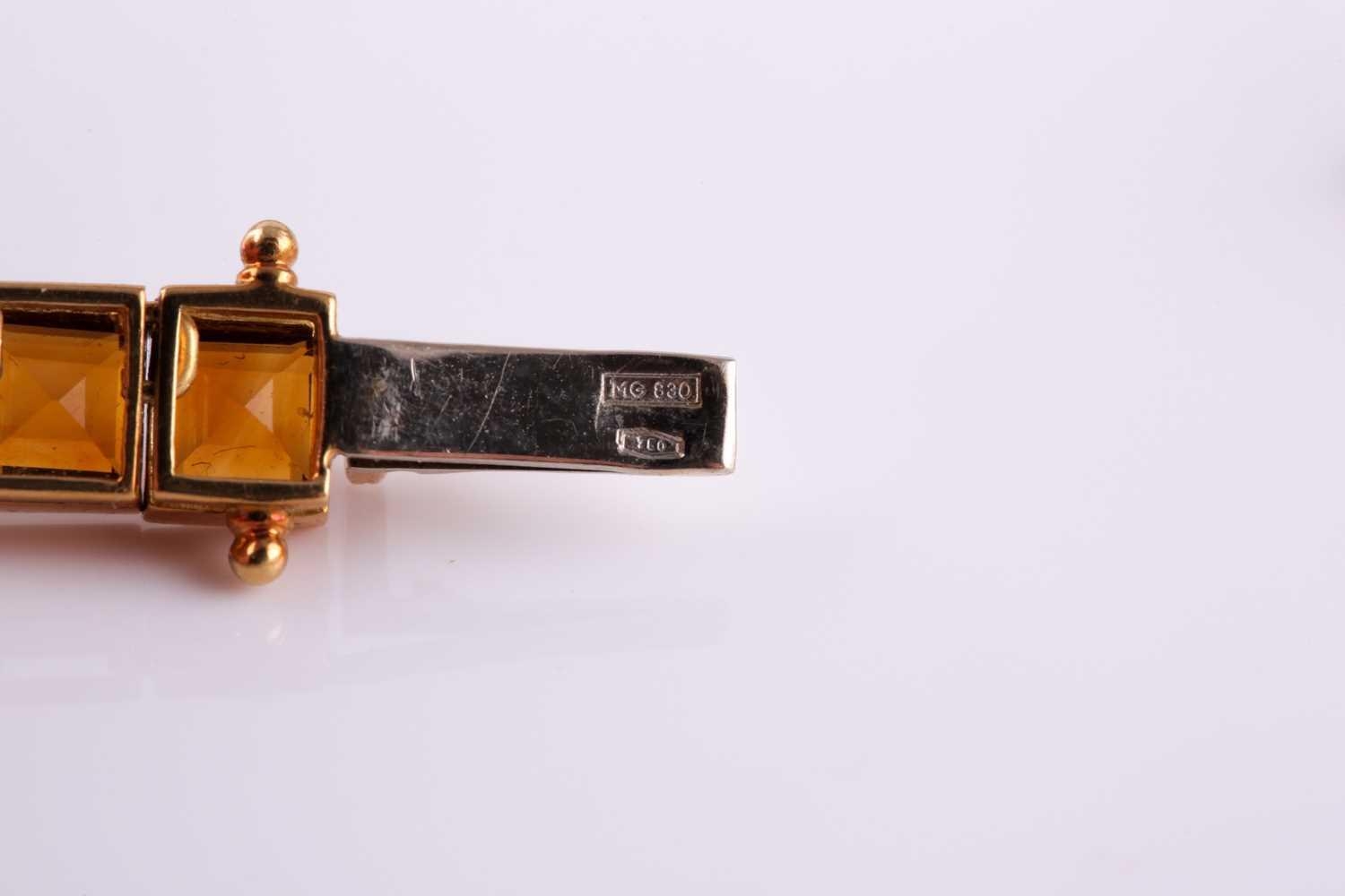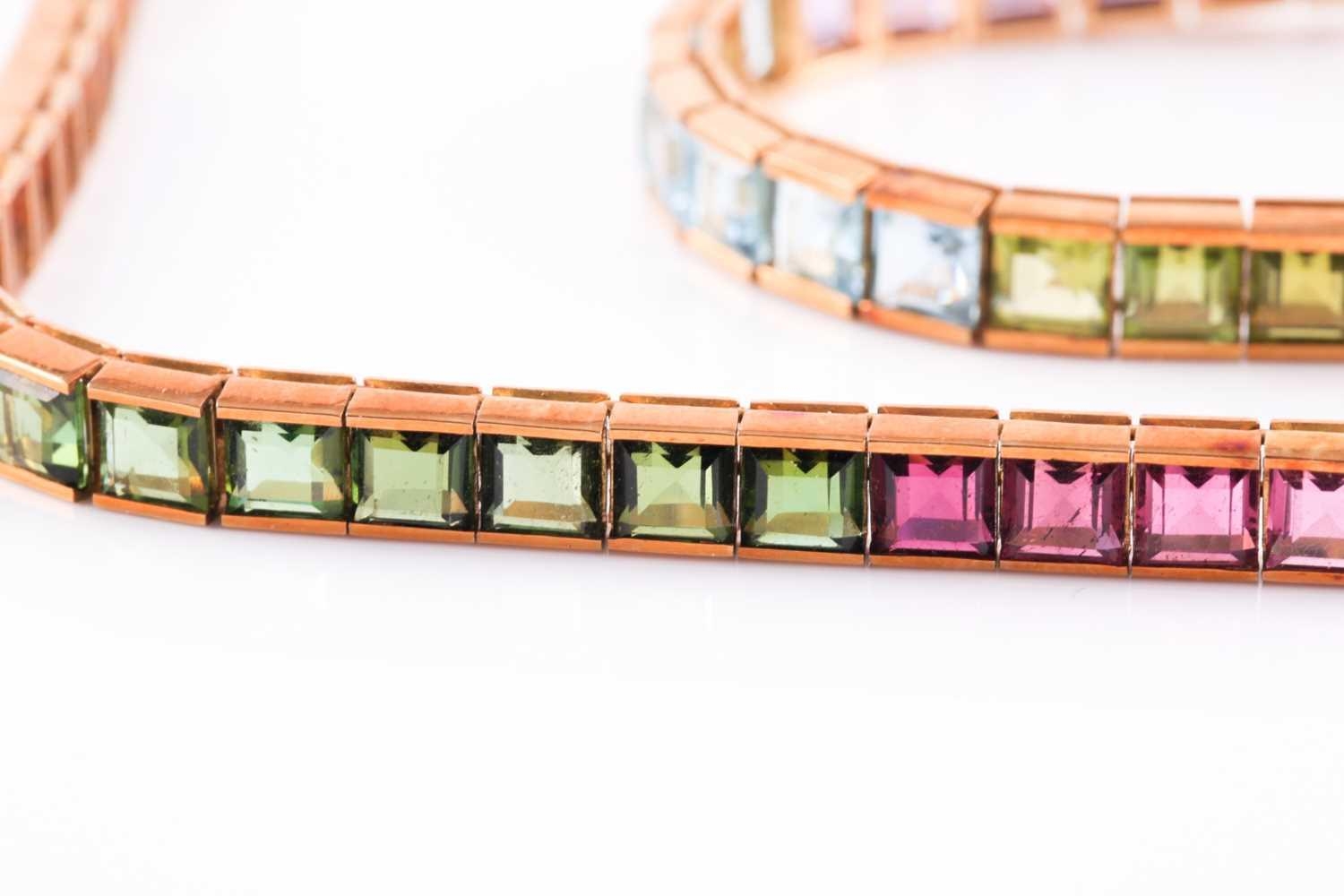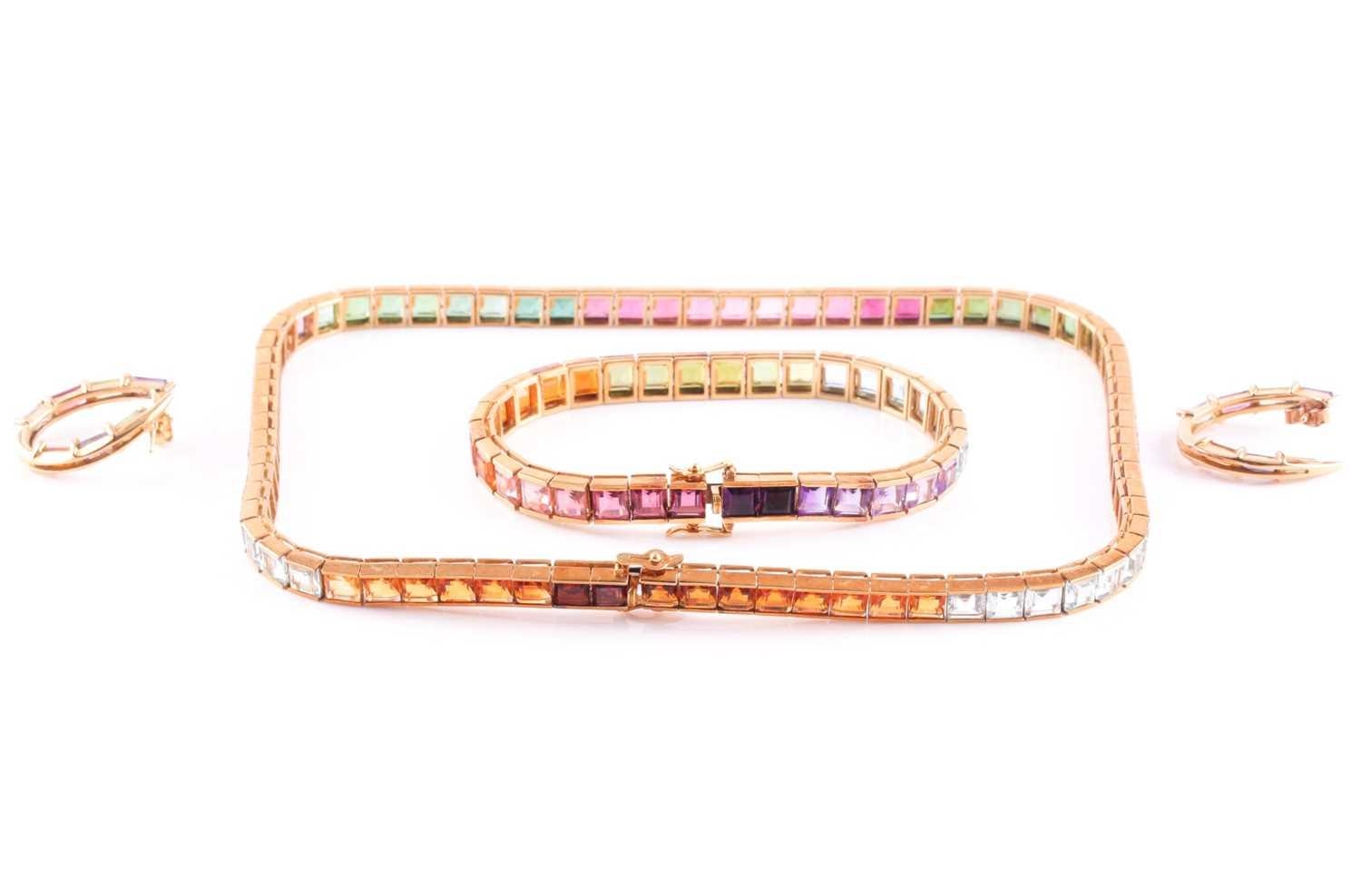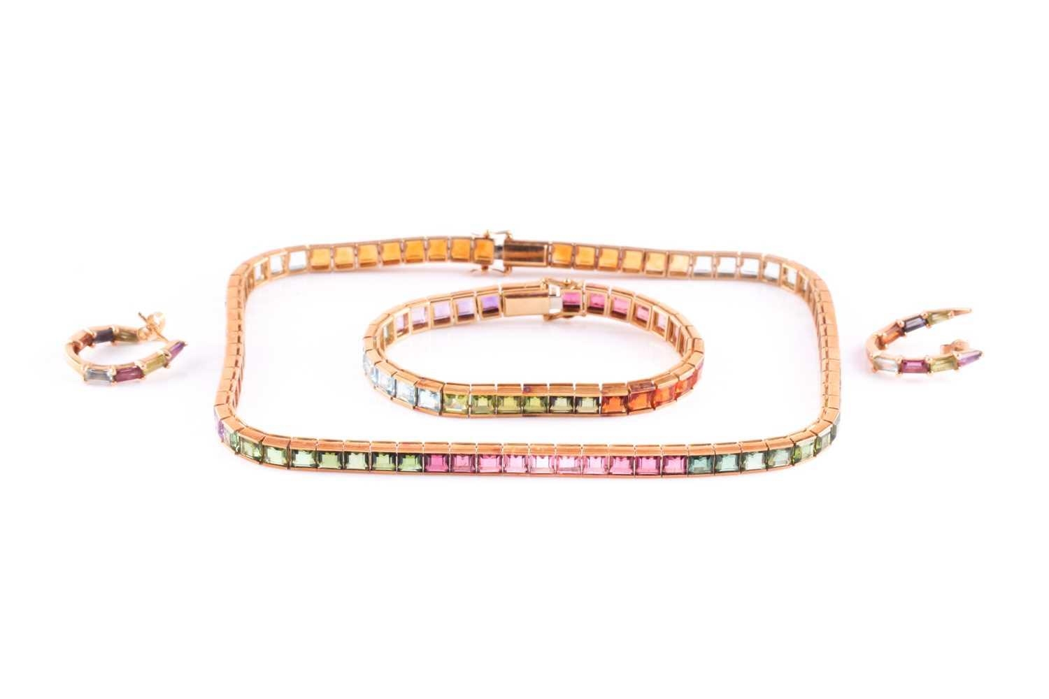 An 18ct yellow gold and multi-gemstone rainbow necklace, bracelet, and matching earrings, the necklace and bracelet set with citrine, topaz, amethyst, and tourmalines, marked 750, the necklace 40 cm long, the bracelet 18 cm long, and the hoop earrings 2.3 cm long.
