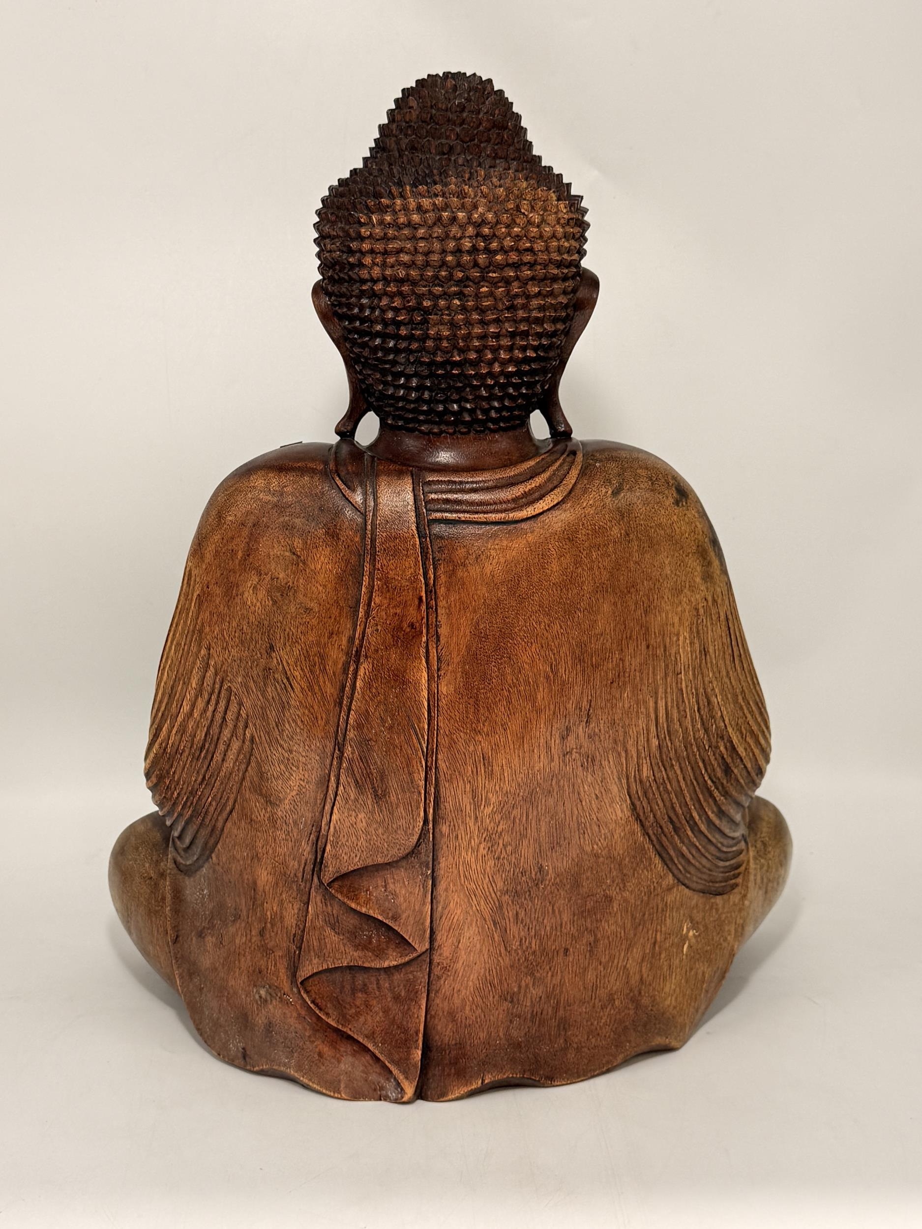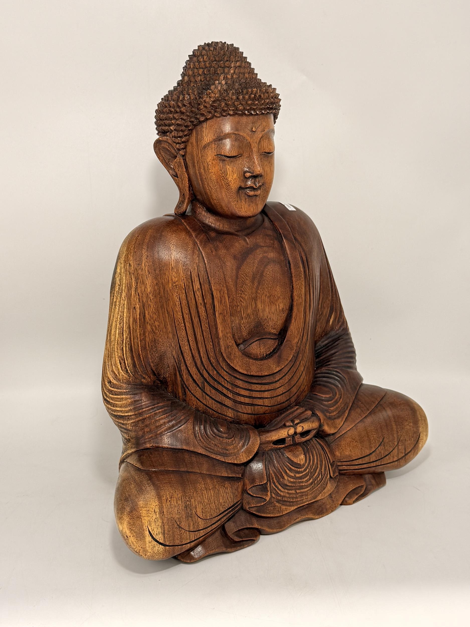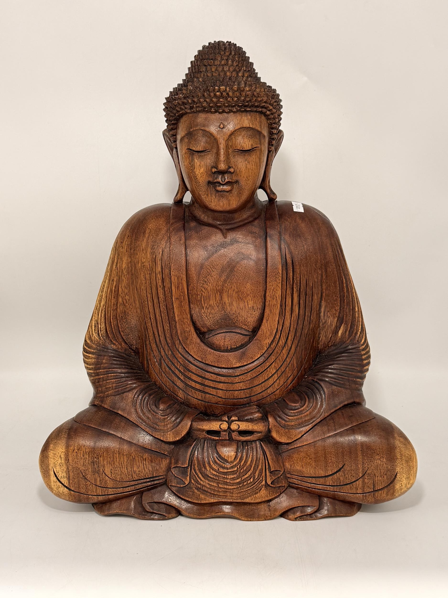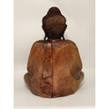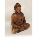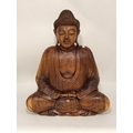 A large carved wooden figure of Buddha, seated. 51cm high