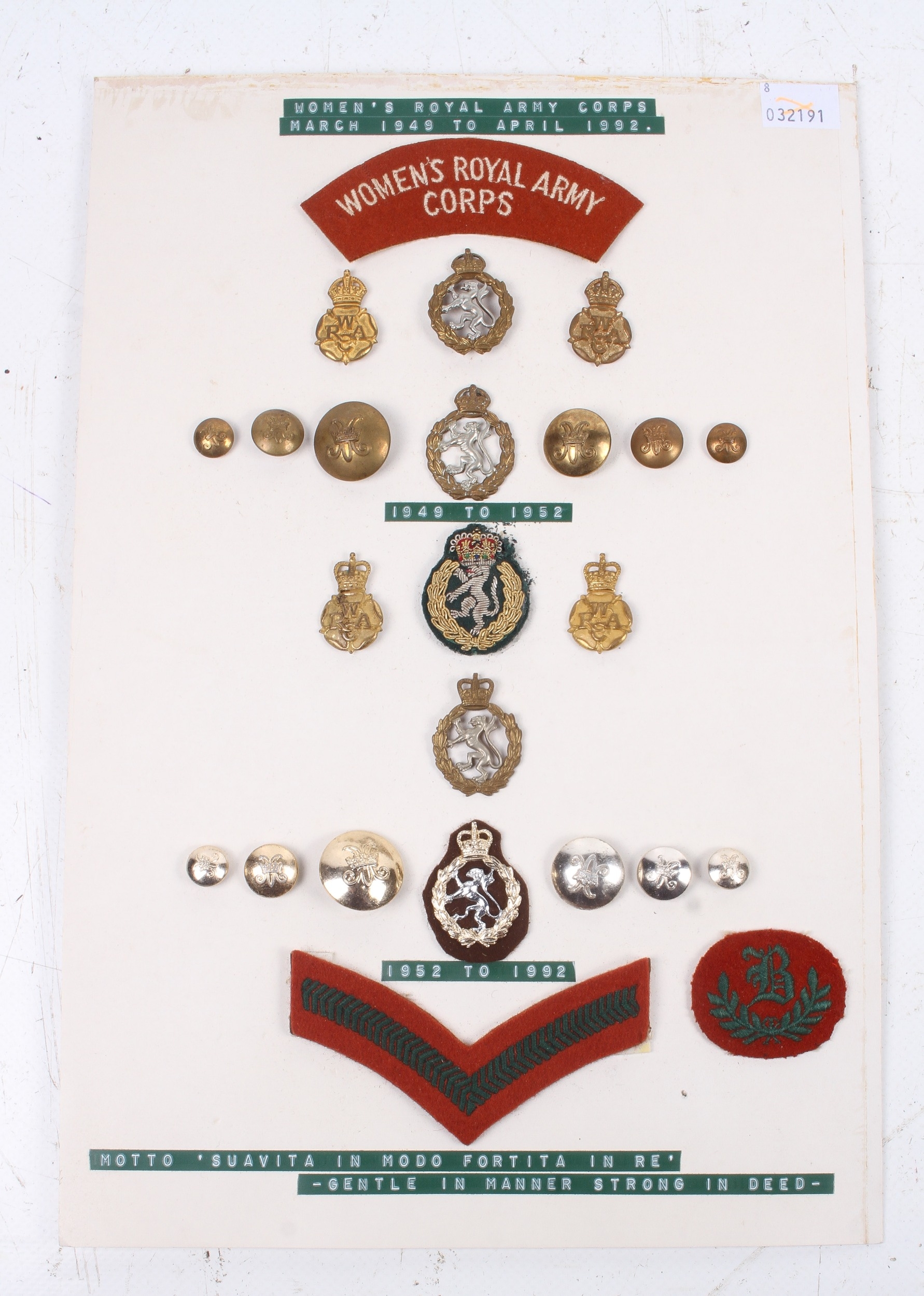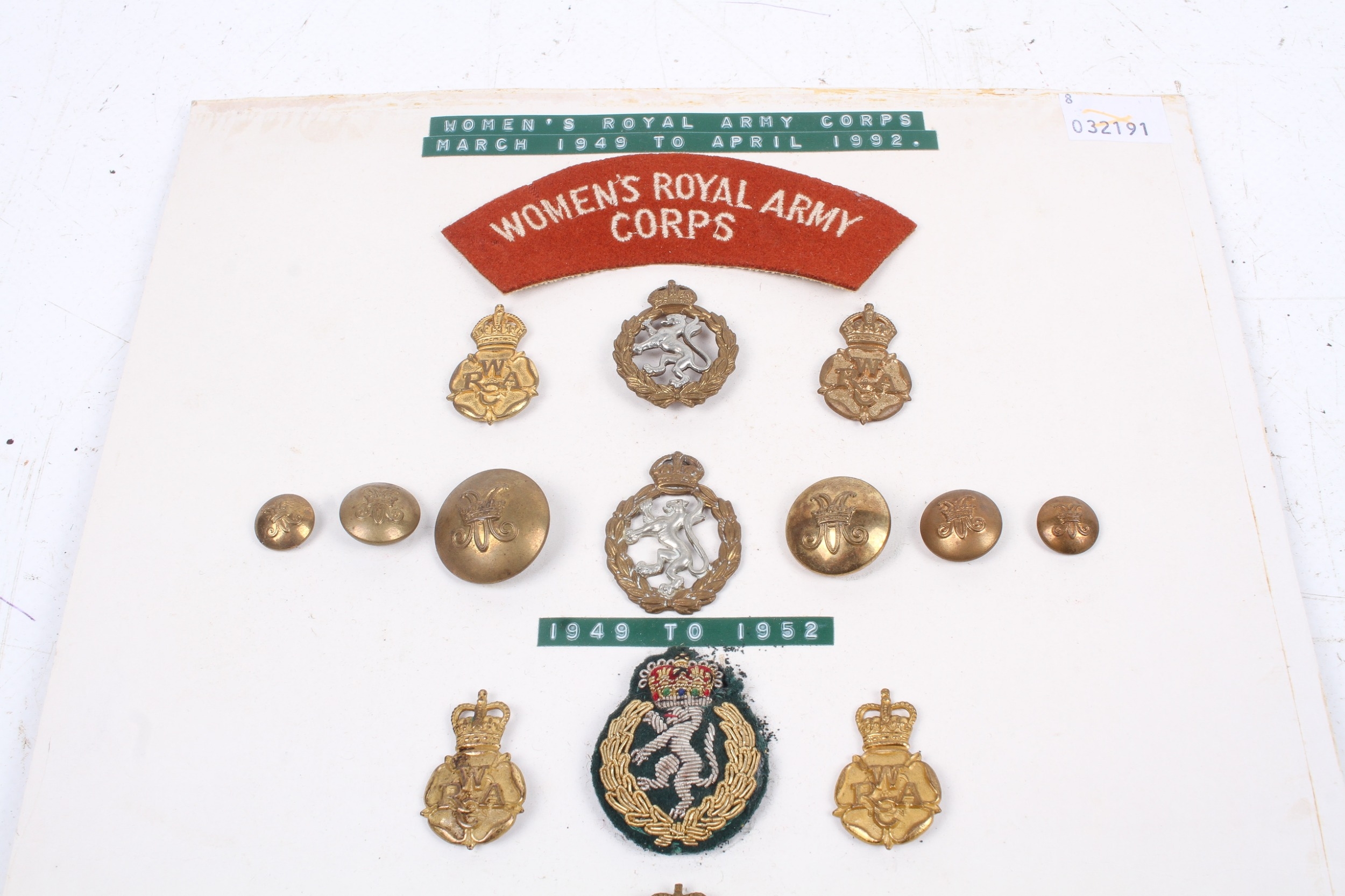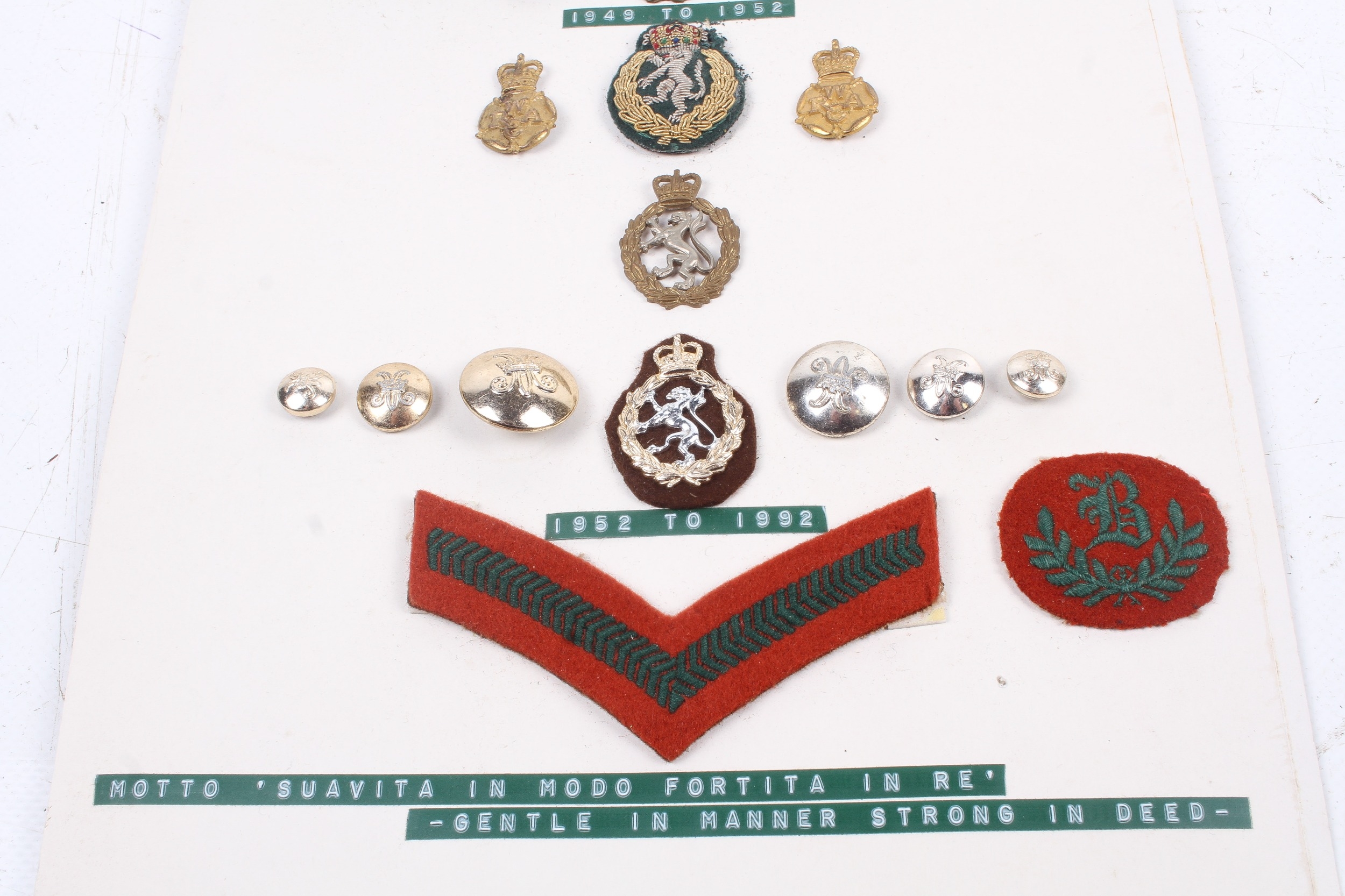 An assortment of British Women's Royal Army Corps 1949-1992 uniform accessories. Including cap badges, collar badges, cloth badges and buttons.