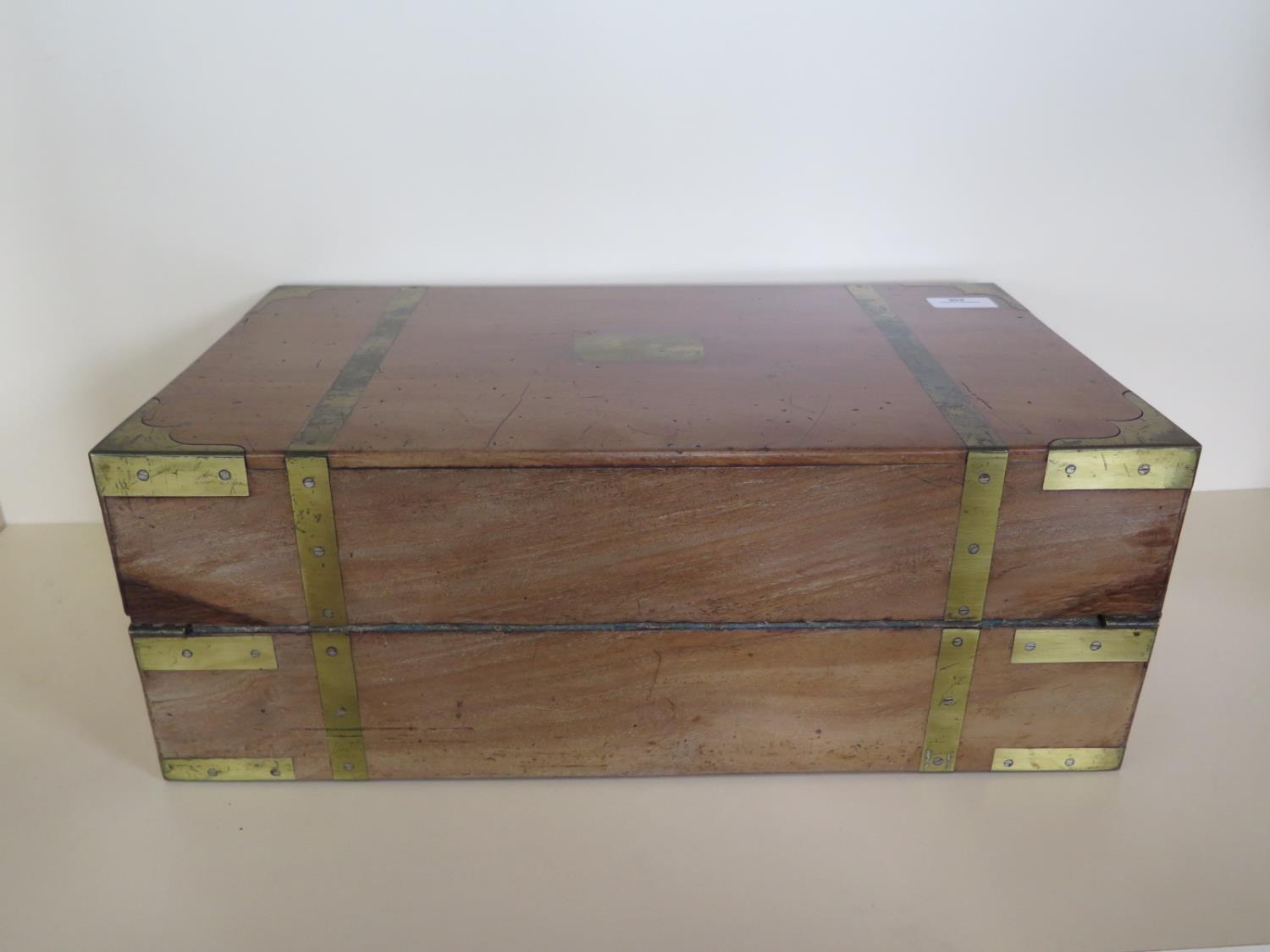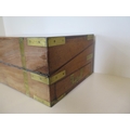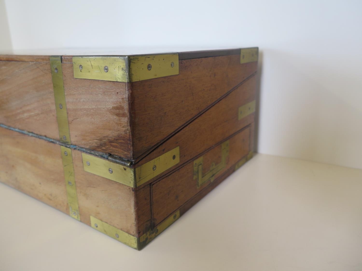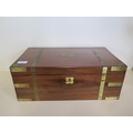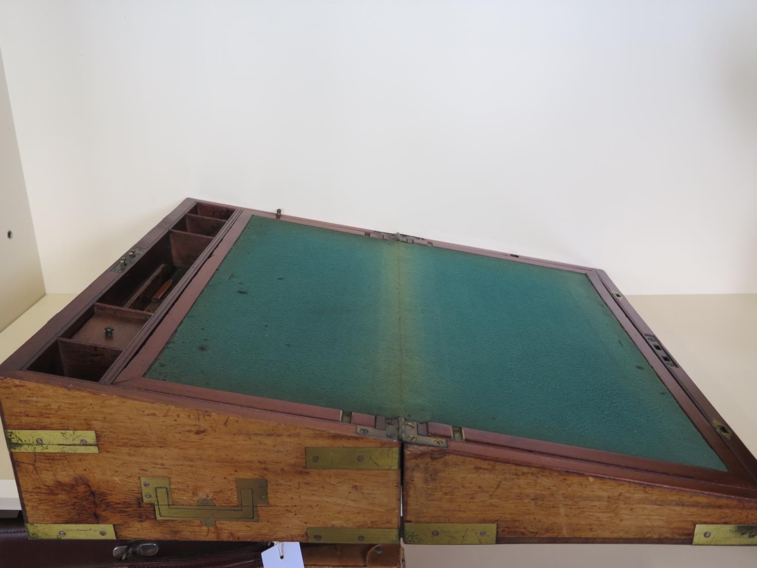 A 19th century brass bound mahogany writing slope with a fitted interior and a base drawer - Height 17cm x Width 45cm x Depth 26cm when closed - Makers label Edwards & Jones - generally good condition, normal usage marks consistent with age