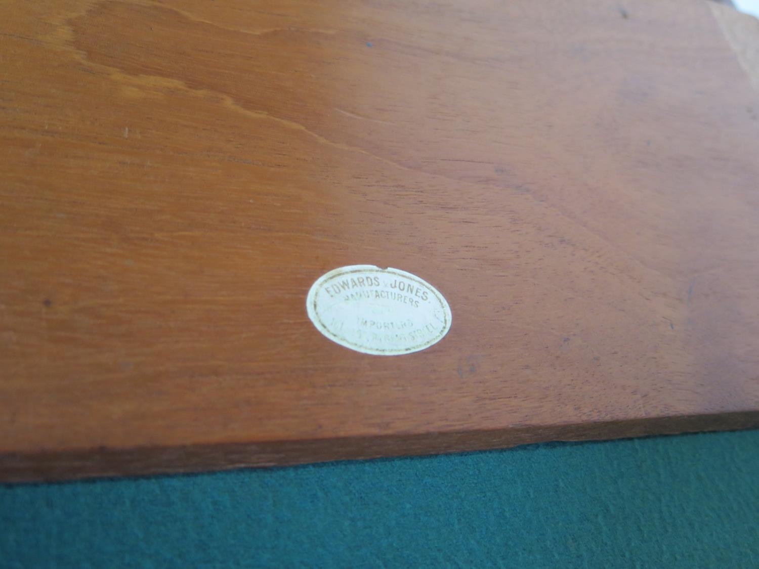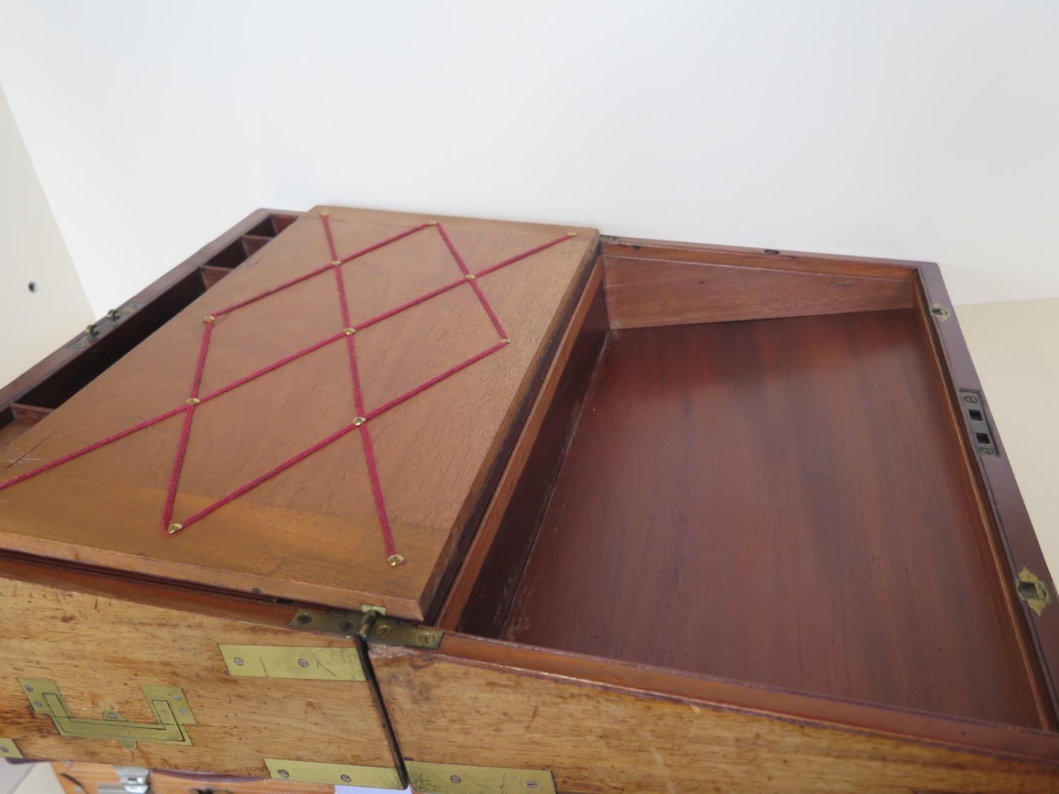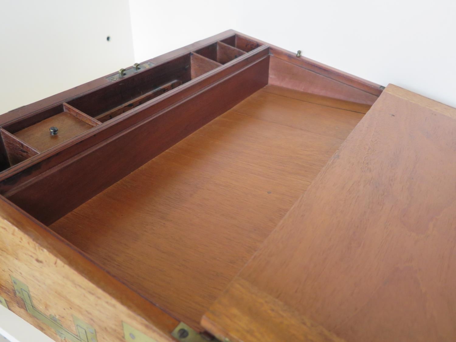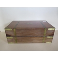 A 19th century brass bound mahogany writing slope with a fitted interior and a base drawer - Height 17cm x Width 45cm x Depth 26cm when closed - Makers label Edwards & Jones - generally good condition, normal usage marks consistent with age