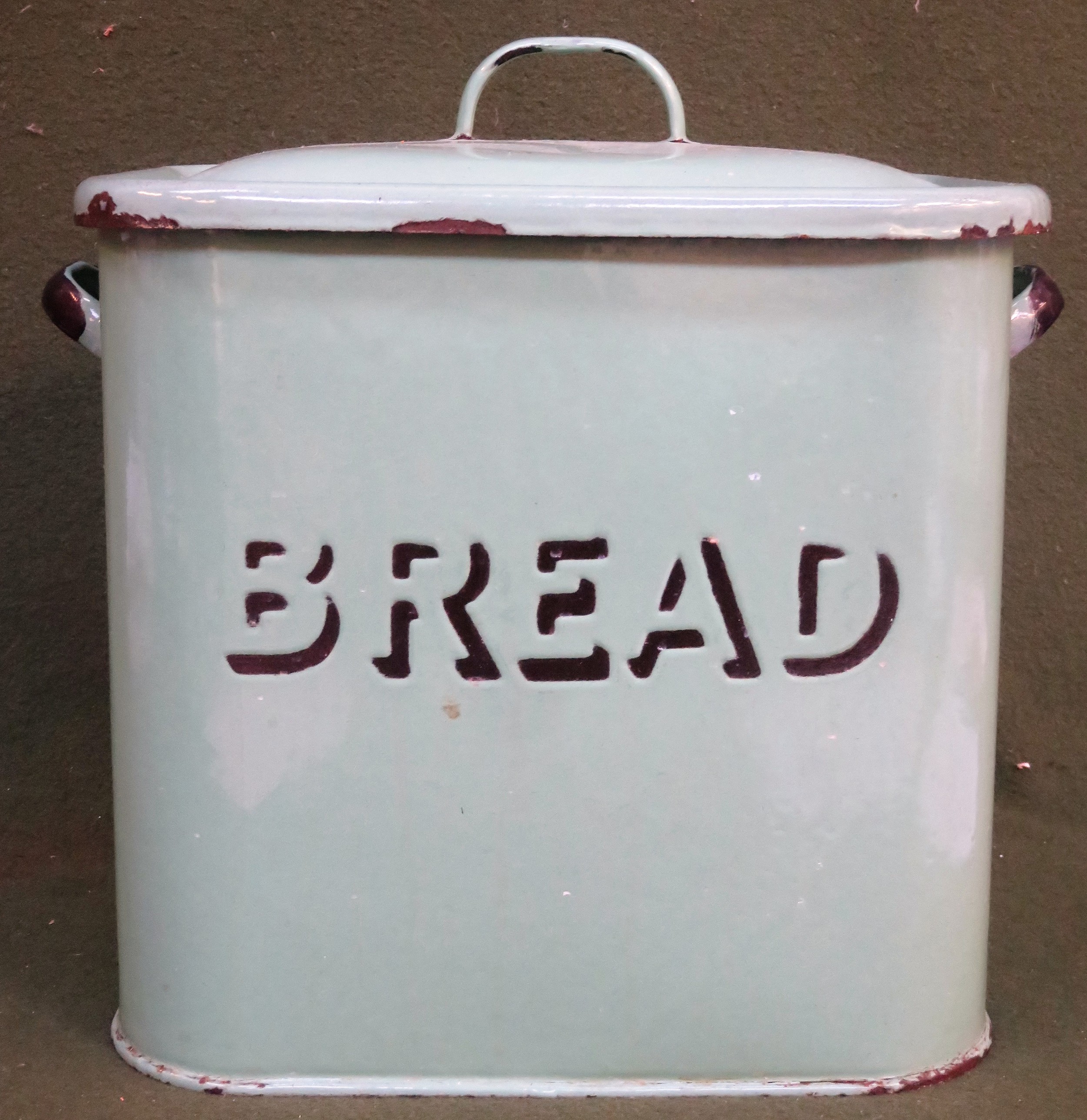 Vintage green enamelled bread bin. Approx. 35cms H