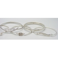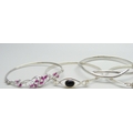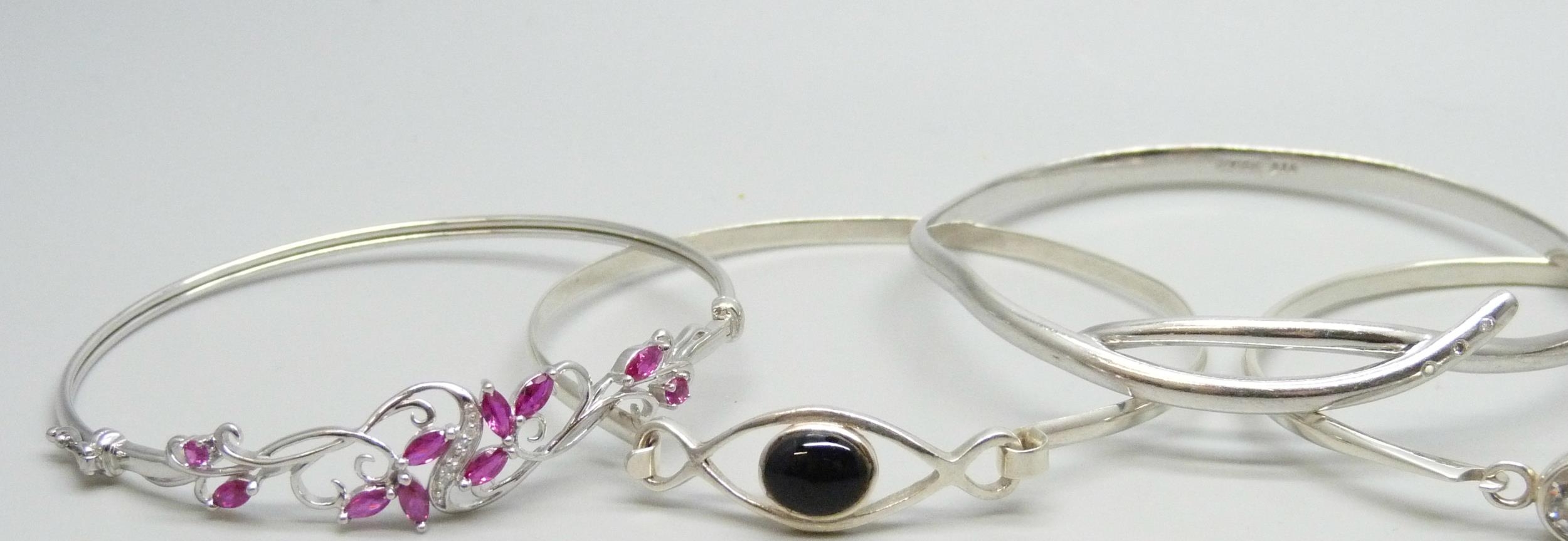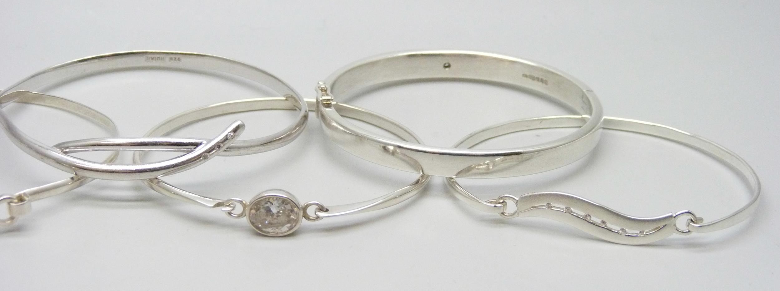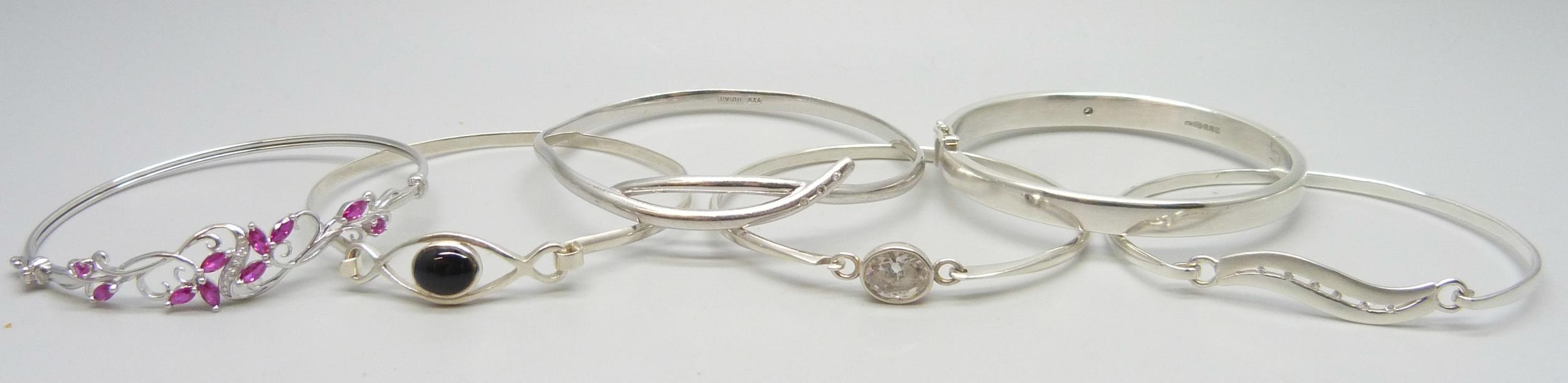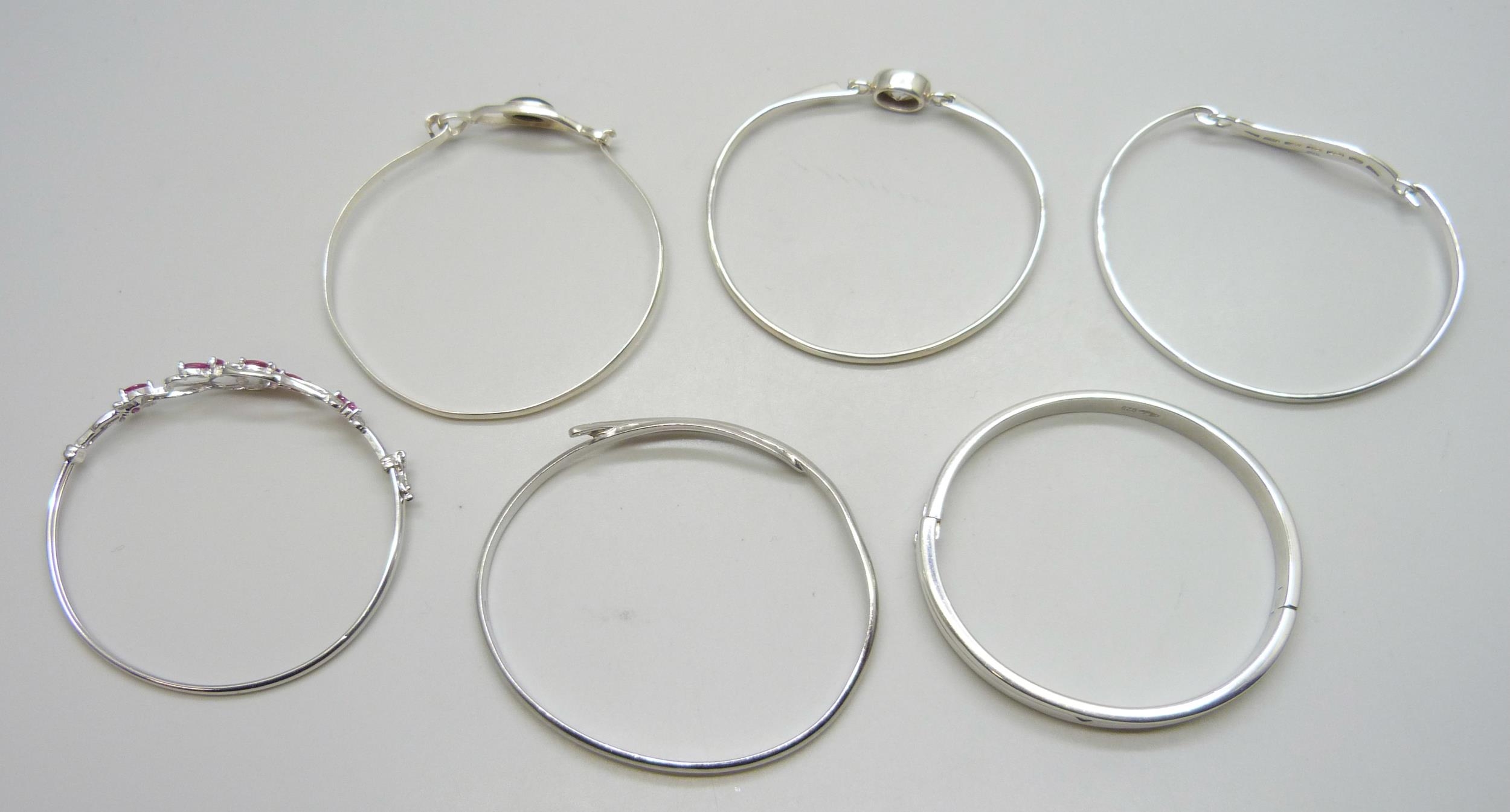 Six silver stone set bangles including two examples set with diamonds, 73g total