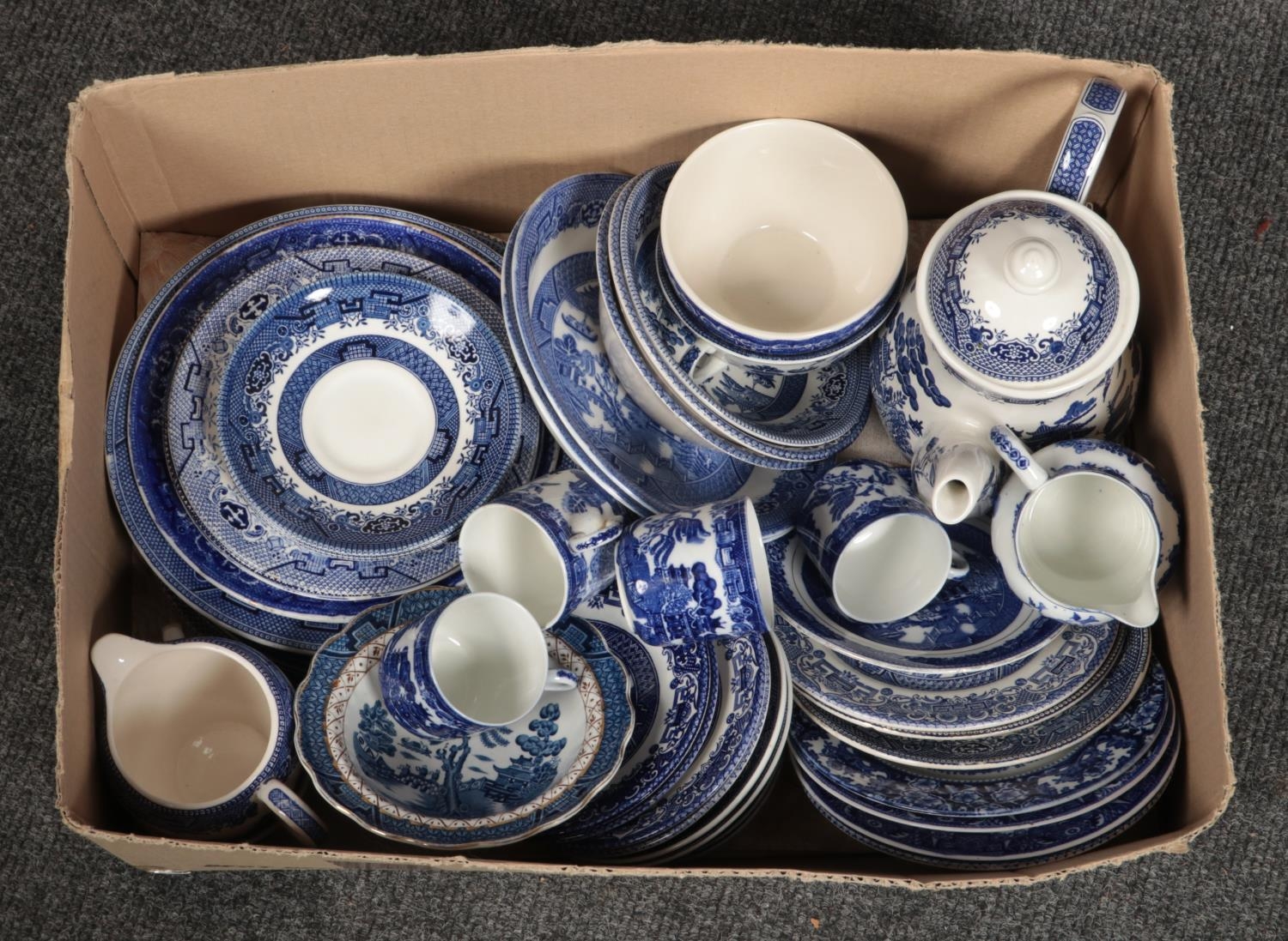 A collection of Blue & White dinnerwares, Booth's 'Real Old Willow', Churchill, Alfred Meakin examples