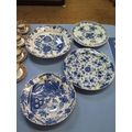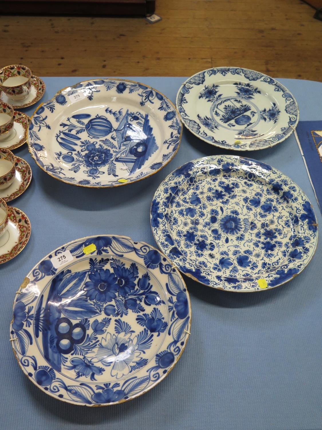 Four blue and white tin glazed chargers, with floral designs, largest 35.5 cm diameter, as found (4)