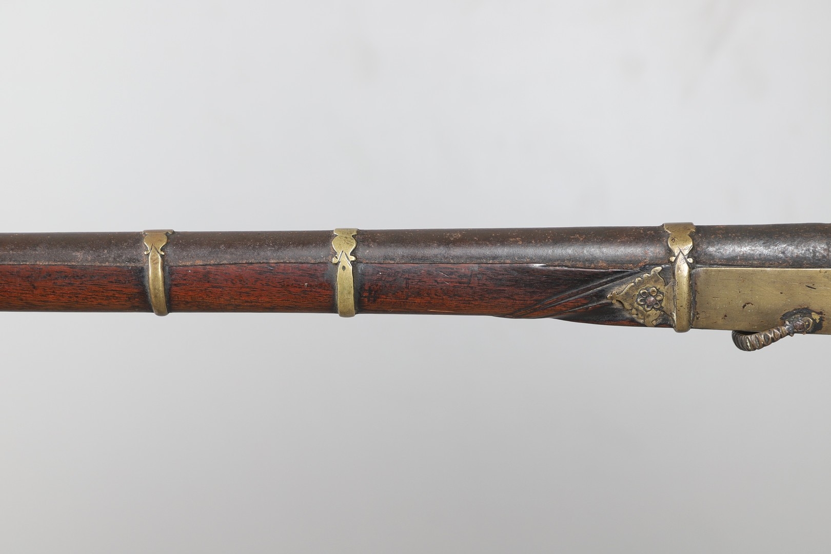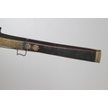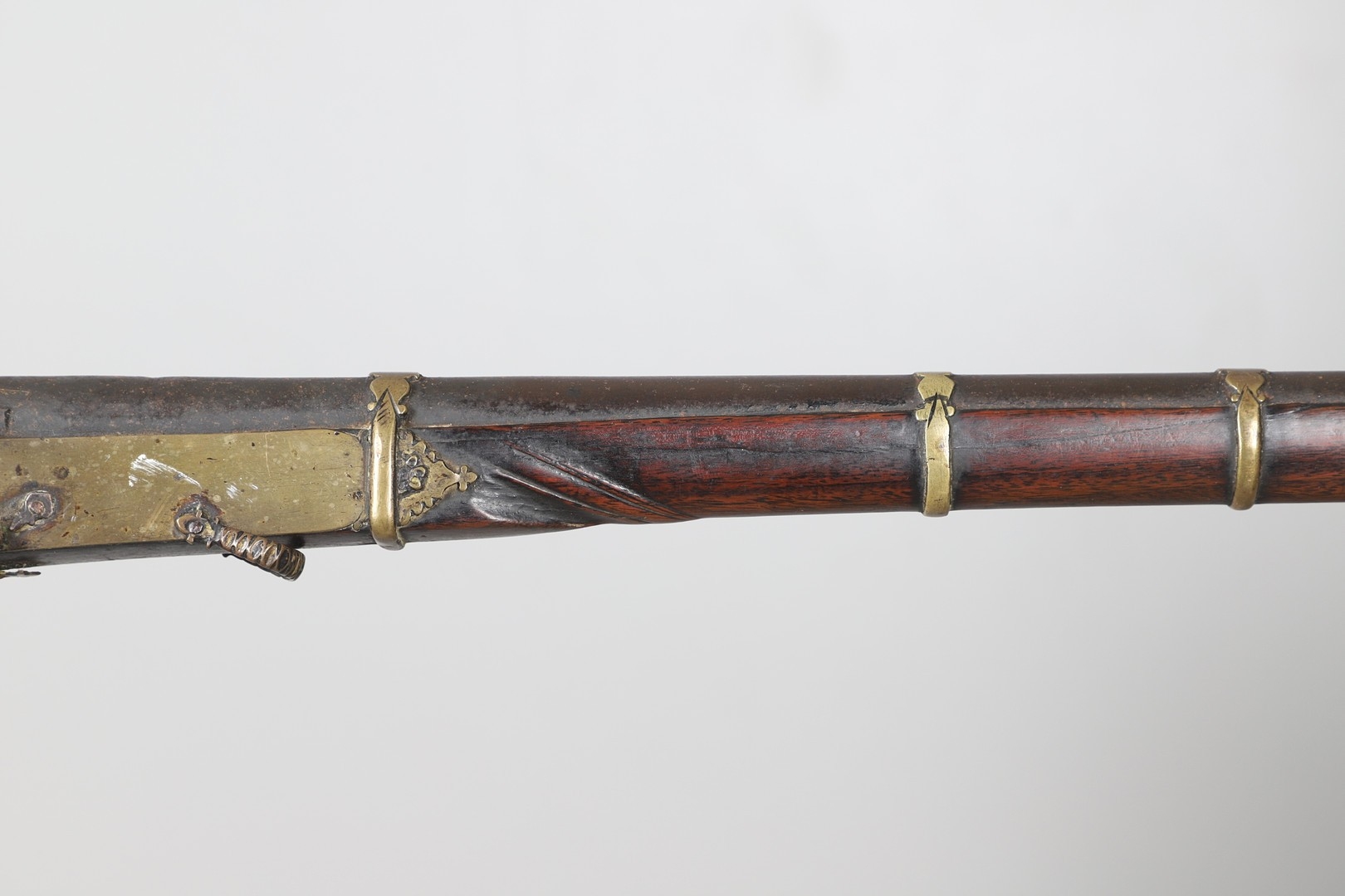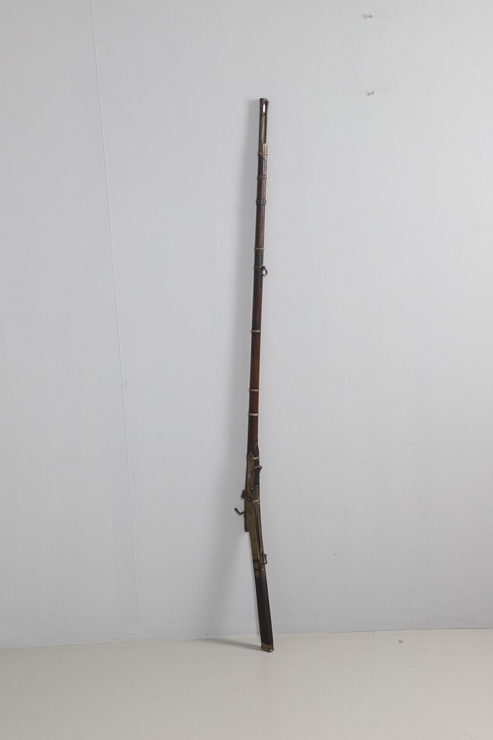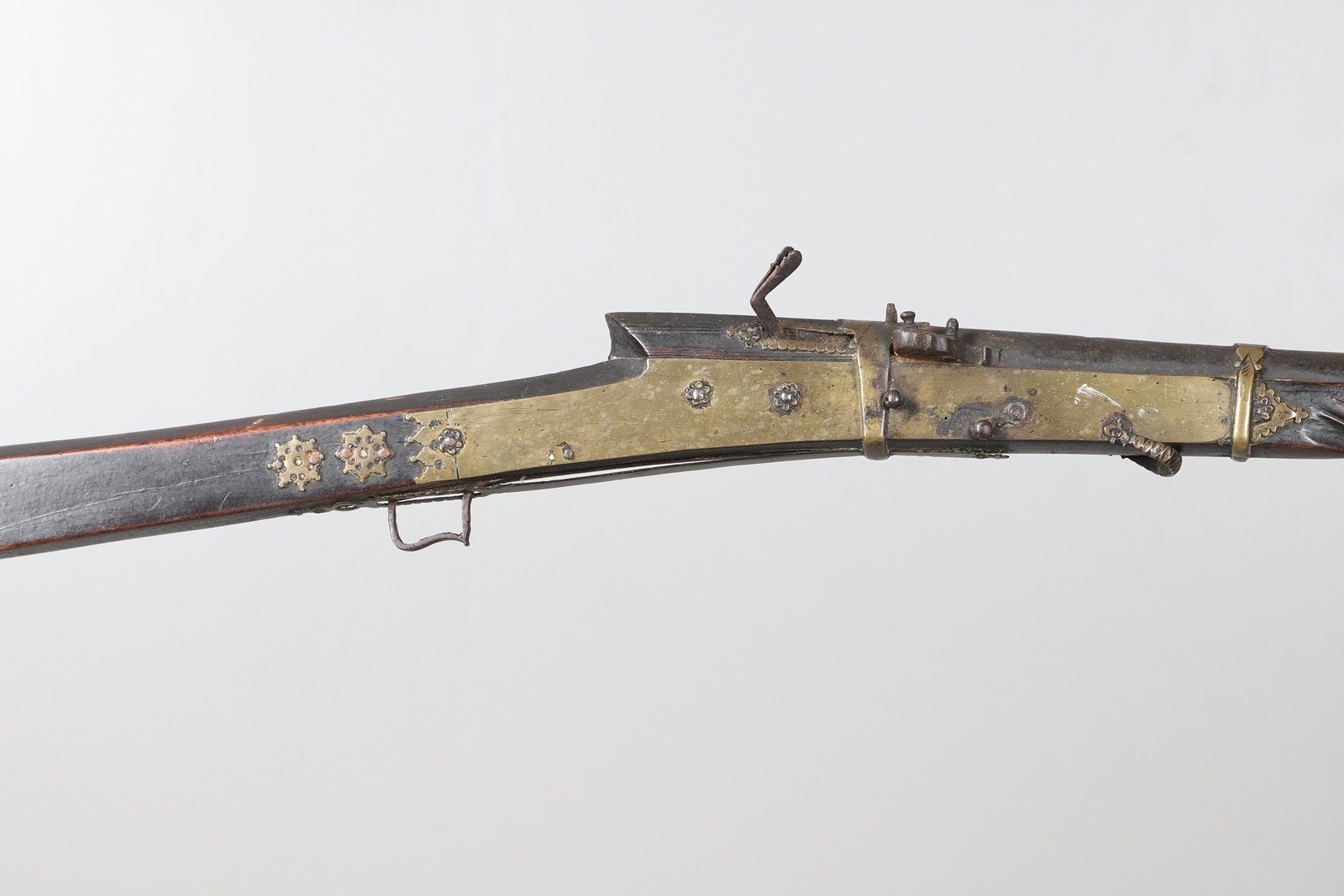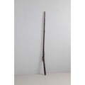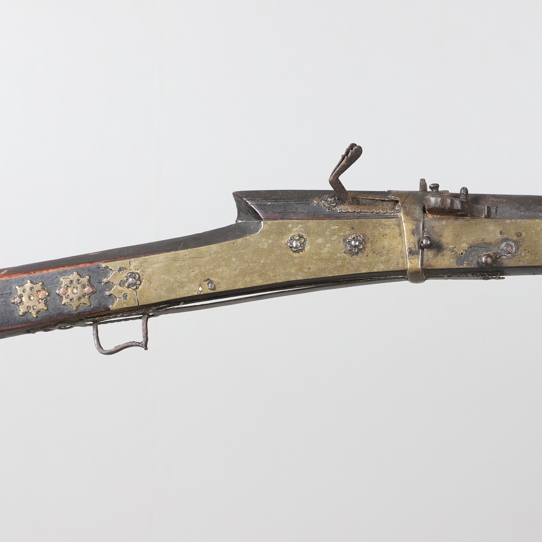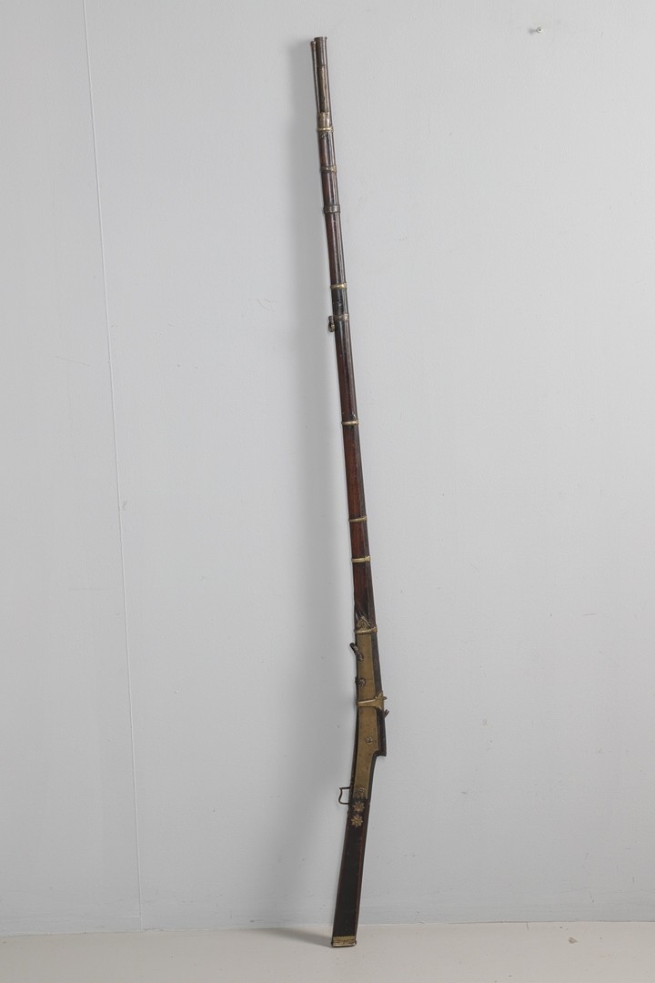 A MATCHLOCK MUSKET, TORADAR INDIA. The 125 cm tapering barrel with deep brown patination, approximately 17 mm at the muzzle, with ram rod below. The Matchlock firing action with decorative brass plates to either side. The barrel held to the stock with ten decorative brass 'capucines'. North central India, 171 cm. "The match used in the Indian gun is made from the coarse bark of the Koombhe tree, usually impregnated with a combustible materlial like saltpetre to produce a slow burning reasonably thin pliable match wound around the stock and fixed to the simple firing mechanism. When the trigger is pressed the burning match is lowered onto the flash pan igniting the charge firing the gun".