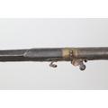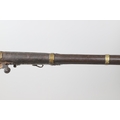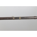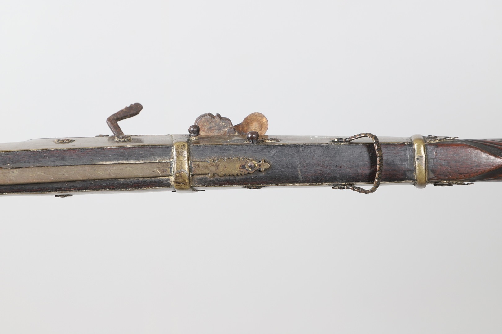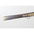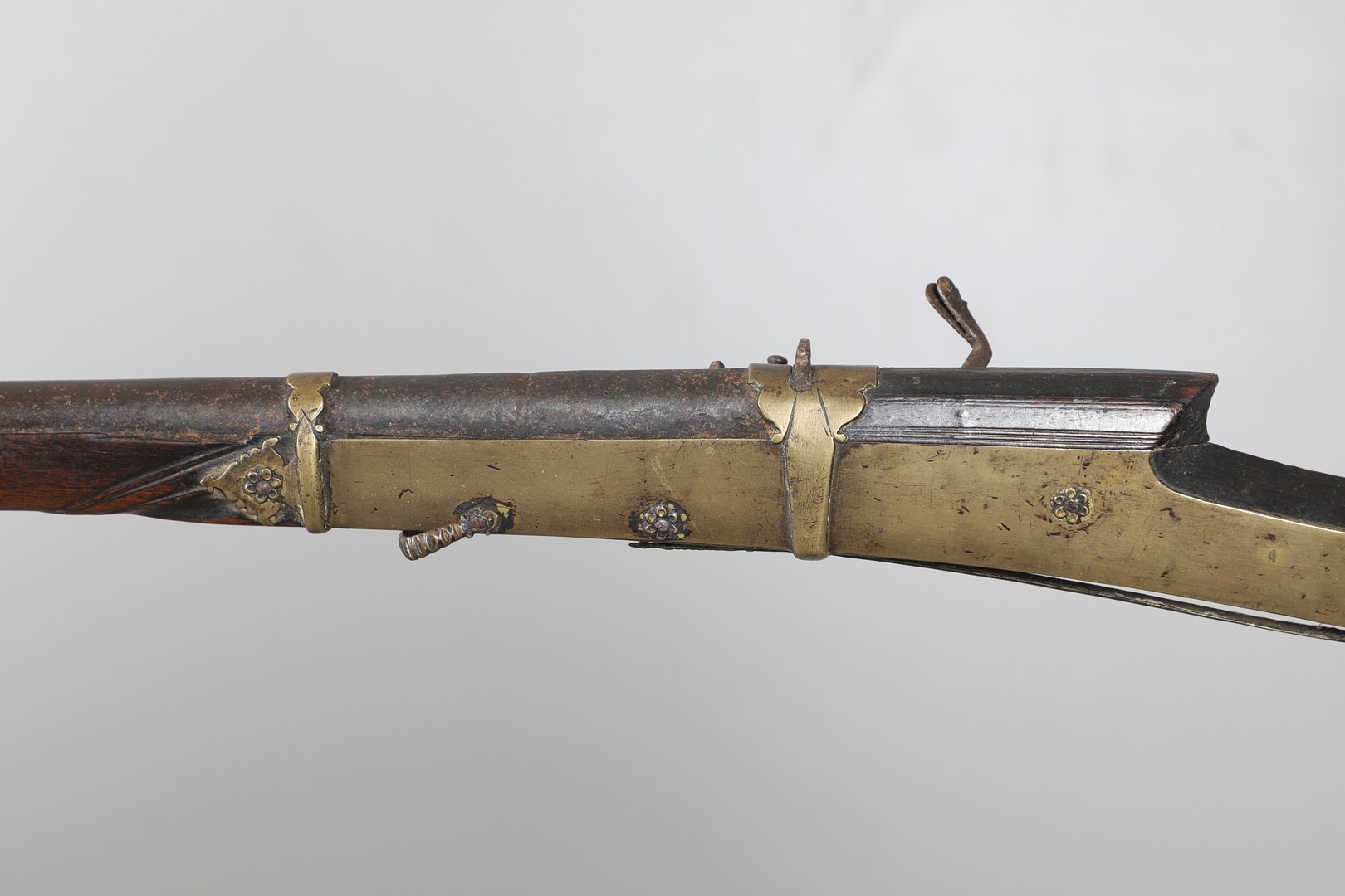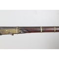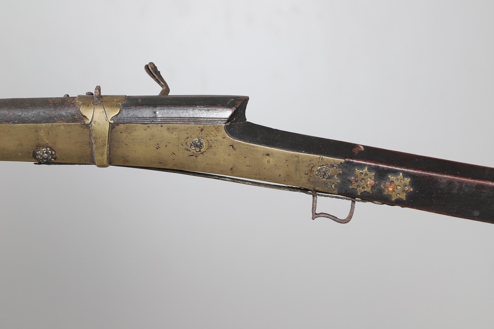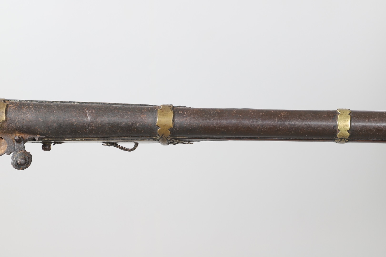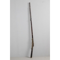 A MATCHLOCK MUSKET, TORADAR INDIA. The 125 cm tapering barrel with deep brown patination, approximately 17 mm at the muzzle, with ram rod below. The Matchlock firing action with decorative brass plates to either side. The barrel held to the stock with ten decorative brass 'capucines'. North central India, 171 cm. "The match used in the Indian gun is made from the coarse bark of the Koombhe tree, usually impregnated with a combustible materlial like saltpetre to produce a slow burning reasonably thin pliable match wound around the stock and fixed to the simple firing mechanism. When the trigger is pressed the burning match is lowered onto the flash pan igniting the charge firing the gun".