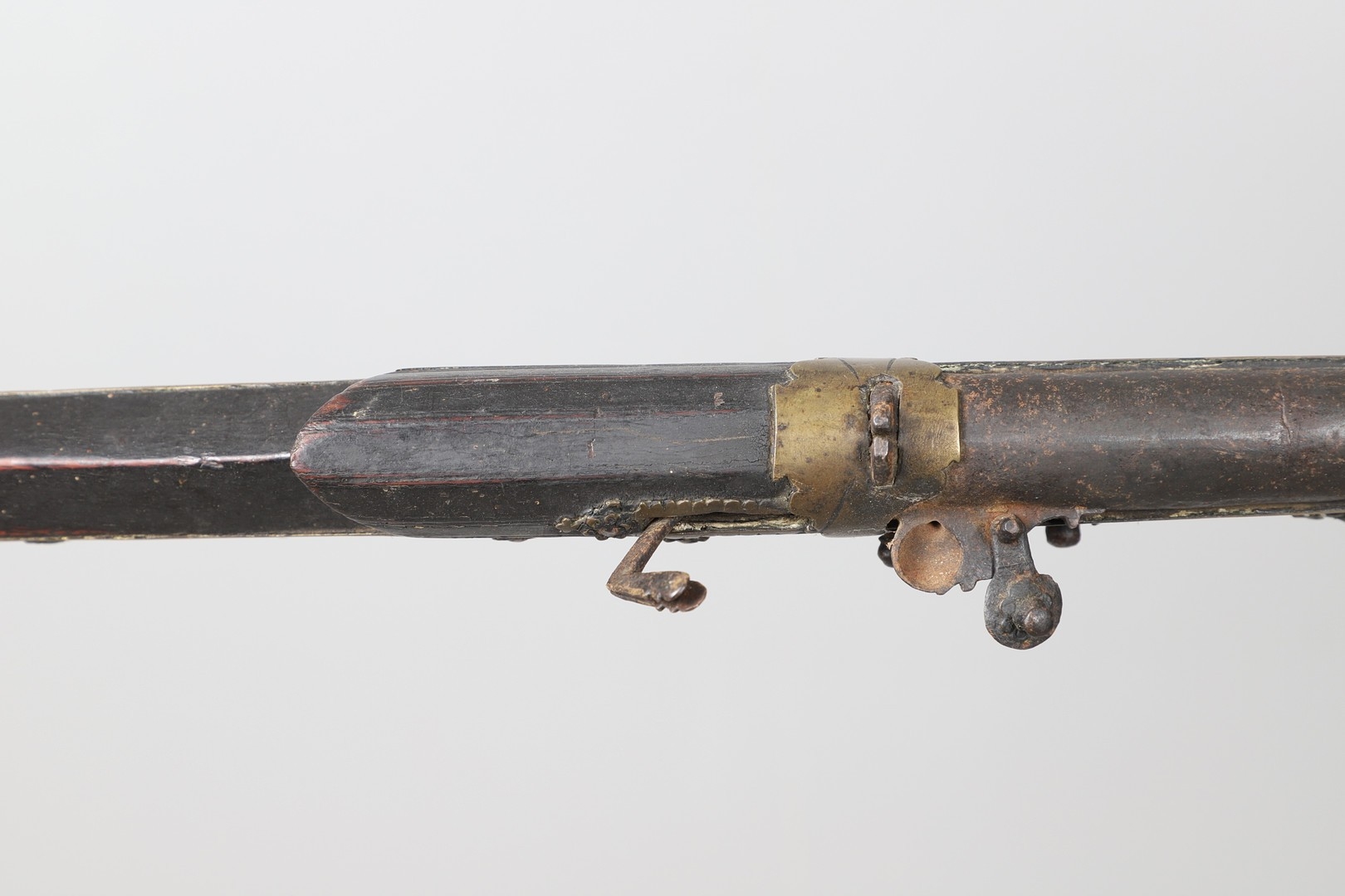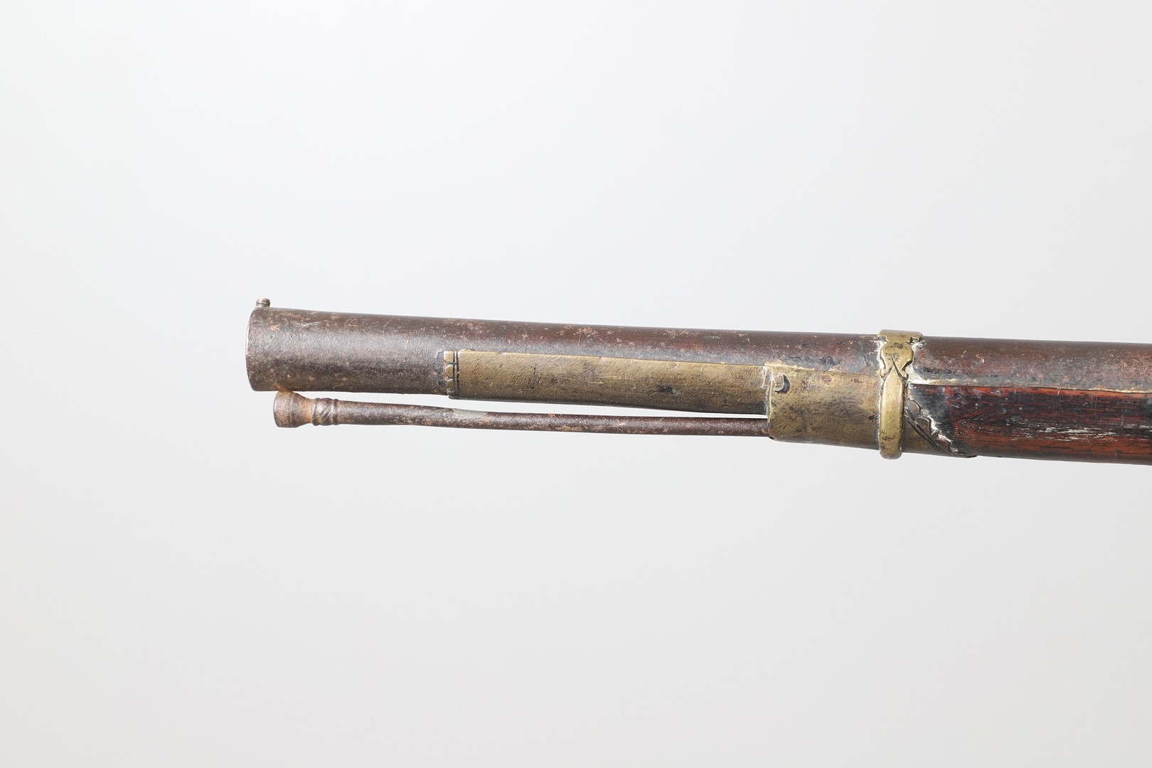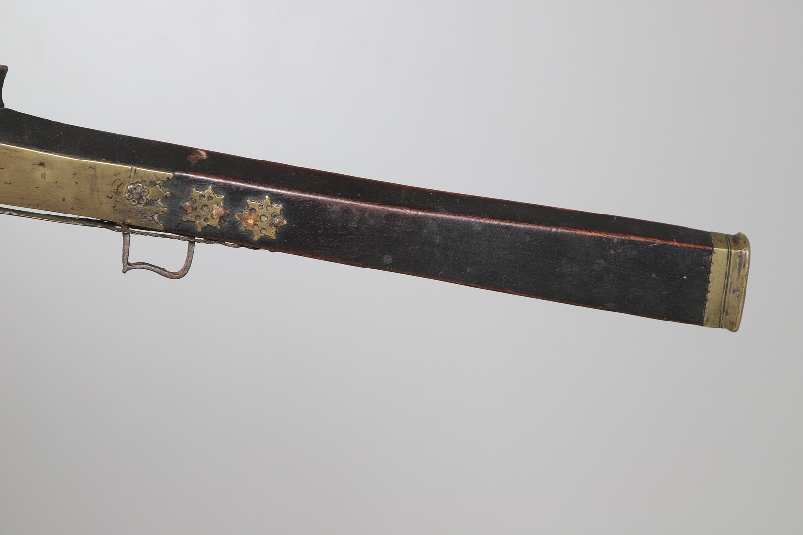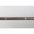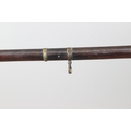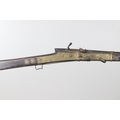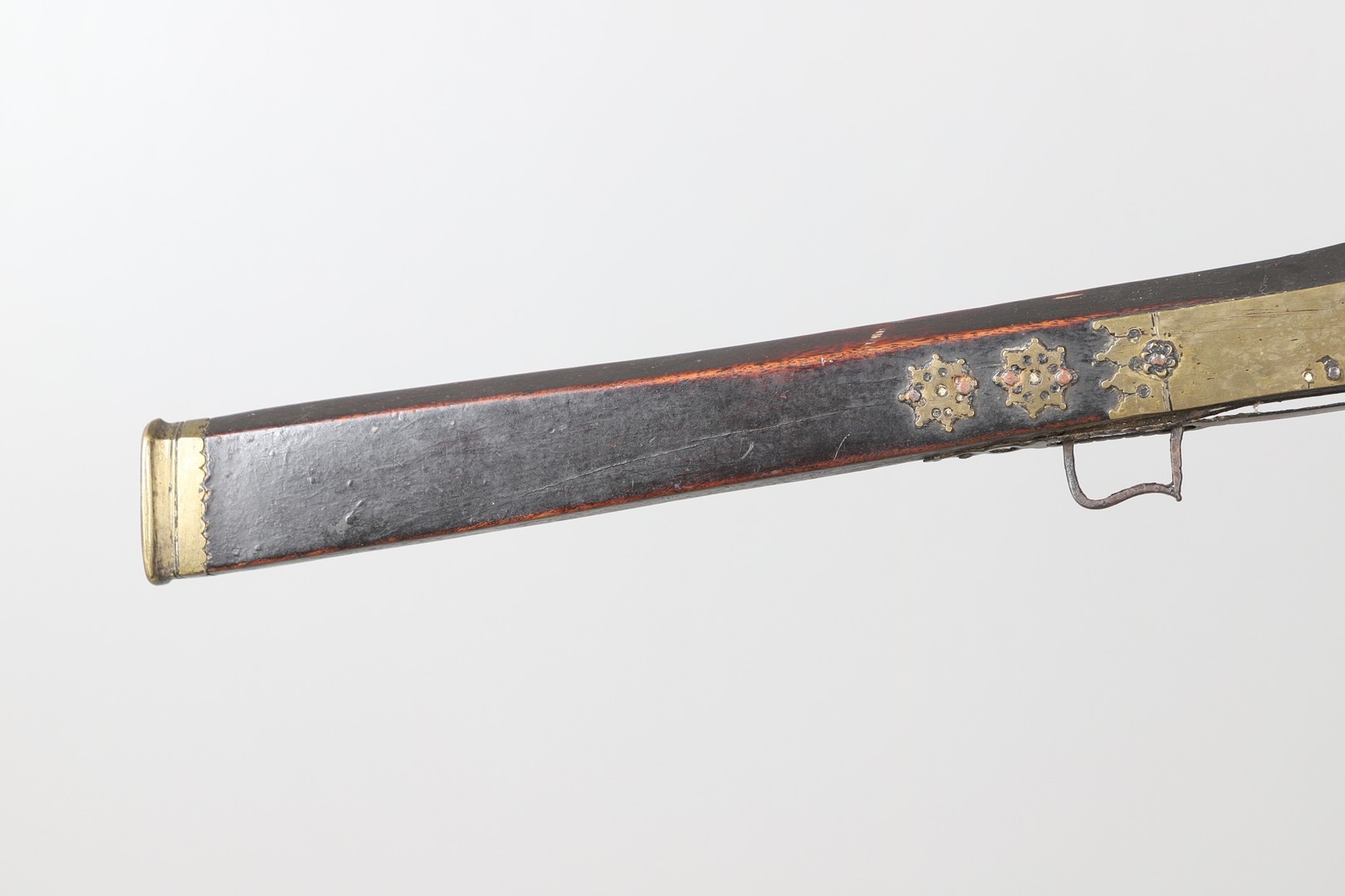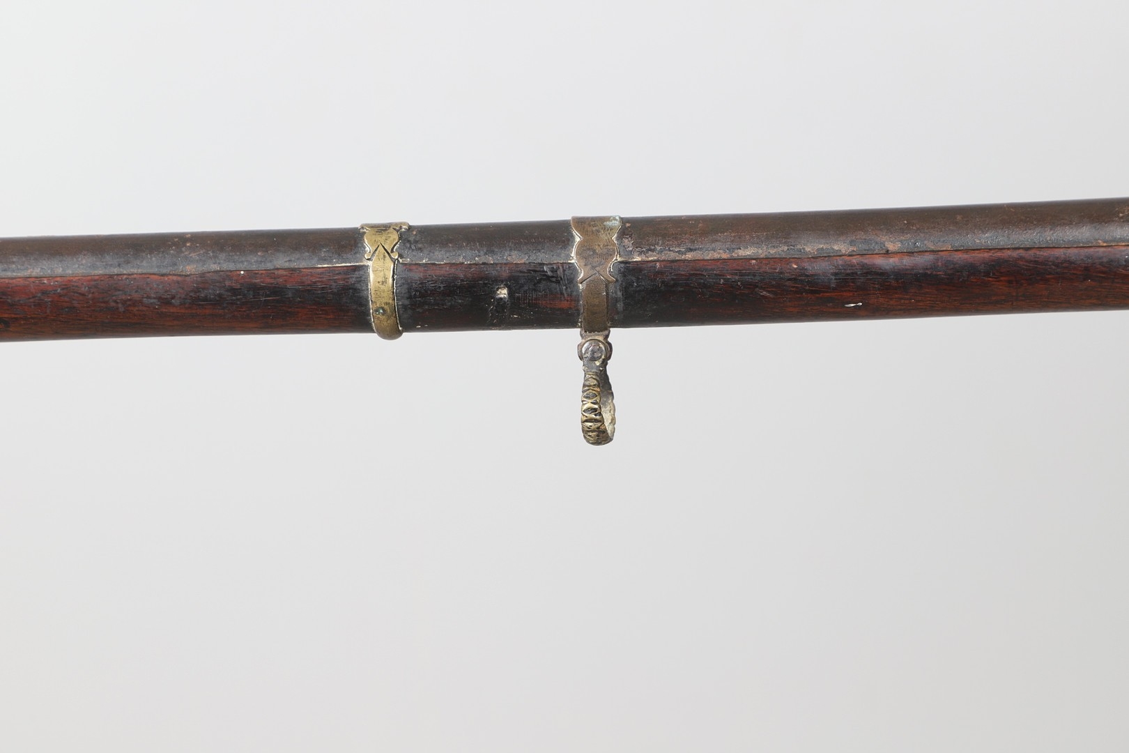 A MATCHLOCK MUSKET, TORADAR INDIA. The 125 cm tapering barrel with deep brown patination, approximately 17 mm at the muzzle, with ram rod below. The Matchlock firing action with decorative brass plates to either side. The barrel held to the stock with ten decorative brass 'capucines'. North central India, 171 cm. "The match used in the Indian gun is made from the coarse bark of the Koombhe tree, usually impregnated with a combustible materlial like saltpetre to produce a slow burning reasonably thin pliable match wound around the stock and fixed to the simple firing mechanism. When the trigger is pressed the burning match is lowered onto the flash pan igniting the charge firing the gun".