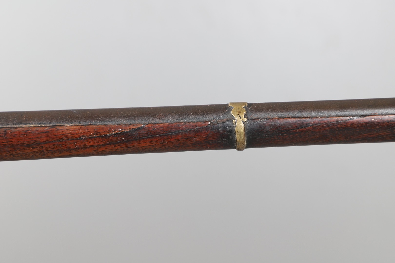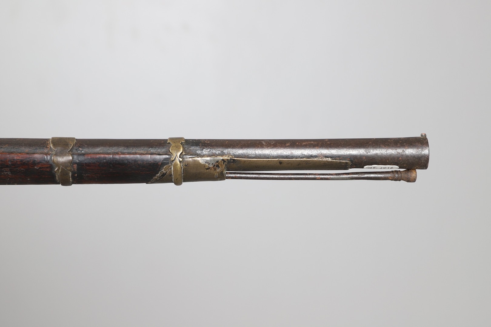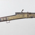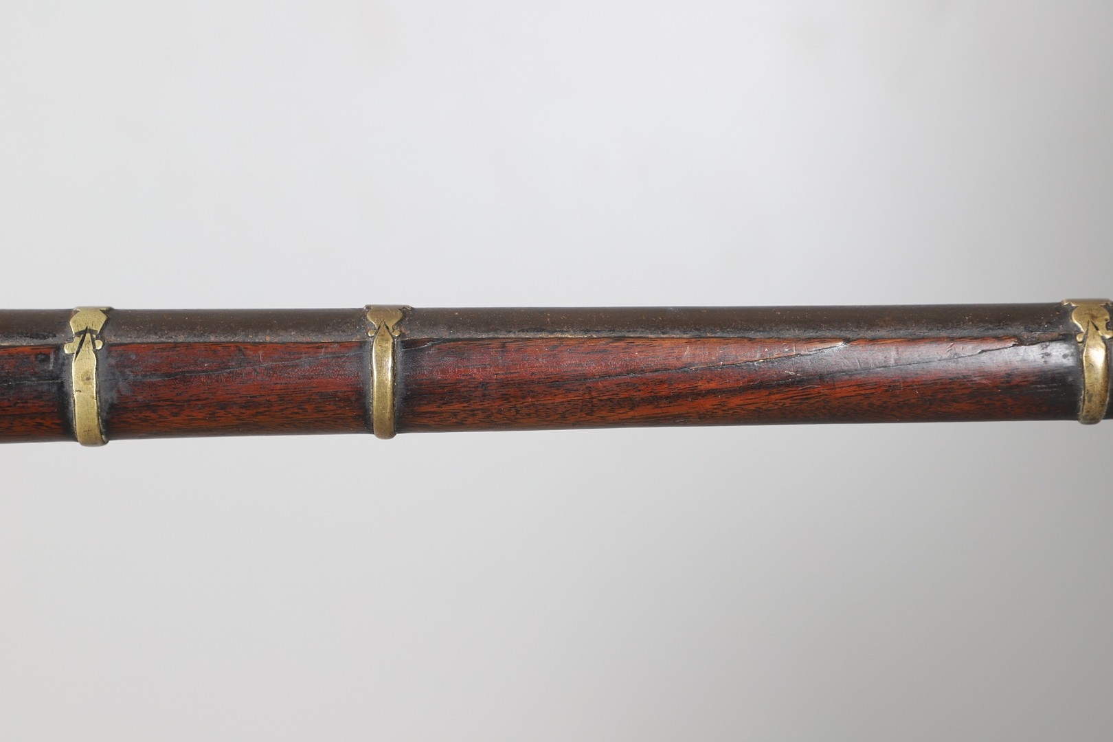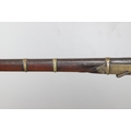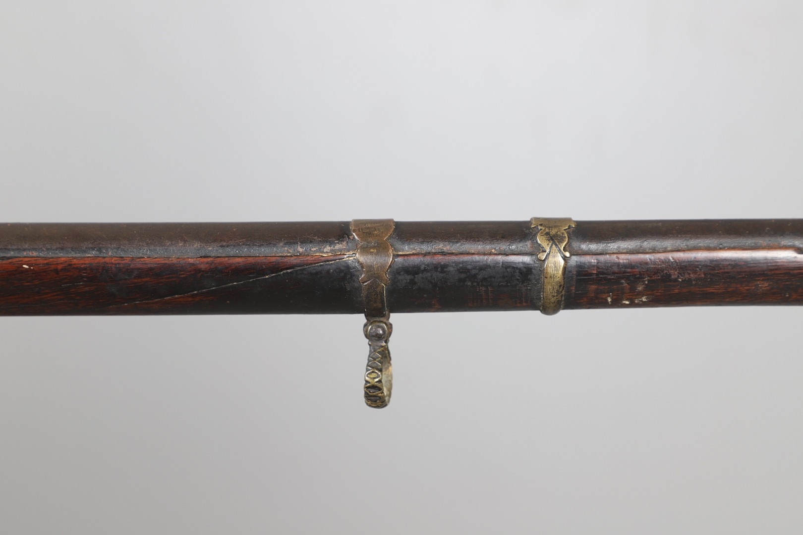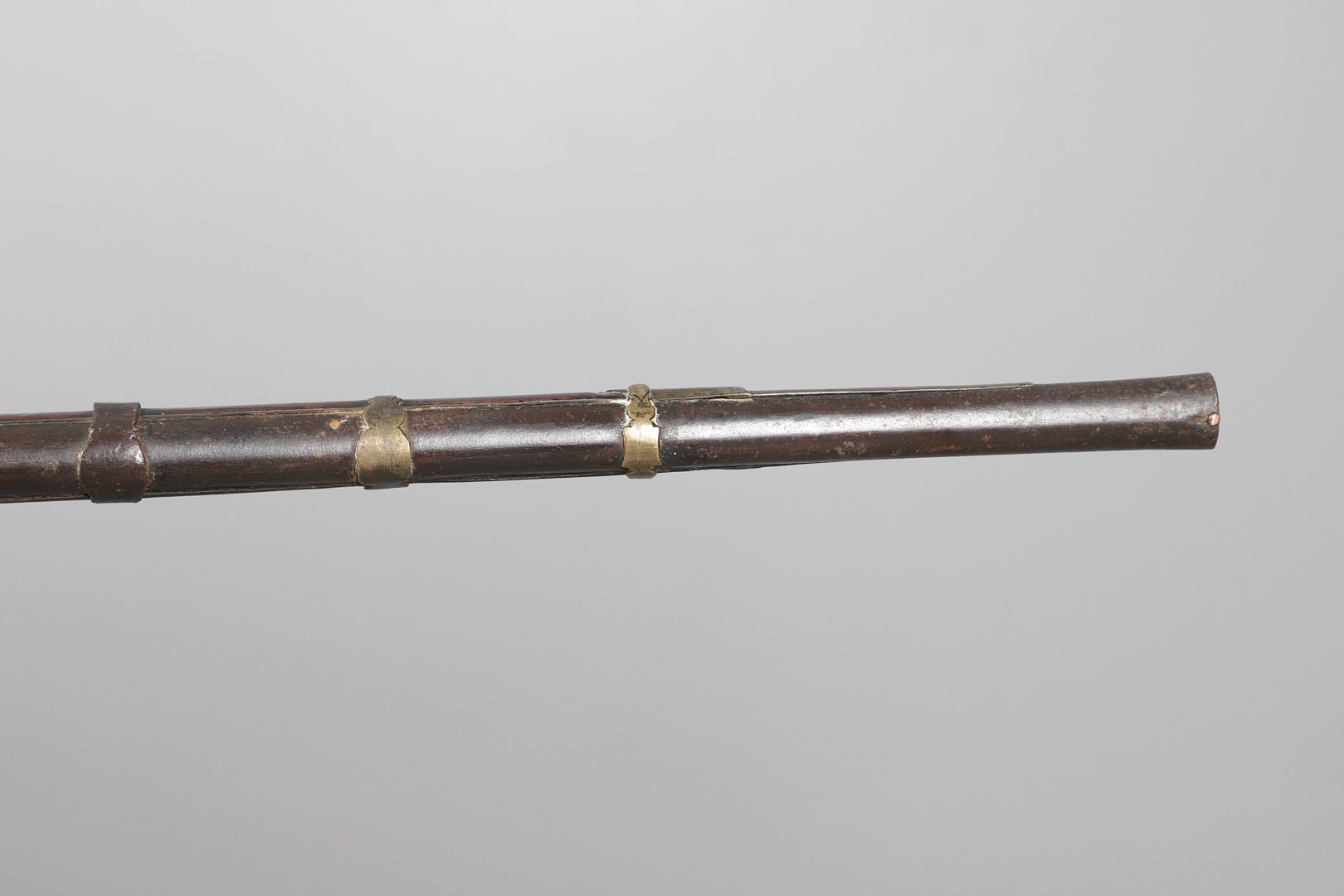 A MATCHLOCK MUSKET, TORADAR INDIA. The 125 cm tapering barrel with deep brown patination, approximately 17 mm at the muzzle, with ram rod below. The Matchlock firing action with decorative brass plates to either side. The barrel held to the stock with ten decorative brass 'capucines'. North central India, 171 cm. "The match used in the Indian gun is made from the coarse bark of the Koombhe tree, usually impregnated with a combustible materlial like saltpetre to produce a slow burning reasonably thin pliable match wound around the stock and fixed to the simple firing mechanism. When the trigger is pressed the burning match is lowered onto the flash pan igniting the charge firing the gun".