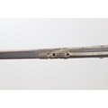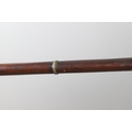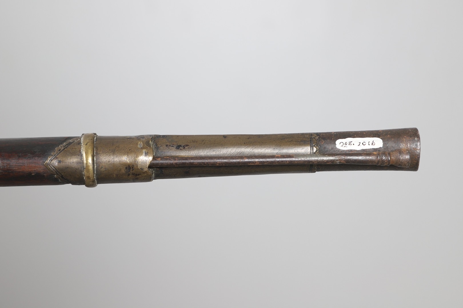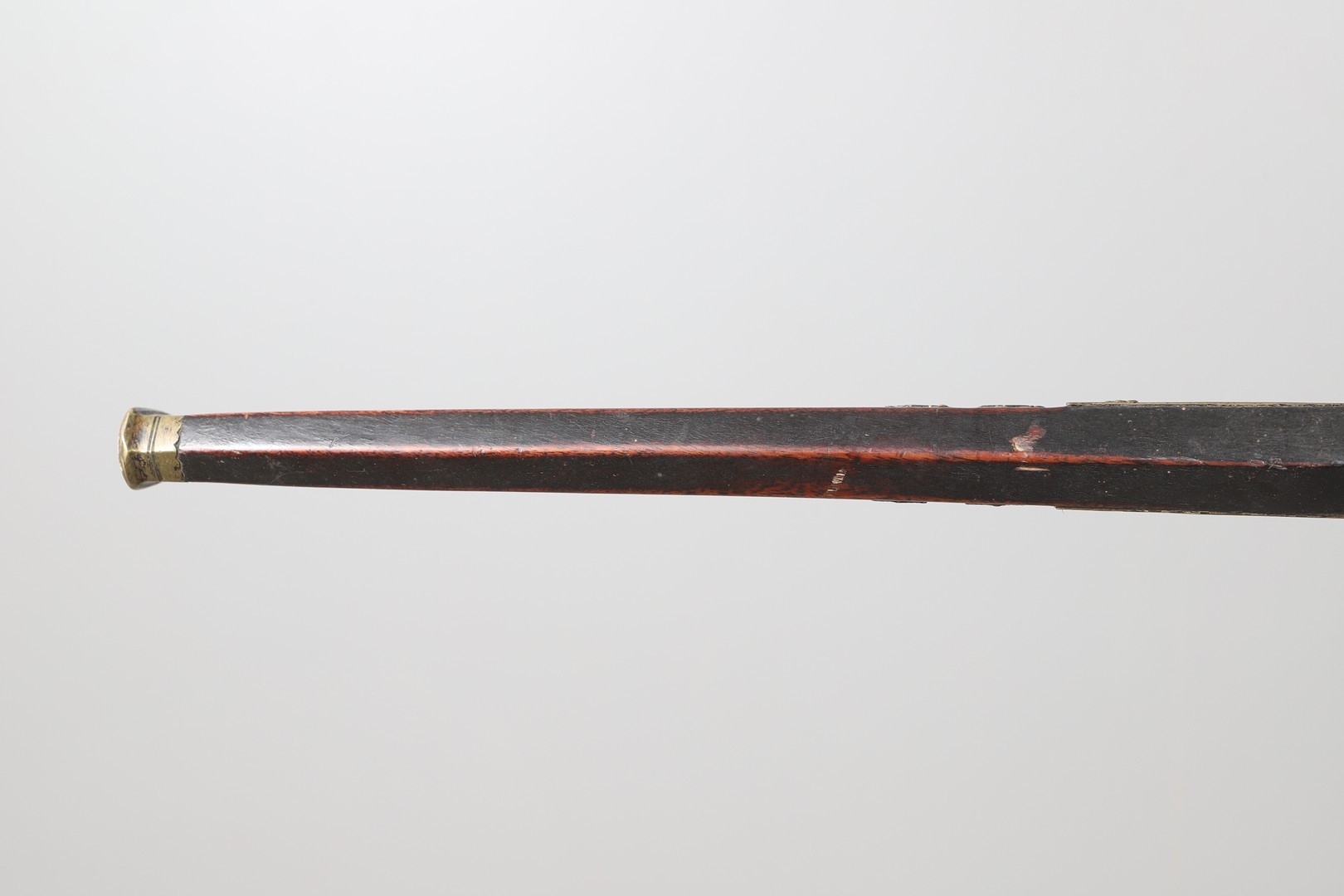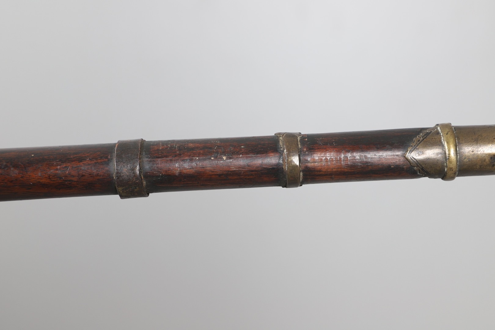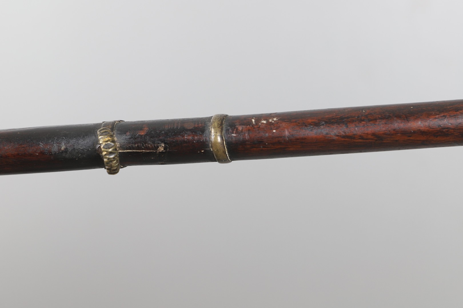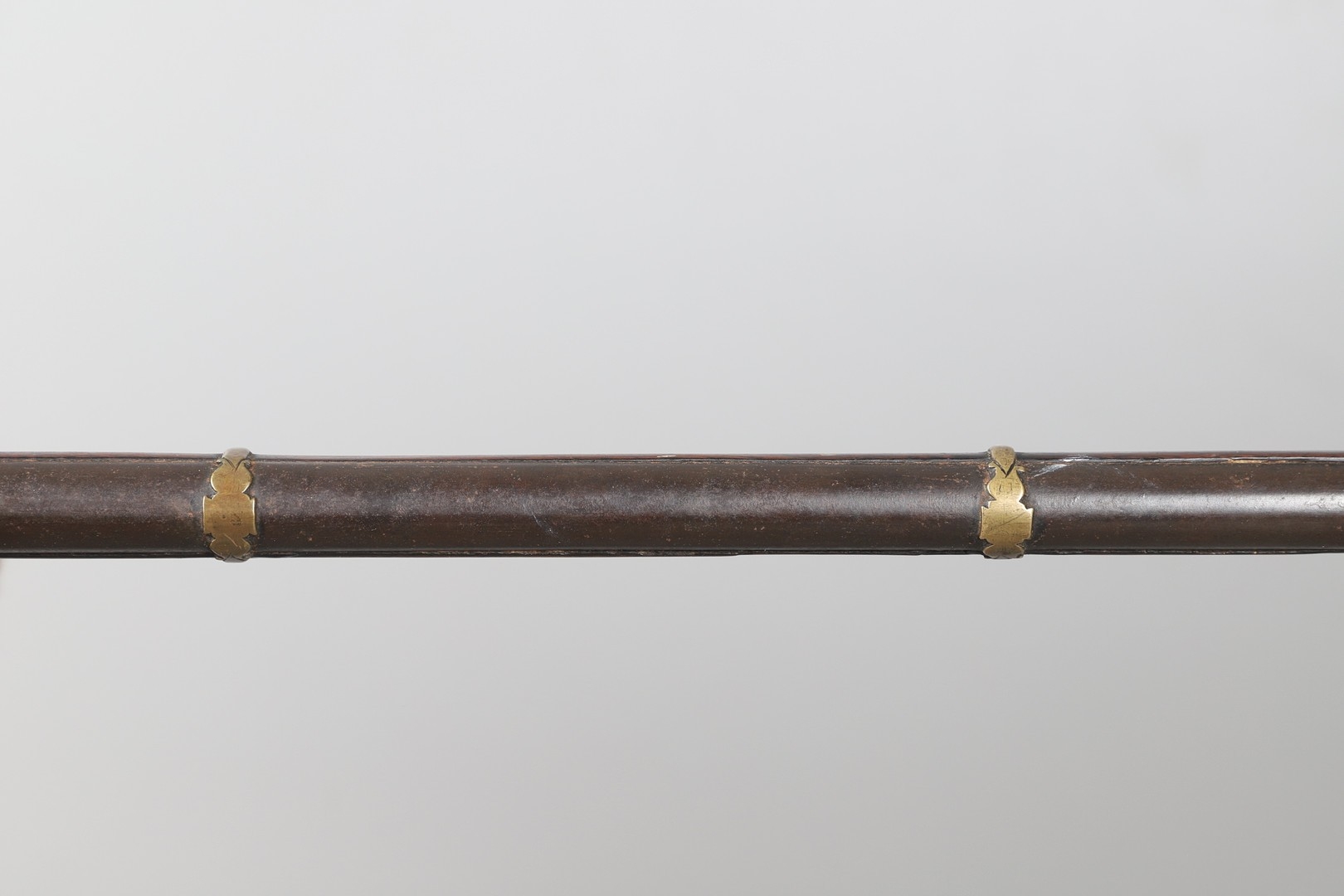 A MATCHLOCK MUSKET, TORADAR INDIA. The 125 cm tapering barrel with deep brown patination, approximately 17 mm at the muzzle, with ram rod below. The Matchlock firing action with decorative brass plates to either side. The barrel held to the stock with ten decorative brass 'capucines'. North central India, 171 cm. "The match used in the Indian gun is made from the coarse bark of the Koombhe tree, usually impregnated with a combustible materlial like saltpetre to produce a slow burning reasonably thin pliable match wound around the stock and fixed to the simple firing mechanism. When the trigger is pressed the burning match is lowered onto the flash pan igniting the charge firing the gun".