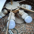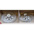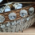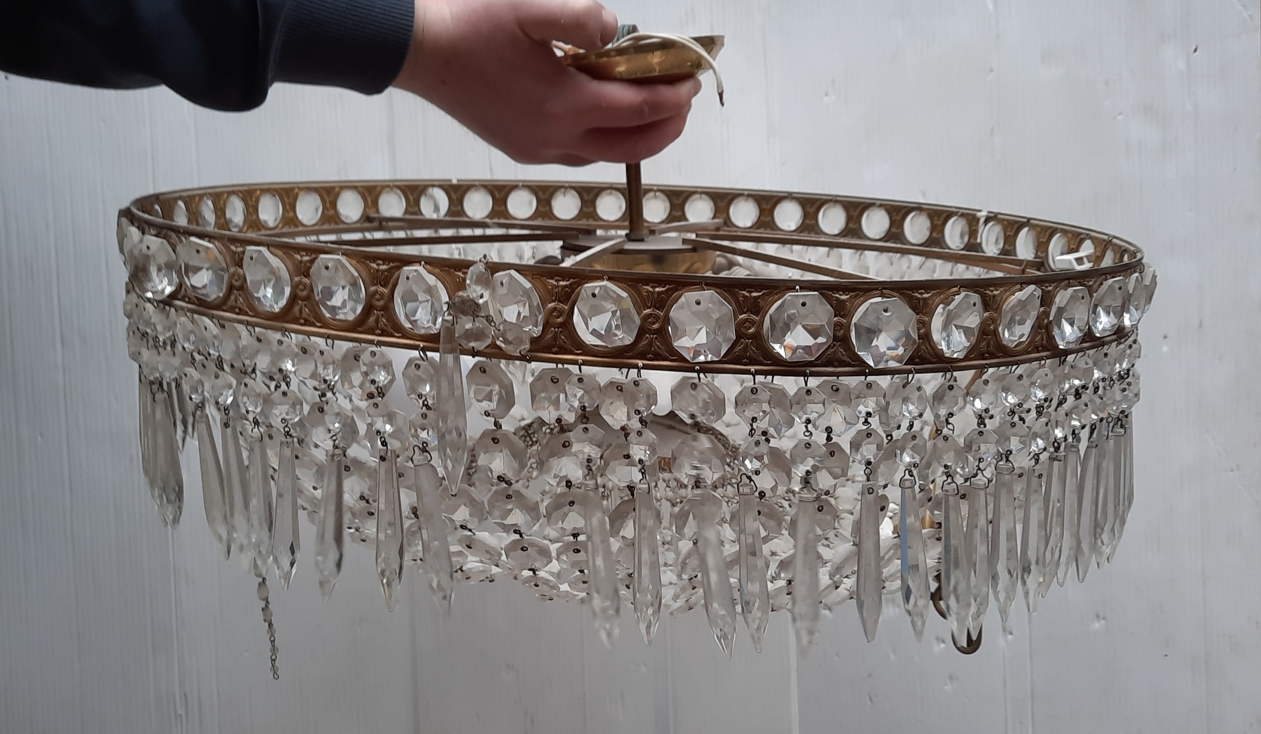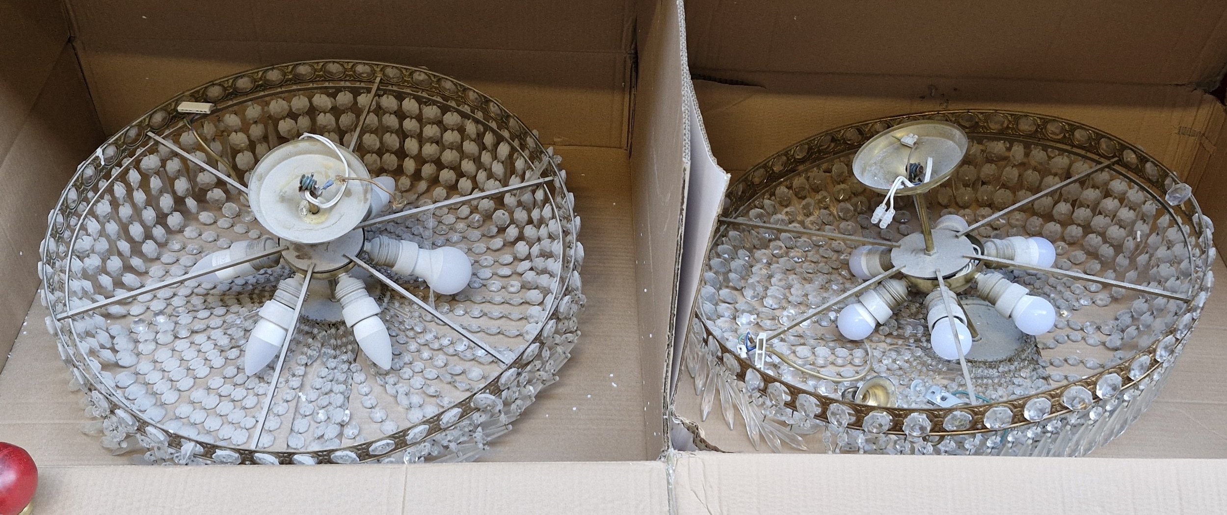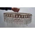 Star lot : Two elaborate very large (2 feet wide) brass and cut glass hanging ceiling pendant light chandeliers. Adorned with a plethora of cut glass prisms. Dimensions - 60CM Diametre.