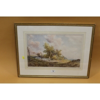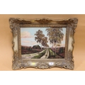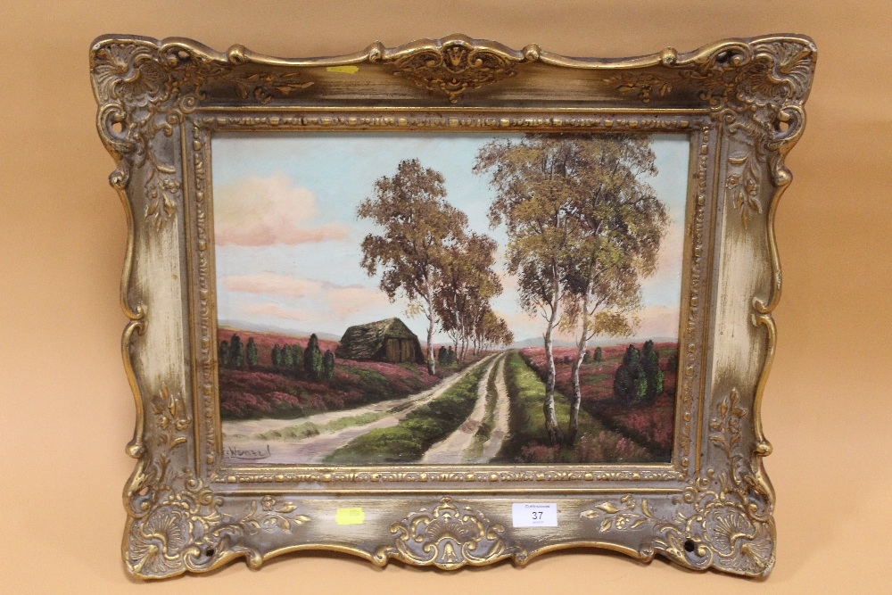 A GILT FRAMED OIL ON BOARD DEPICTING A COUNTRY ROAD SIGNED F WENTEL - OVERALL SIZE 55CM X 45CM