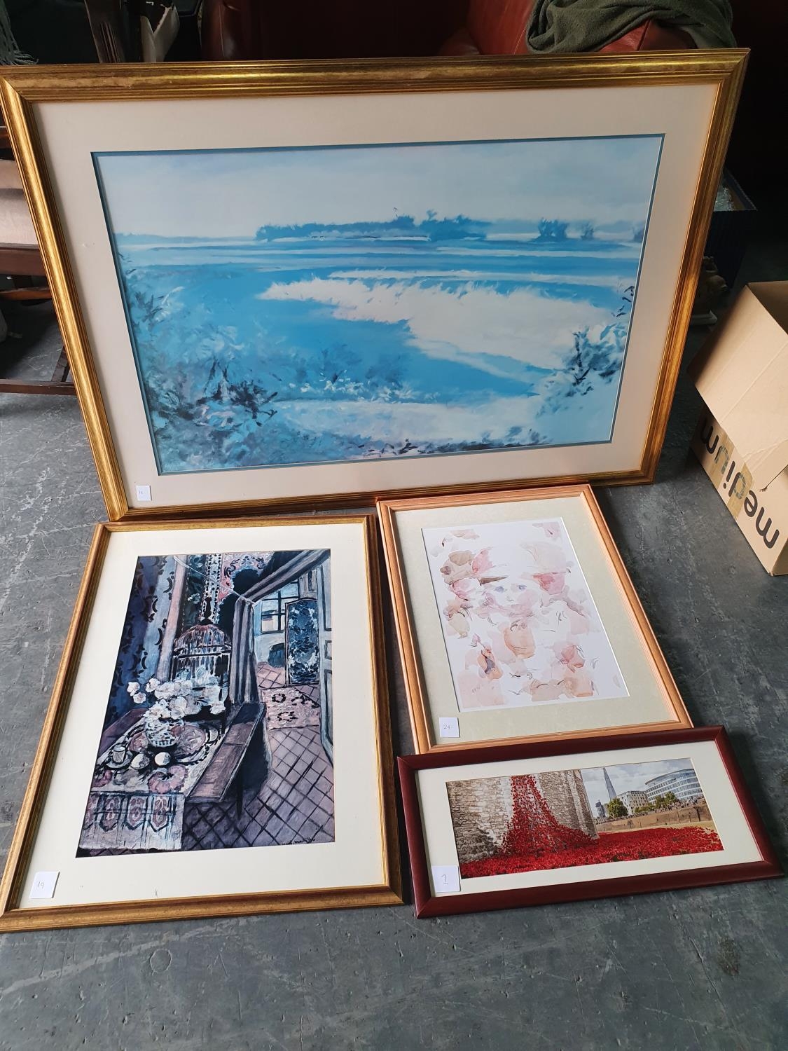 David WILD (Burnley 1931-2014) print of faces together with a Matisse print, a poppies at the Tower of London print and another large blue print (4), all framed