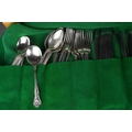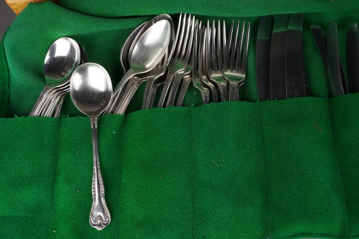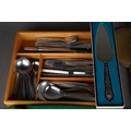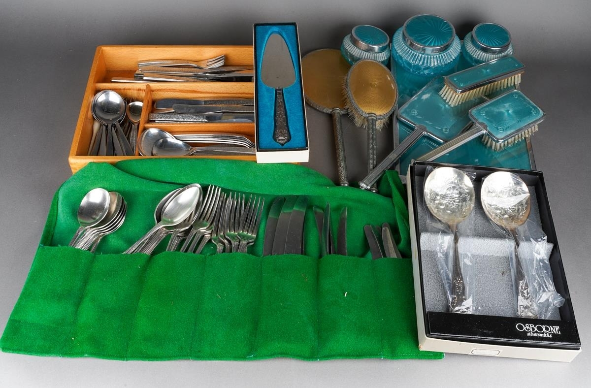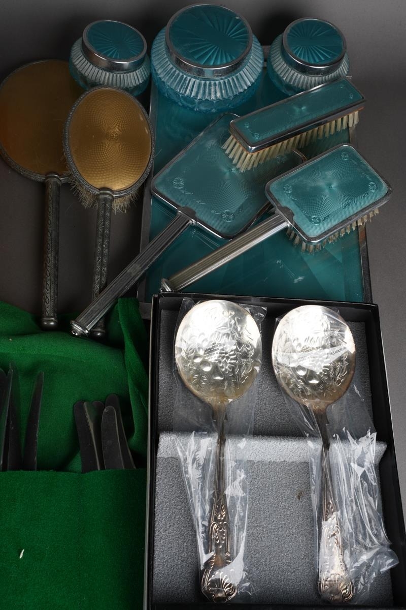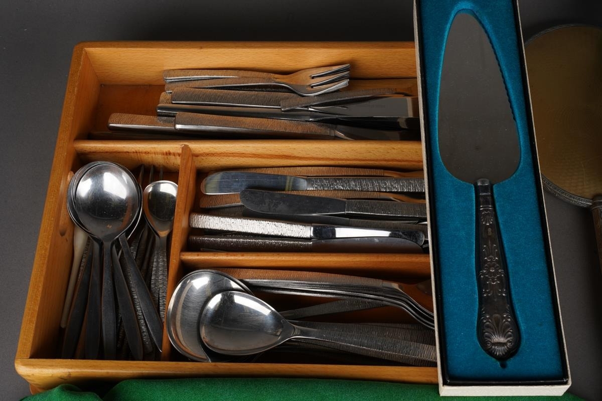 A modern Viners Gerald Benney part canteen of stainless steel cutlery, boxed silver plated serving spoons, assorted dressing table sets, a boxed sterling silver handles cake slice, etc (1 box)