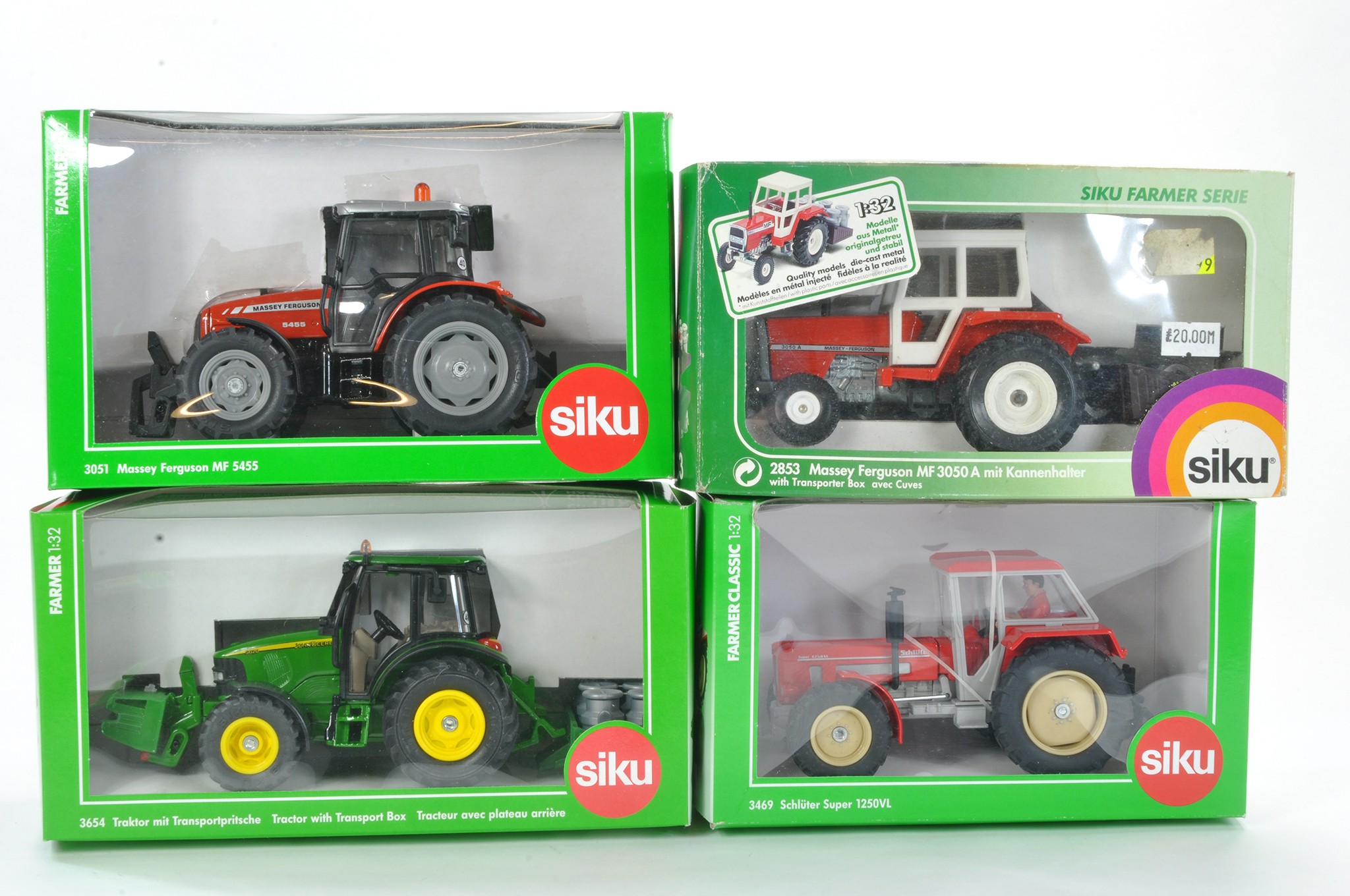 Siku 1/32 Model Farm Issues comprising Four Boxed Tractors including John Deere, Schluter and Massey Ferguson x 2. All look to have not been removed from boxes, hence excellent, some boxes with minor storage wear.