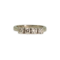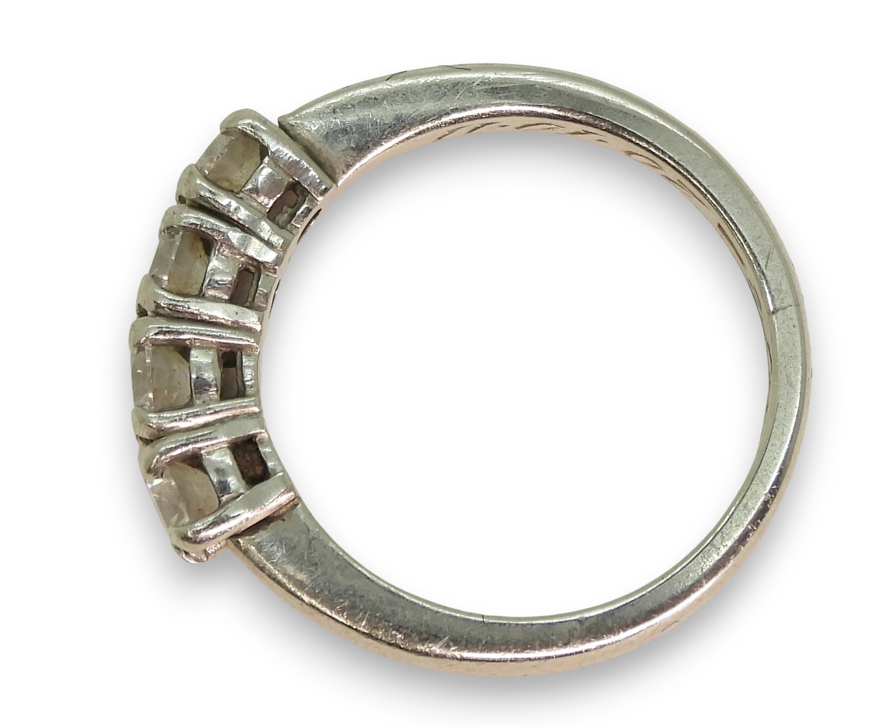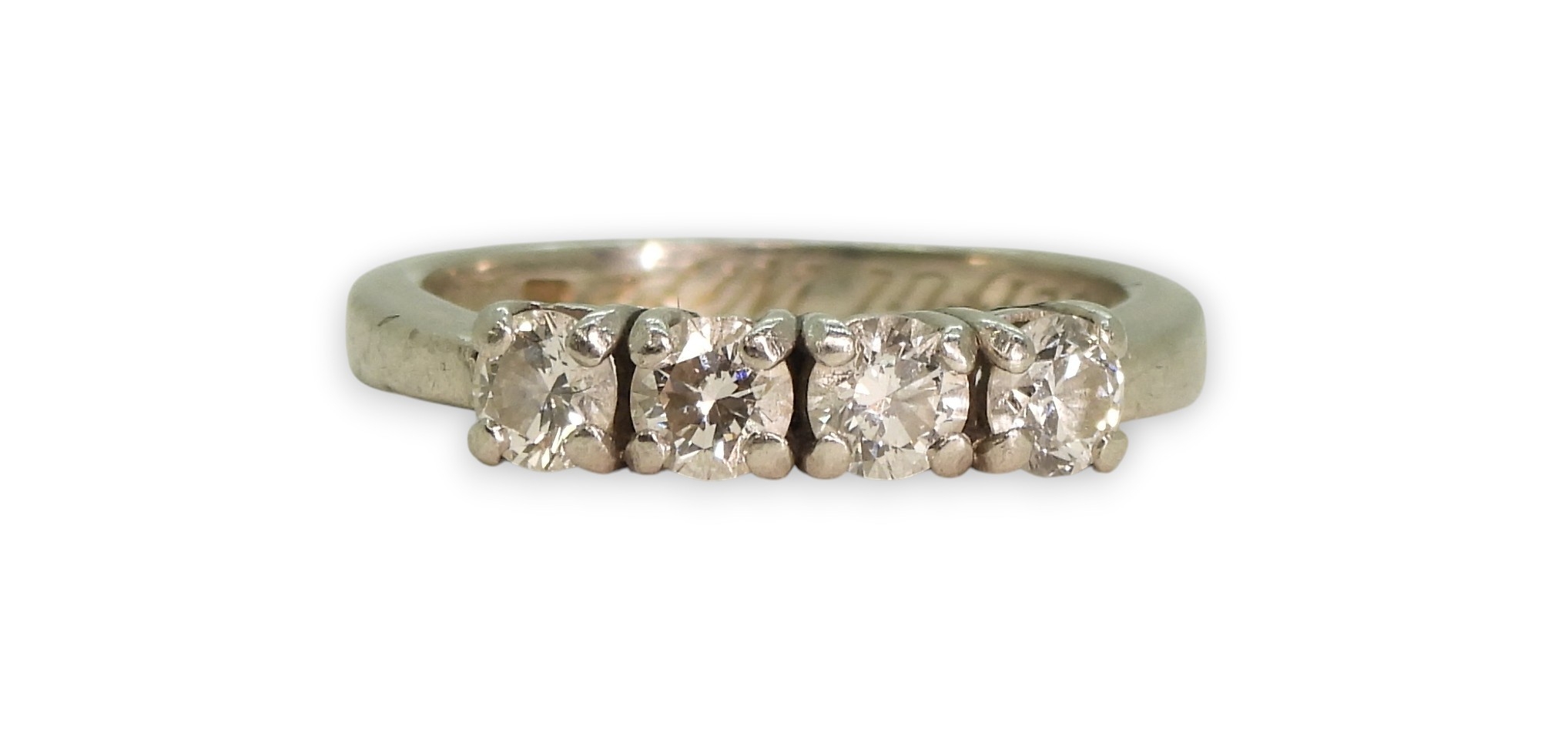 A bright white heavy metal (un-hallmarked platinum) four stone diamond ring, set with estimated approx 0.60cts of brilliant cut diamonds, finger size L, weight 5.4gms