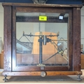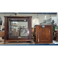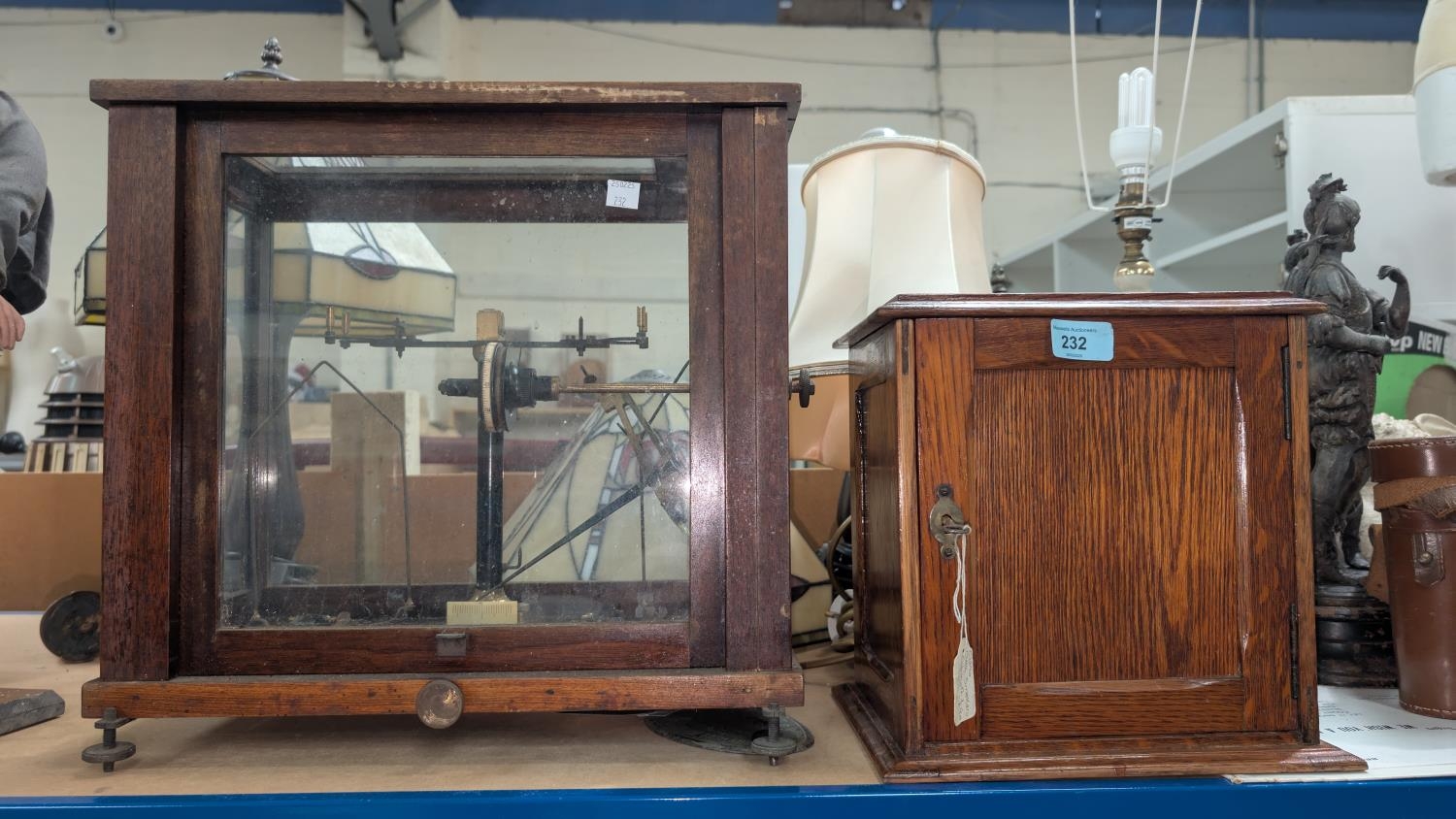 An oak-cased single door smoker's cabinet with ceramic tobacco jar; a pair of laboratory scales in mahogany cabinet.