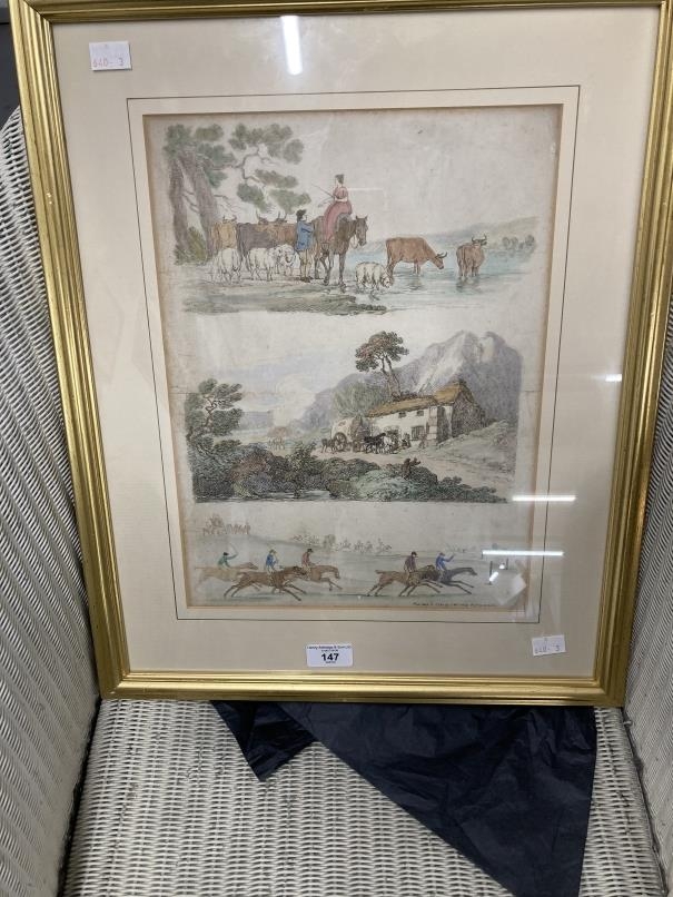 18th cent. Engraving of pastoral scenes and horse racing. Published August 6th 1790 by J.N. Fores, Piccadilly, framed and glazed. With 1989 sales invoice. 14½ins. x 11ins.