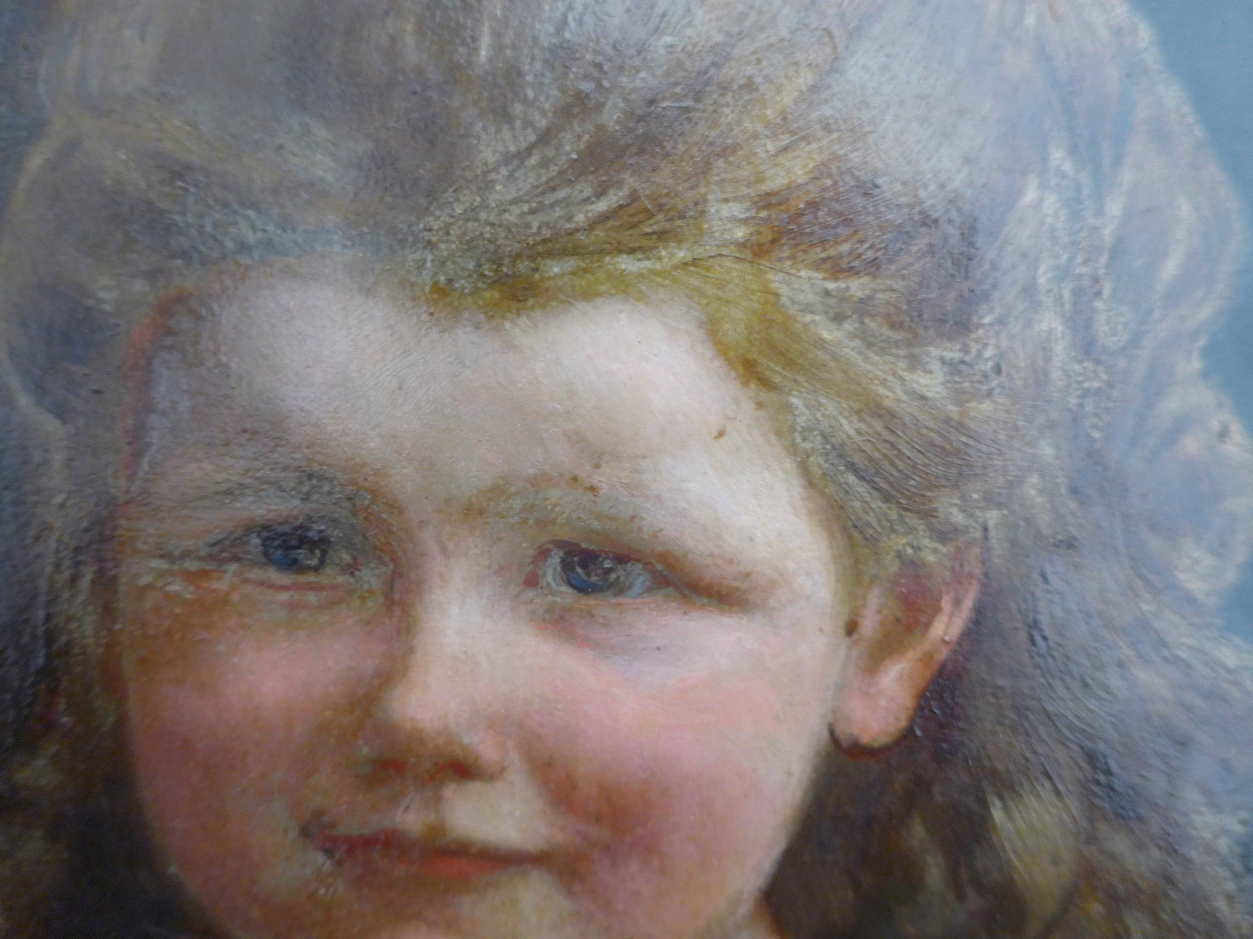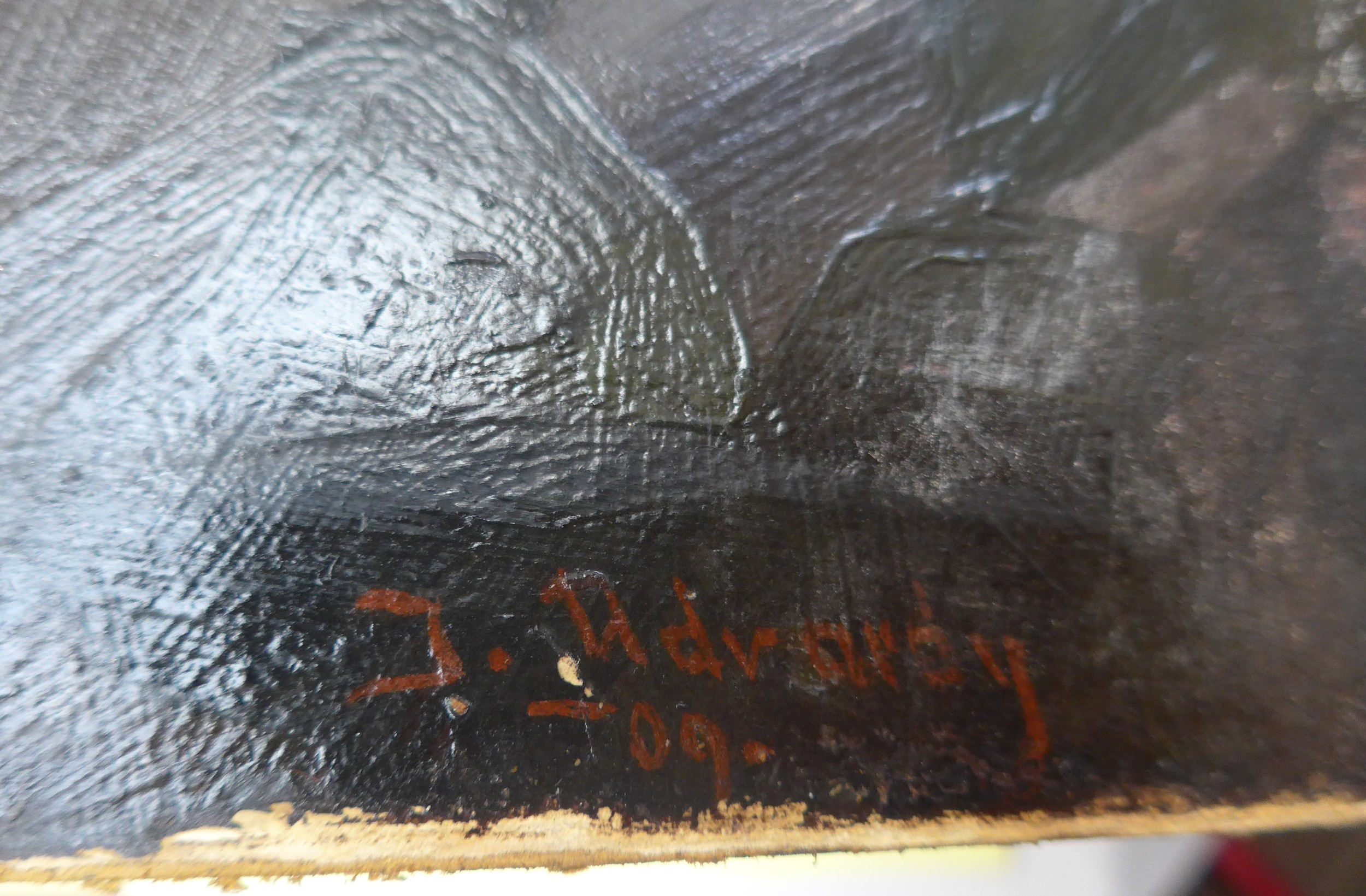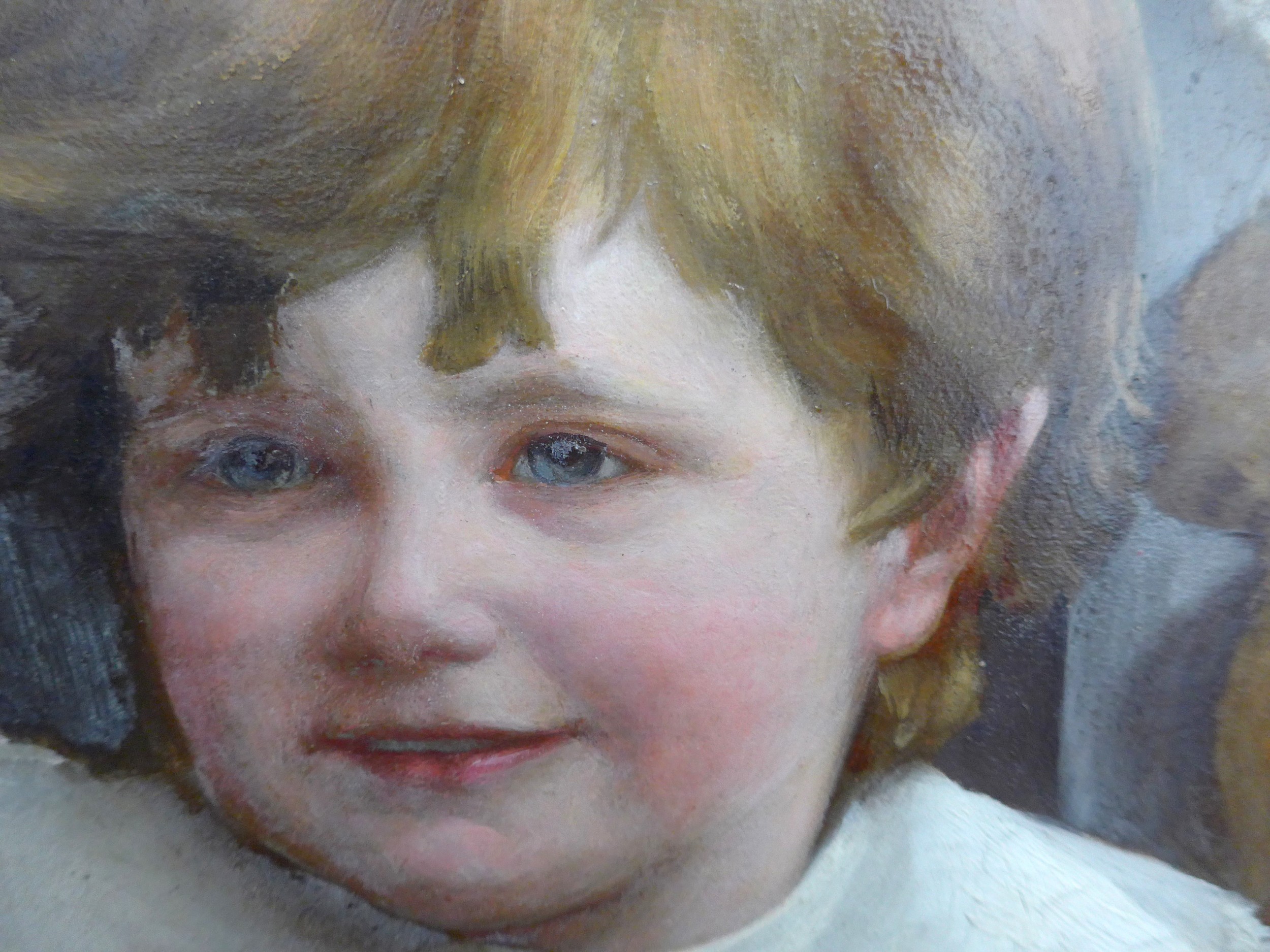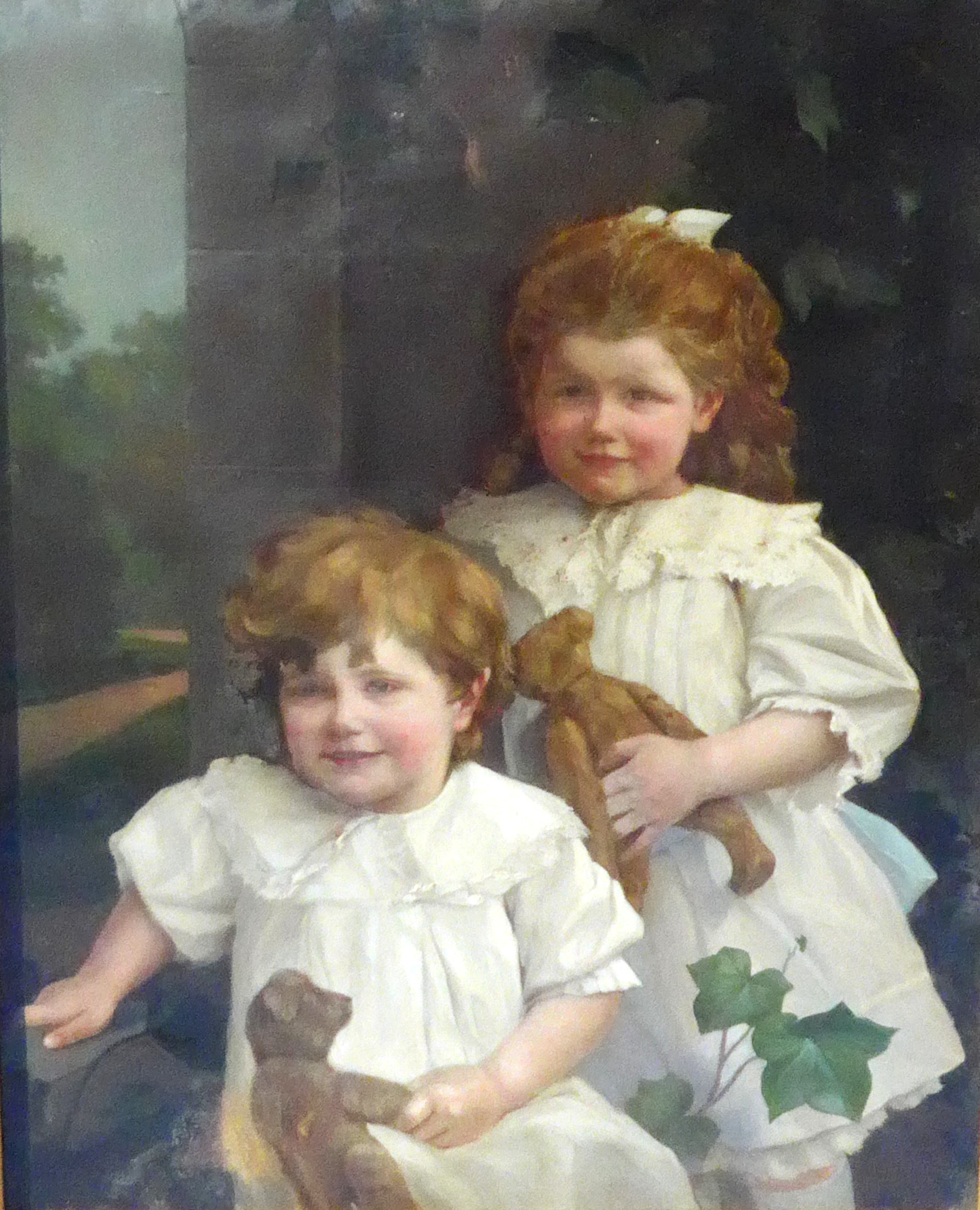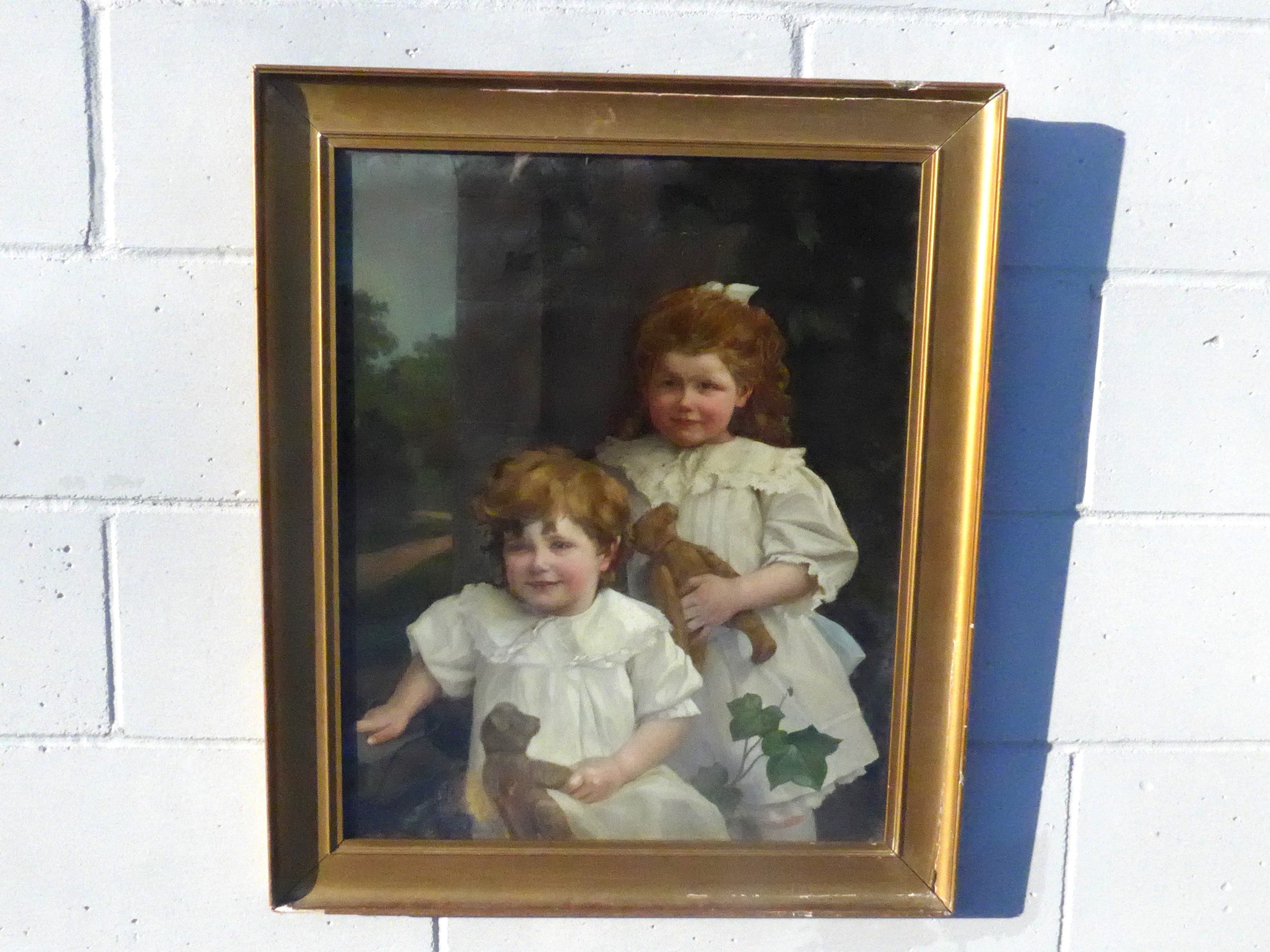 An early 20th Century oil on card board of two children dressed in white linen, holding Teddy Bears. Indistinctly signed bottom left 'J. Udvardy'? and dated '09. Set in a gilt frame (a/f) and glazed. Image size 63cm x 51cm