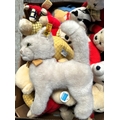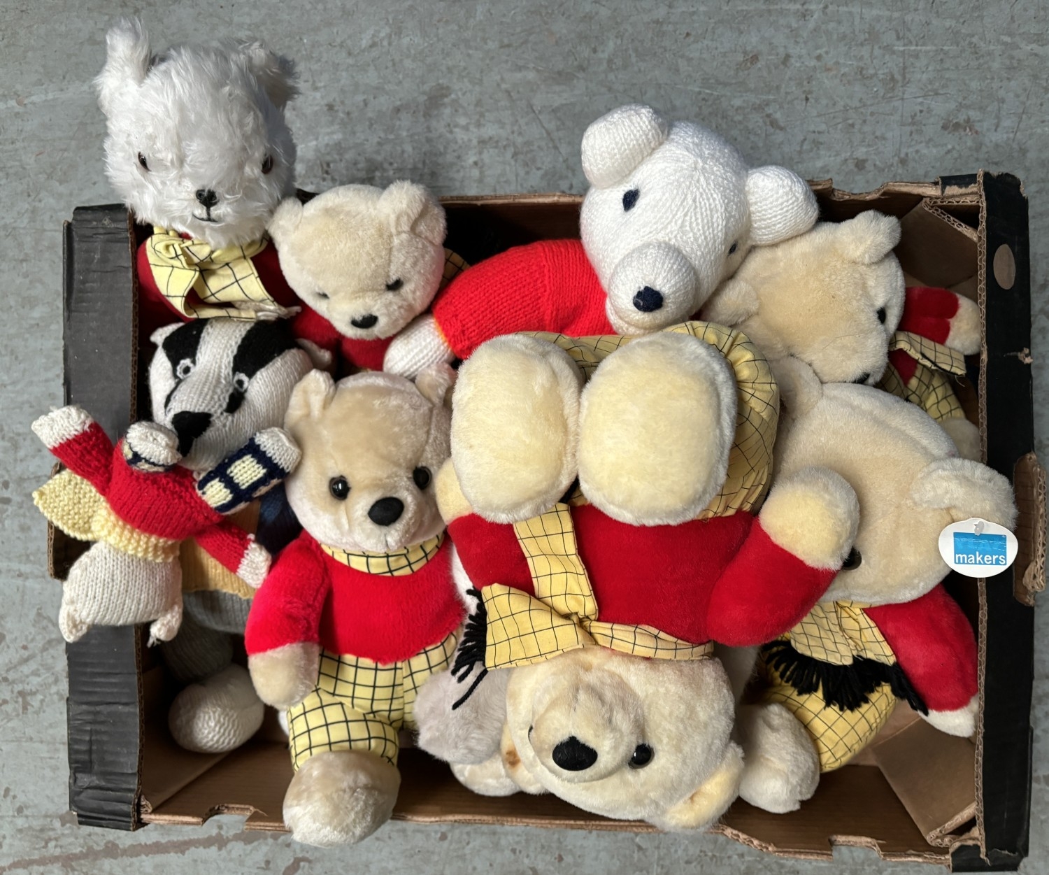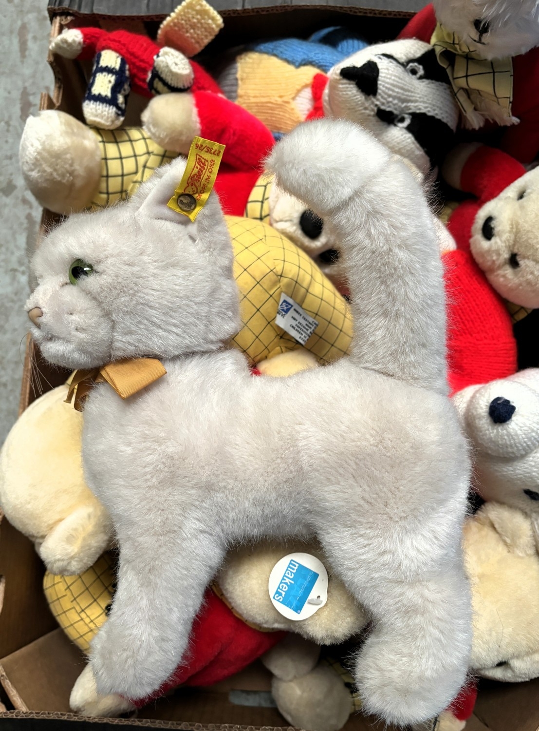 A vintage Steiff cat with label to ear and a selection of Rupert Bears.