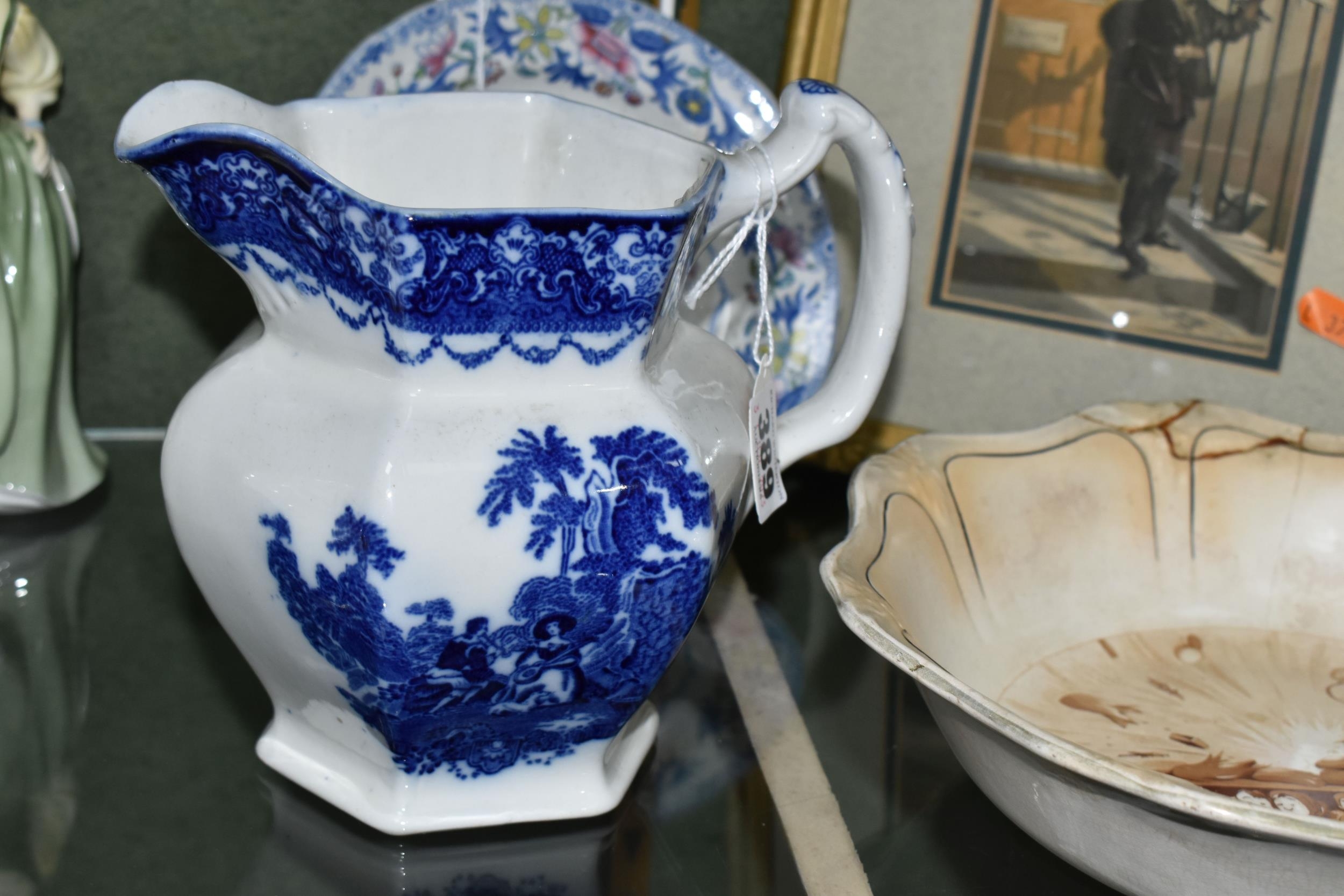 A GROUP OF CERAMICS AND FRAMED PRINT, comprising a late 19th century blue and white Watteau jug, backstamp New Wharf Pottery Co. a Spode, a framed Victorian Baxter print of a young chimney sweep in the snow, a small Spode plate backstamp Copeland & Garrett, pattern number 2886, diameter 18cm, together with a Bainsfather Ware 'Old Bill' First World war souvenir dish 'Where Did That One Go To?' (broken and reglued edge, hairline cracks and crazing) (4) (Condition report: plate has scratches and stains, picture has chips to the gilt frame, other obvious damage mentioned in description)