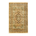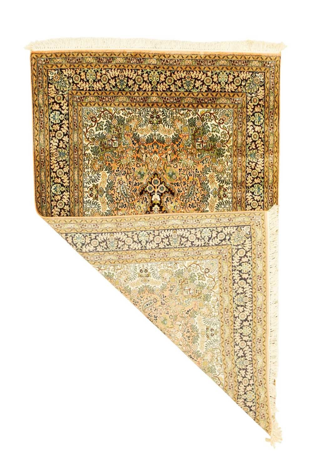 A Persian silk rug. Pink ground, all over foliate design, within blue foliate borders, 193cm x 120cm.