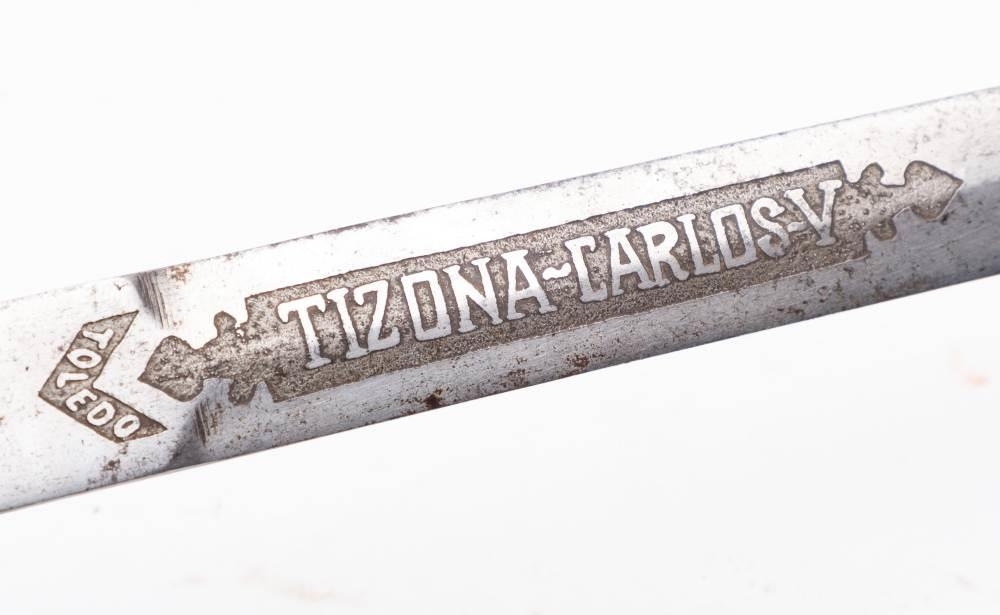 A Spanish cup-hilt rapier: with 89.5cm blade etched, Tizona - Carlos-V, with steel bowl and wire bound grip.