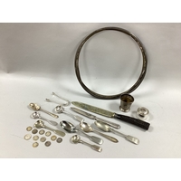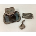 A Hallmarked Silver Vesta Case, of allover foliate design, with initialled circular cartouche; an Elkington Plate table vesta / ashtray, with ribbon and reed border, initialled "J.E."; a XIX Century pewter snuff box. (3)
