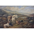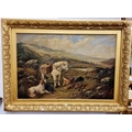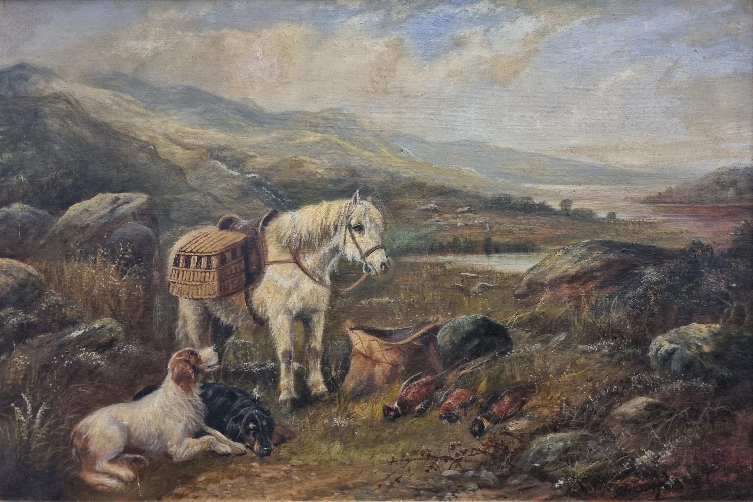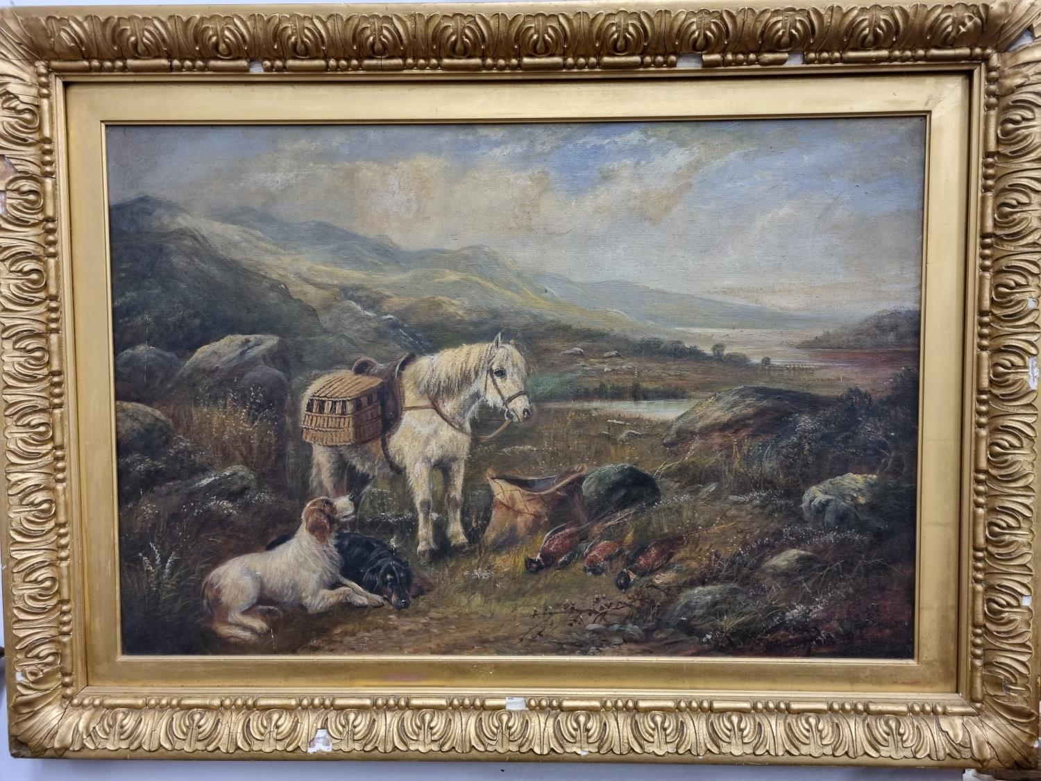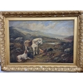 Robert Cleminson. A 19th Century Oil on Canvas of a hunting scene with two retrievers sitting and a pony. In a good original gilt frame. 51 x 76 cm approx.